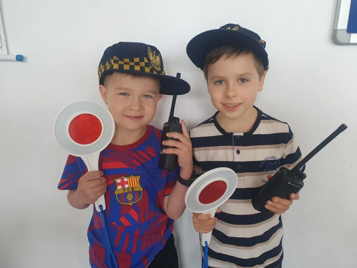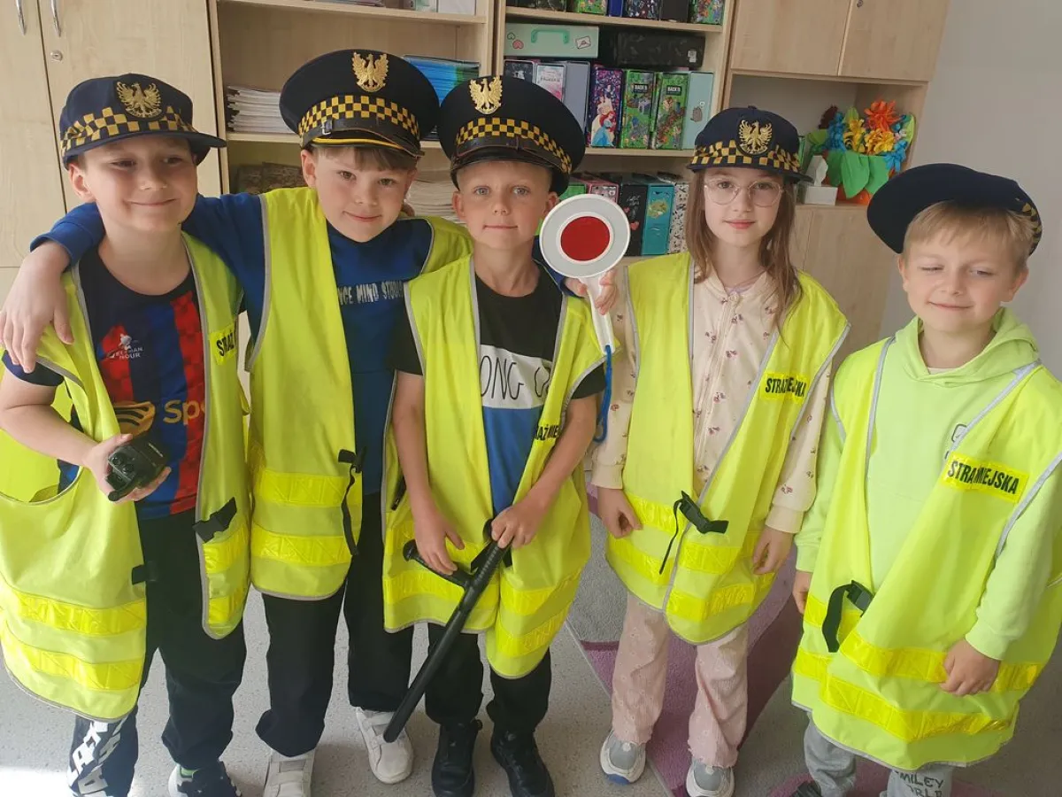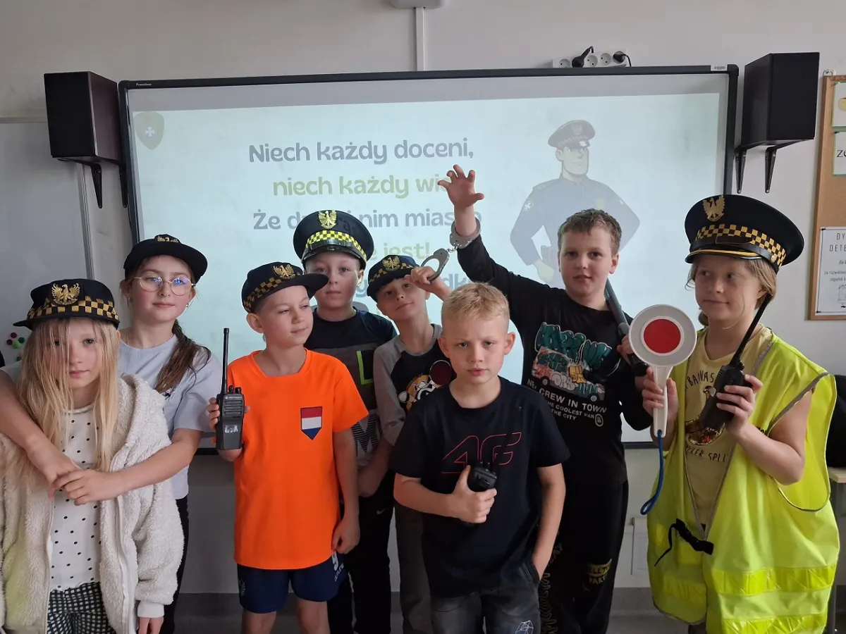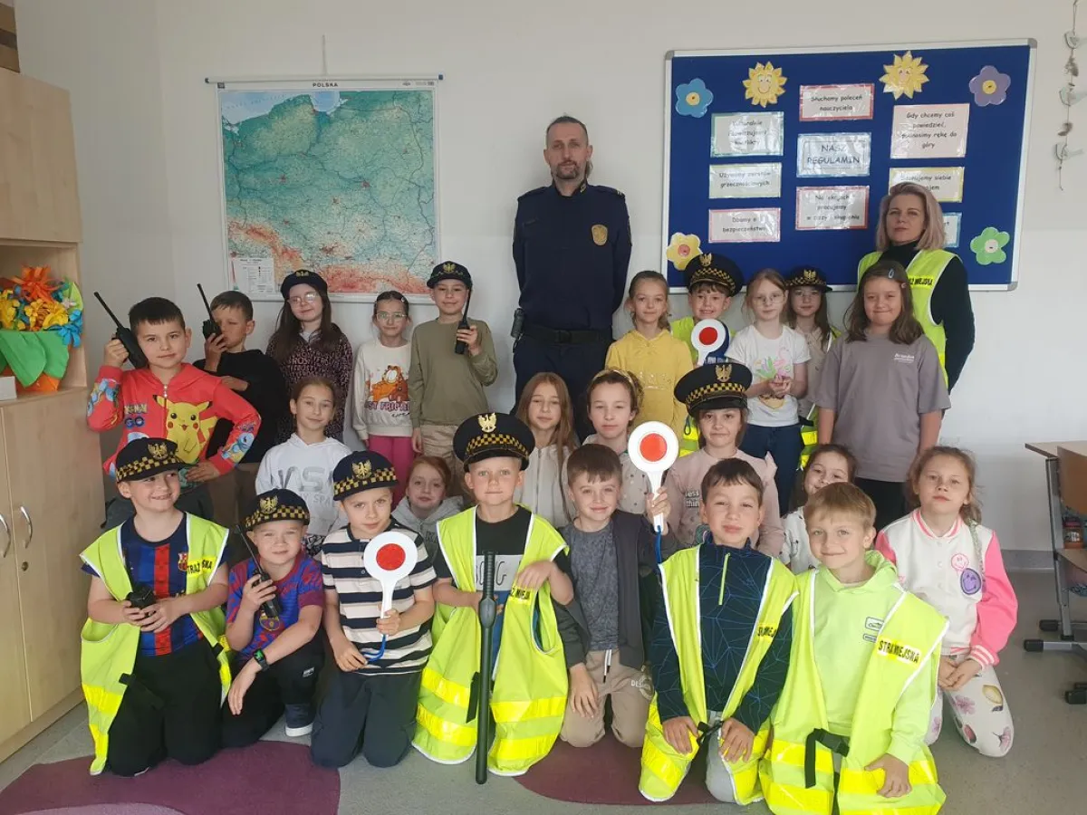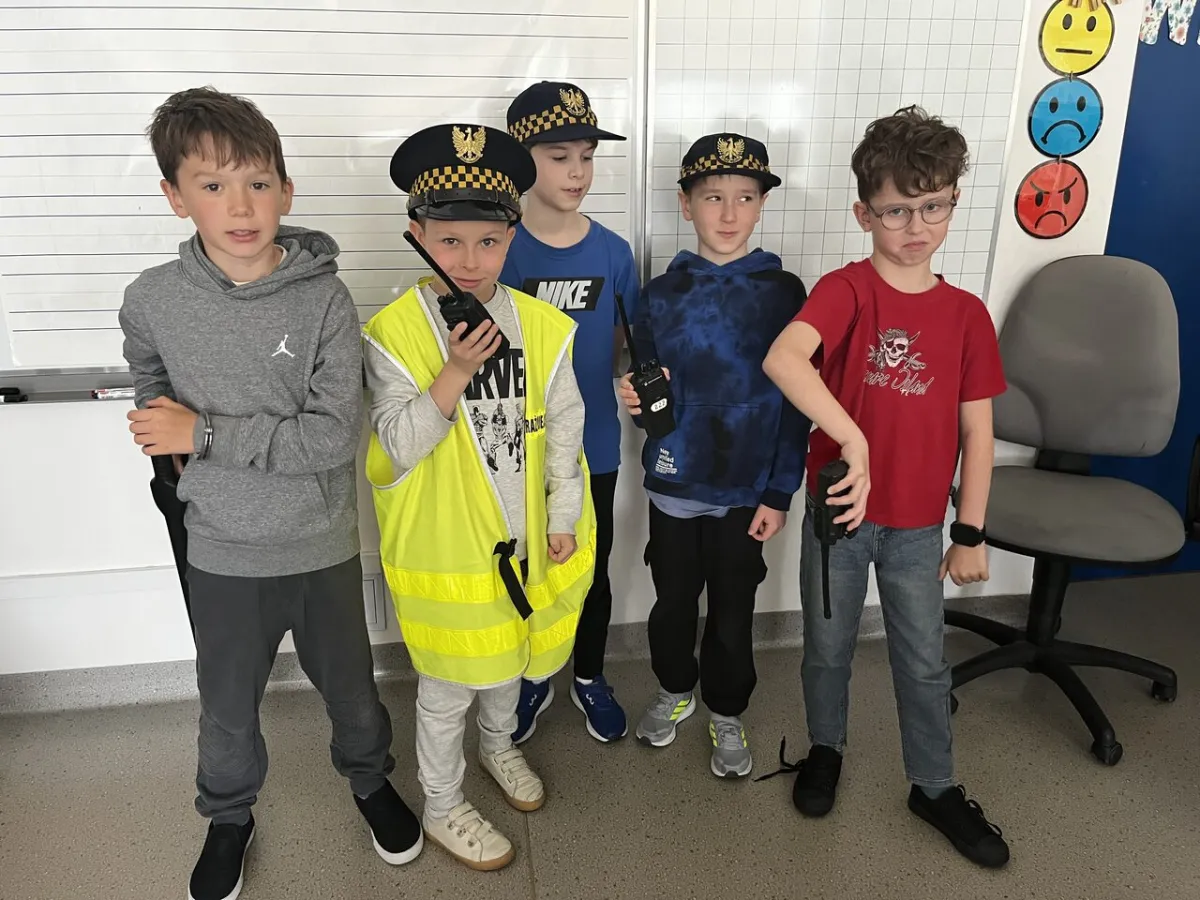 Następnie funkcjonariusze przeprowadzili krótką pogadankę na temat bezpiecznego poruszania się po drogach. Przypomnieli jak prawidłowo przechodzić przez jezdnię, jak ważne jest noszenie odblasków oraz jak zachowywać się w kontaktach z nieznajomymi. Na zakończenie funkcjonariusze zaprezentowali umundurowanie oraz sprzęt, z którego korzystają w pracy. Dzieci z radością je oglądały i przymierzały. Wizyta strażników miejskich była bardzo ciekawa i pouczająca. Uczniowie dowiedzieli się wielu ważnych rzeczy na temat bezpieczeństwa i zrozumieli, że strażnik miejski to osoba, która pomaga i dba o porządek w naszym otoczeniu. Spotkanie na długo zostanie w pamięci naszych uczniów.