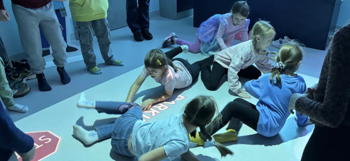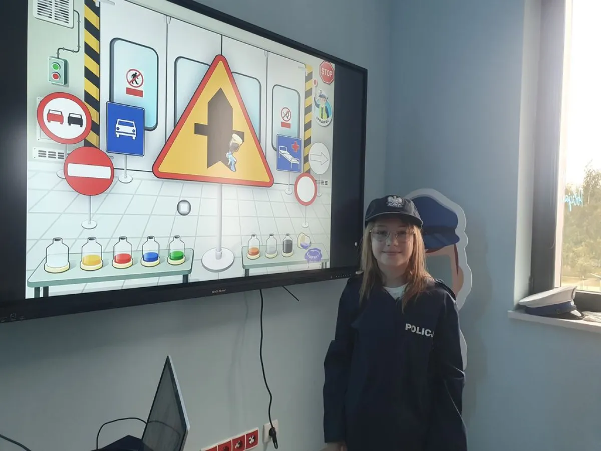Na koniec uczestnicy warsztatów mogli skorzystać z gier i zabaw z użyciem podłogi interaktywnej Fun Floor oraz tablicy multimedialnej z pakietem ,,bezpieczeństwo w ruchu drogowym.