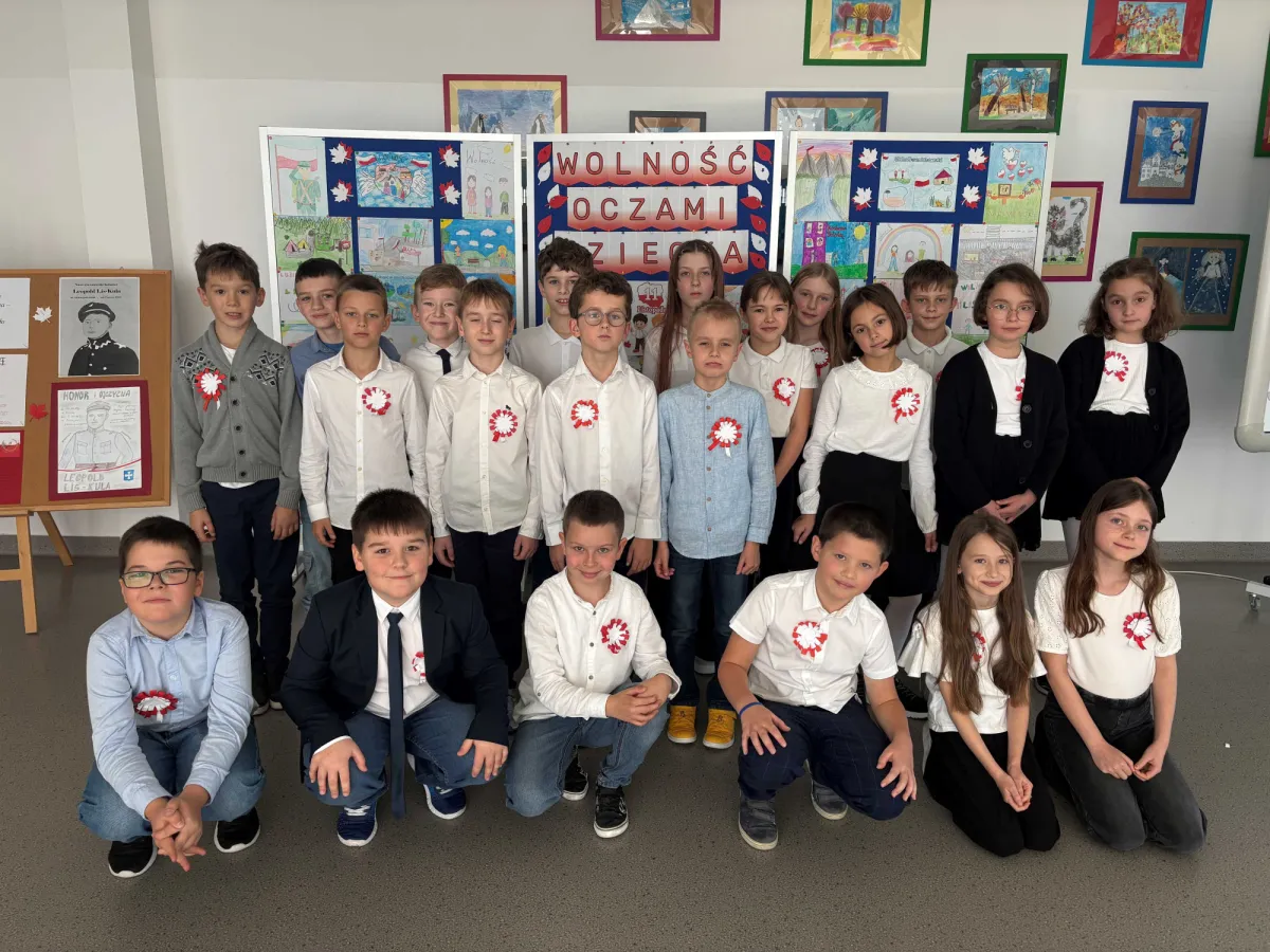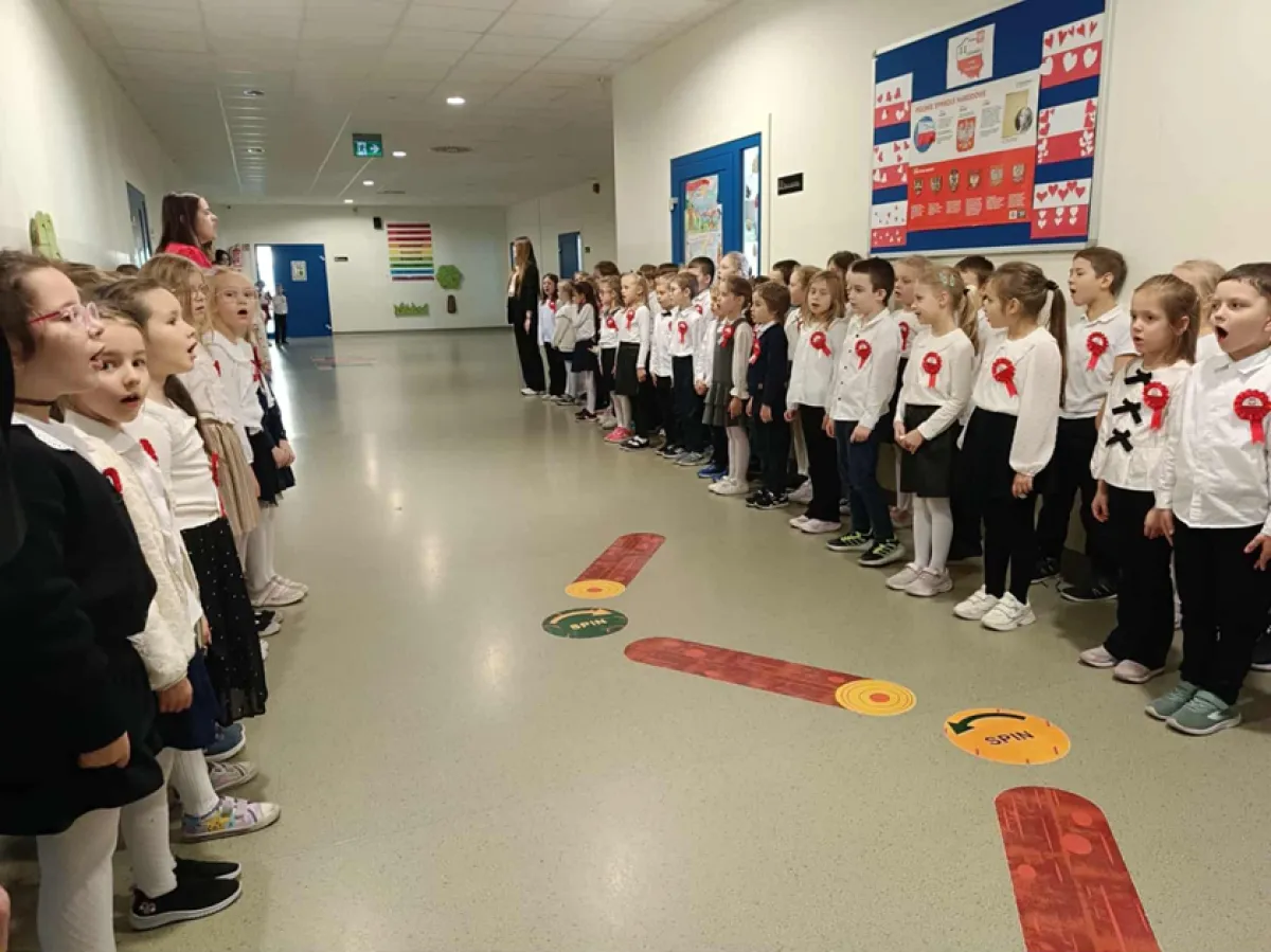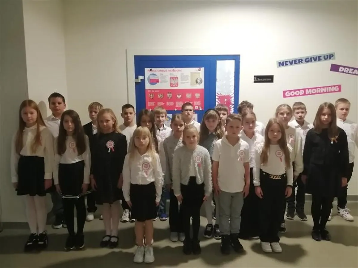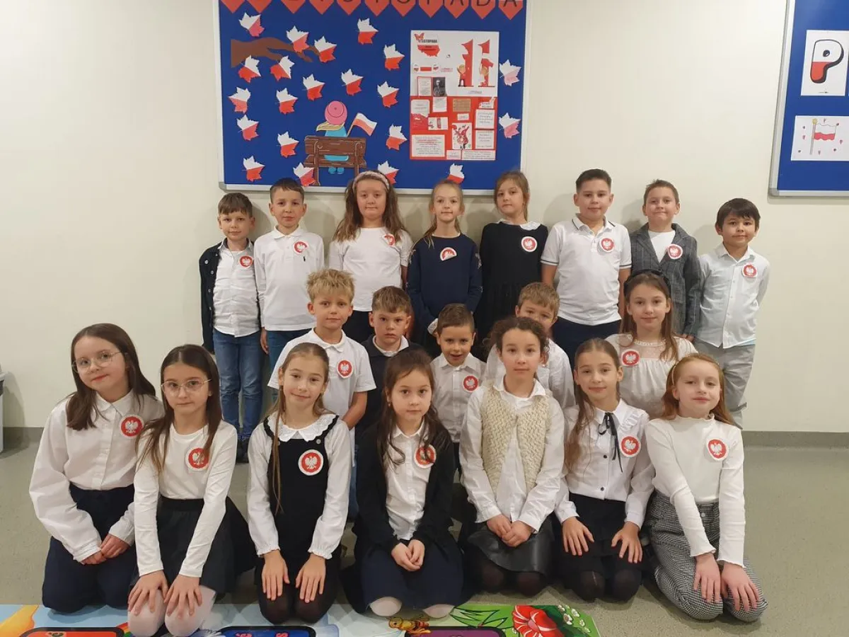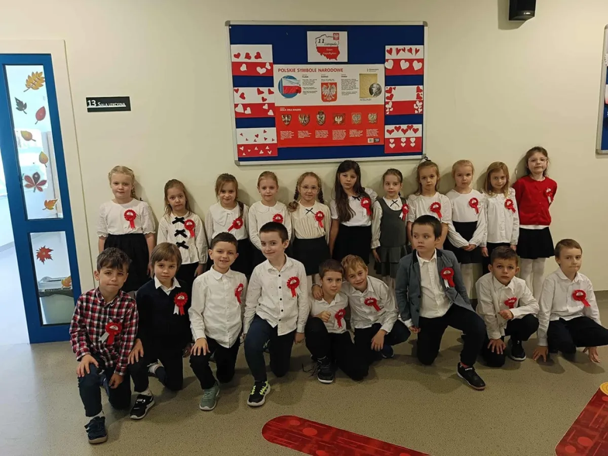 W piątek, 7 listopada, uczniowie klas 1–3 edukacji wczesnoszkolnej wzięli udział w uroczystych obchodach Narodowego Święta Niepodległości. Dzień upłynął w atmosferze radości i patriotyzmu. Uczniowie dumnie prezentowali biało-czerwone kotyliony przypięte do galowych strojów. W klasach odbyły się zajęcia poświęcone historii odzyskania przez Polskę niepodległości – uczniowie poznawali symbole narodowe, rozmawiali o znaczeniu wolności i bohaterstwie naszych przodków. O godzinie 11:11 cała społeczność szkolna włączyła się we wspólne odśpiewanie hymnu narodowego, uczestnicząc w akcji „Szkoła do hymnu”. Był to wyjątkowy moment jedności. W ramach zajęć plastycznych uczniowie wykonali prace pod hasłem „Wolność oczami Dziecka”. Dzieła uczniów zostały zaprezentowane na wystawie szkolnym holu, tworząc piękną galerię, która przypomina o wartościach, jakie niesie ze sobą niepodległość. To wyjątkowe wydarzenie było piękną lekcją historii, patriotyzmu i wspólnego świętowania w duchu miłości do Ojczyzny.