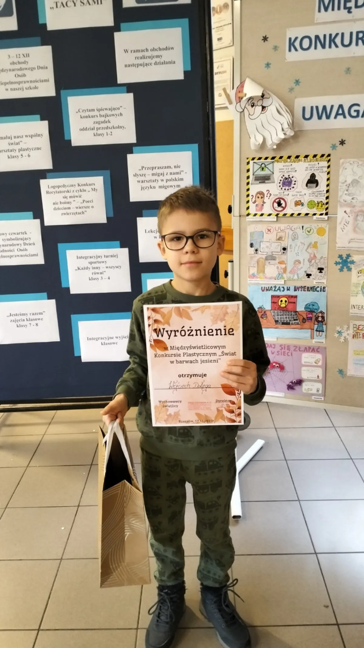 Uczeń z klasy 2a, Wojciech Dołęga, otrzymał wyróżnienie w międzyświetlicowym konkursie plastycznym „Świat w barwach jesieni”. Konkurs zorganizowała Szkoła Podstawowa nr 17 z Oddziałami Integracyjnymi w Rzeszowie.