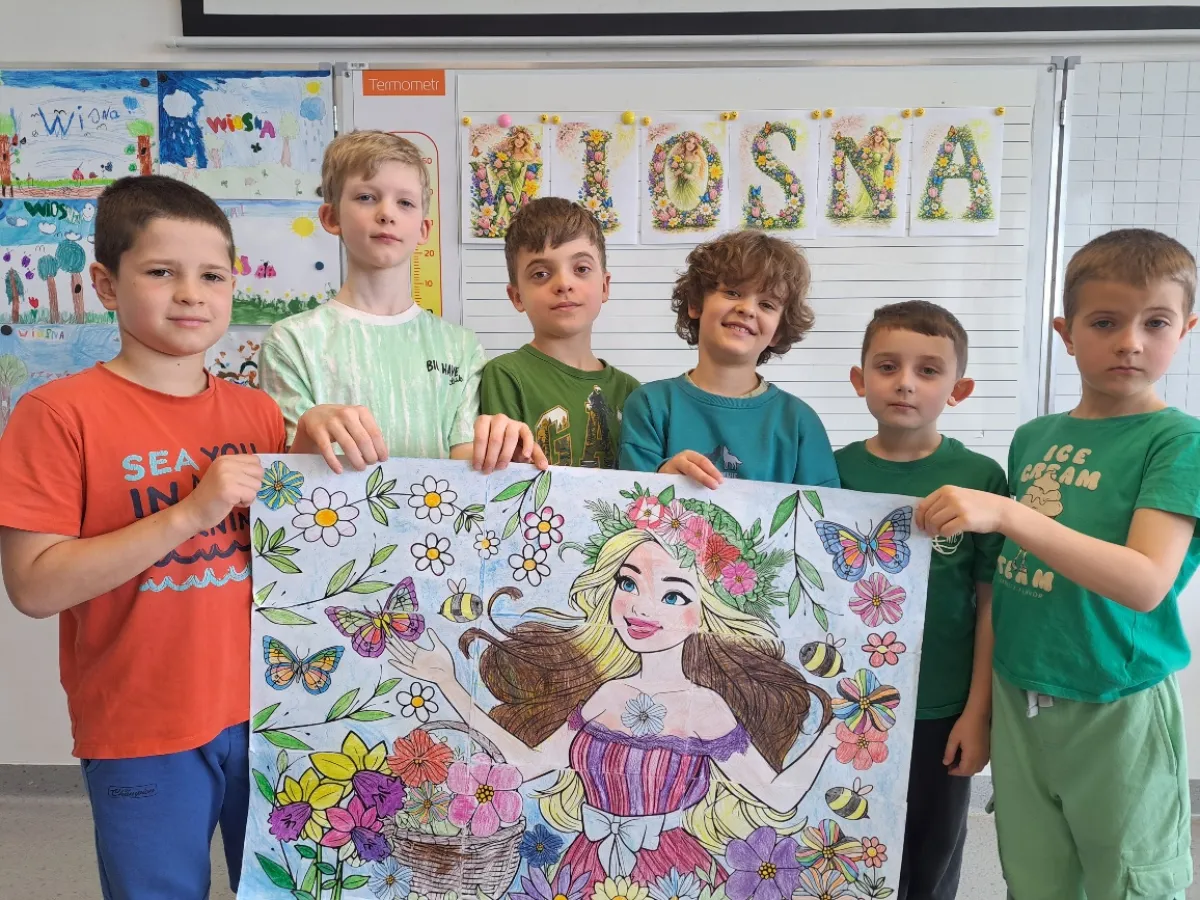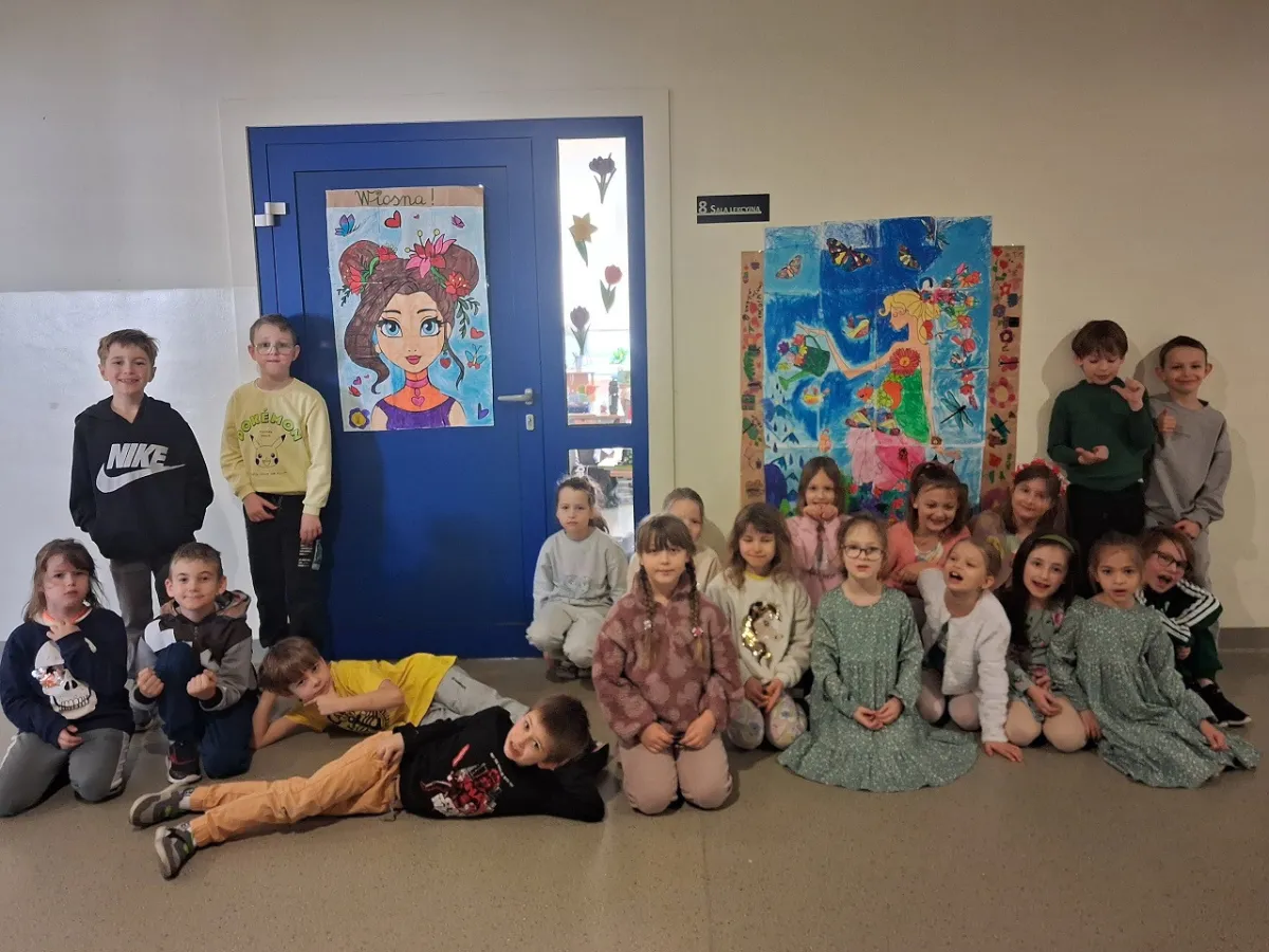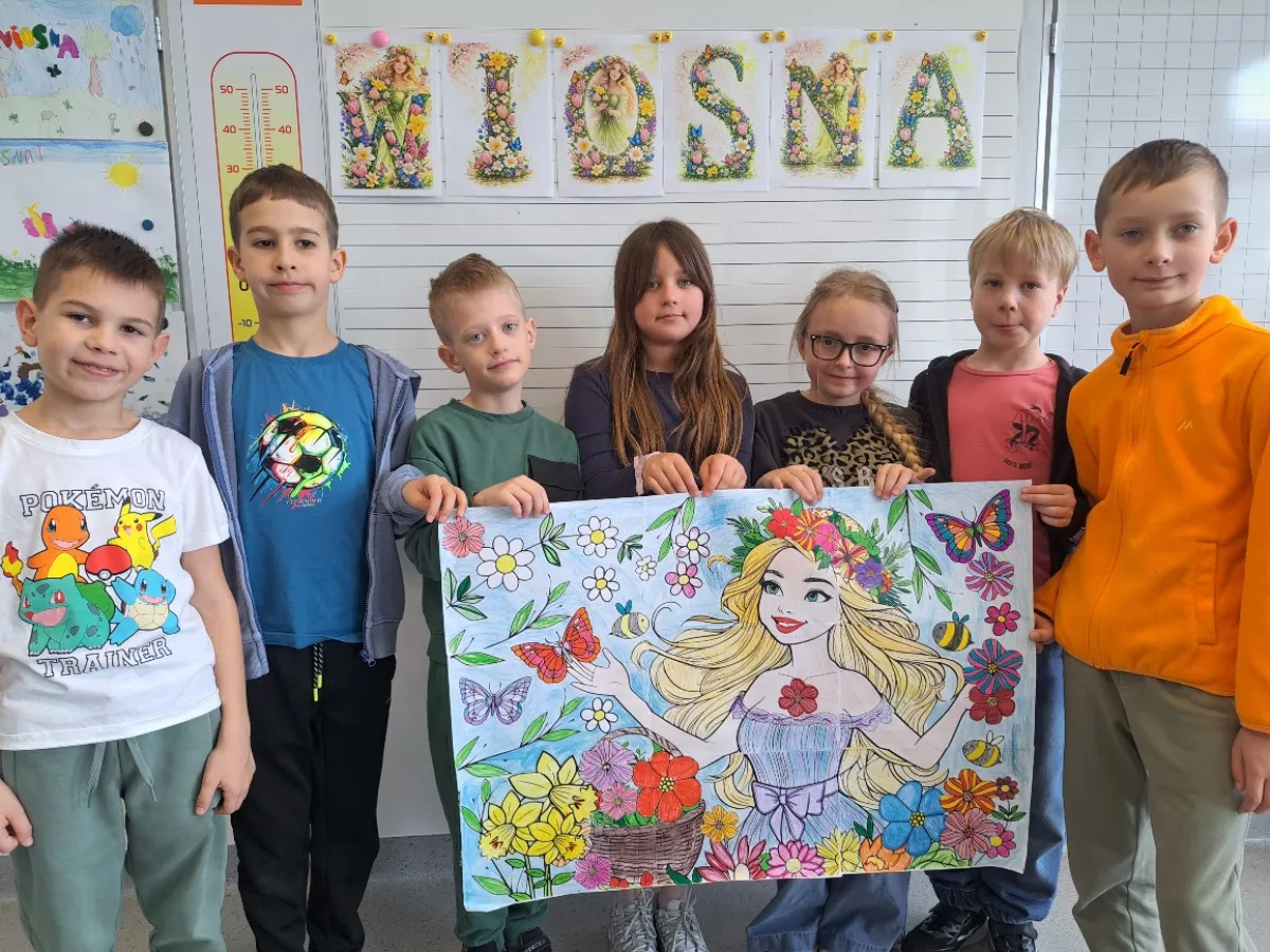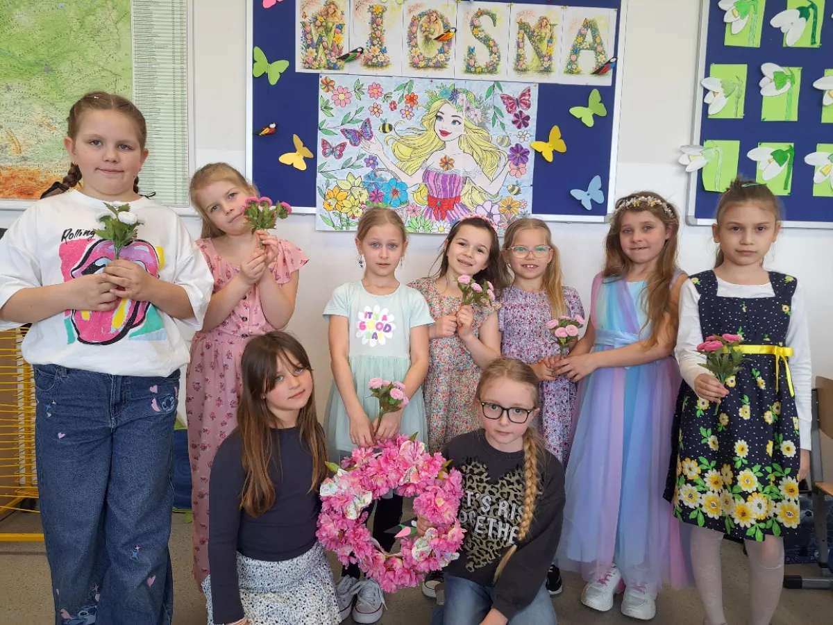 Dnia 20 marca uczniowie klas 1–3 radośnie powitali długo wyczekiwaną wiosnę. Każda klasa przygotowała piękne wiosenne dekoracje – plakaty, wianki oraz kolorowanki XXL przedstawiające Panią Wiosnę. Prace te ozdobiły drzwi sal lekcyjnych, wprowadzając wszystkich w radosny, wiosenny nastrój. Uczniowie przyszli do szkoły ubrani w wiosennym stylu – dominowały barwne stroje oraz dodatki nawiązujące do tej pory roku, takie jak kwiaty, motyle czy promienie słońca. Dzięki temu szkolne korytarze rozkwitły feerią kolorów. W ramach obchodów odbył się również klasowy pokaz „wiosennej mody”, podczas którego dzieci z dumą prezentowały swoje stroje. Nie zabrakło także spacerów w poszukiwaniu pierwszych oznak wiosny, wspólnych tańców przy wiosennych piosenkach oraz oglądania edukacyjnych filmików o tej pięknej porze roku.