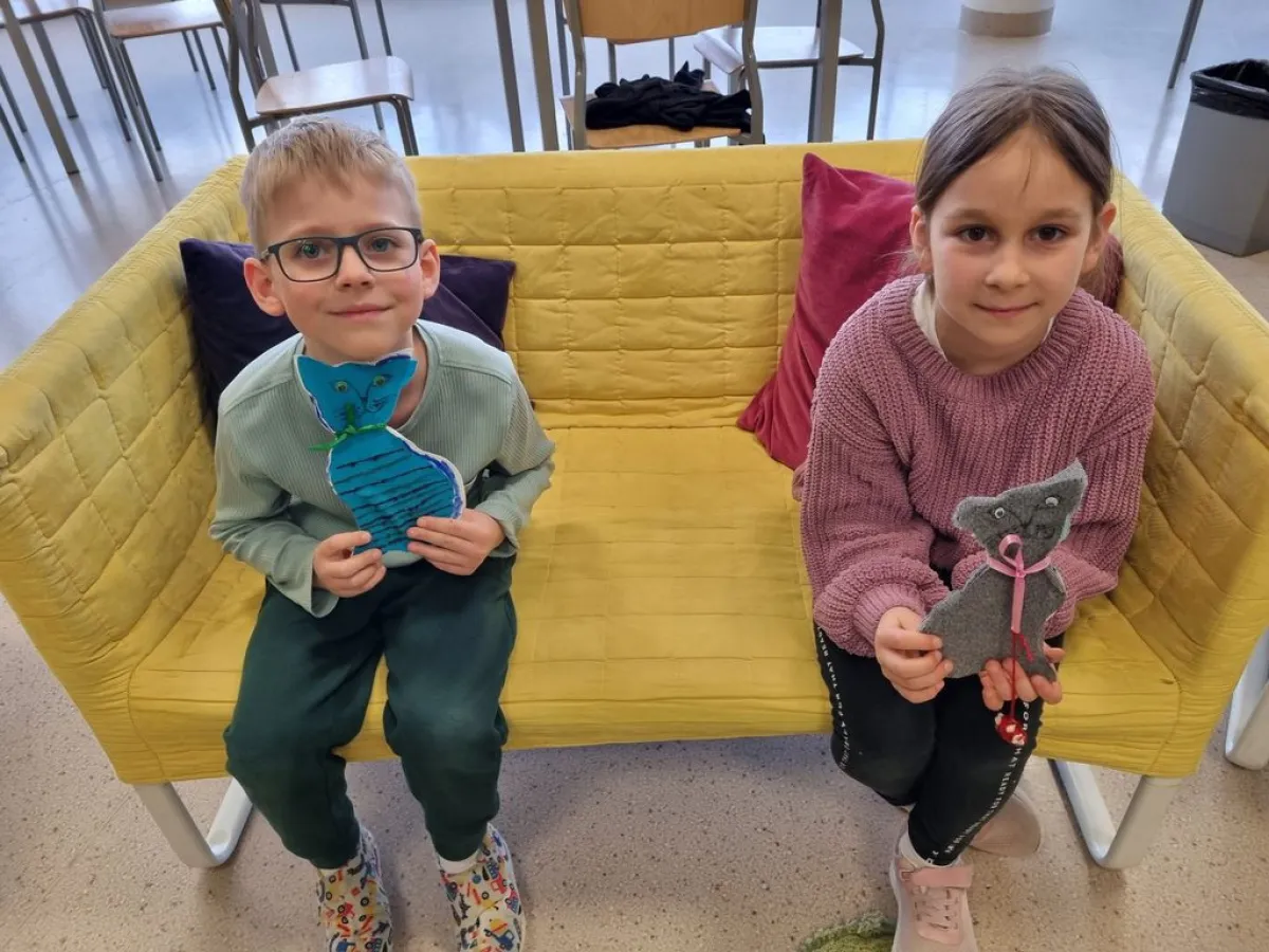 W drugiej części zajęć uczniowie sami tworzyli własne koty z tektury, tkanin i tasiemek.