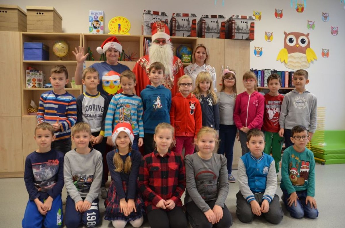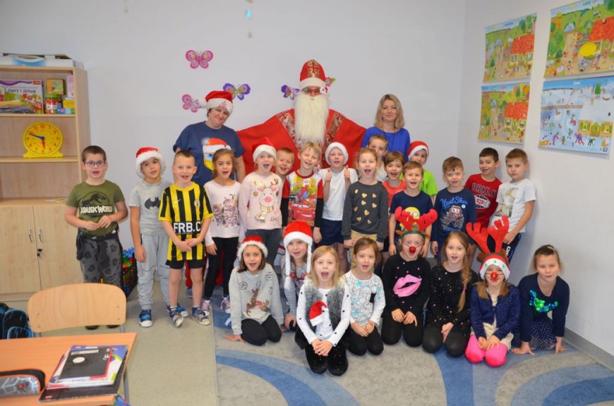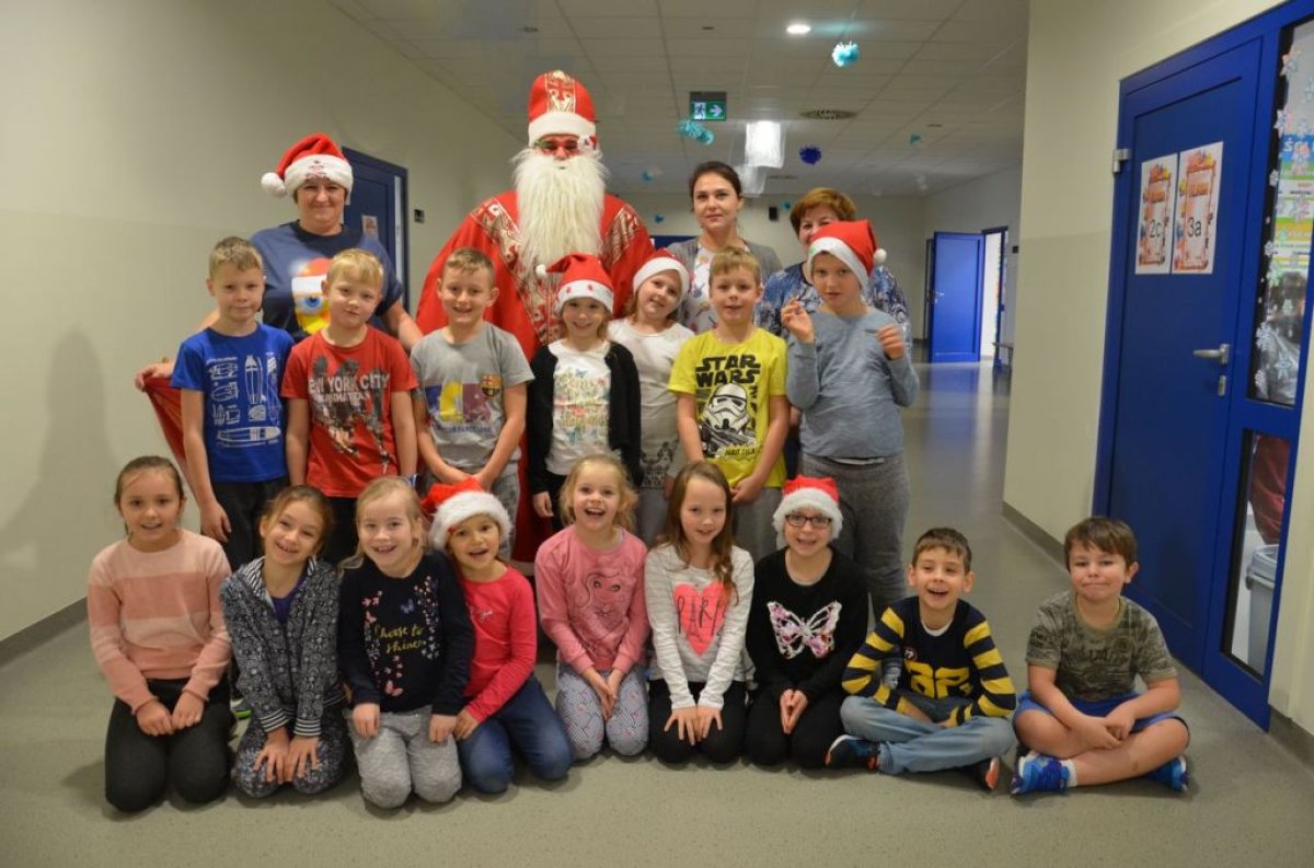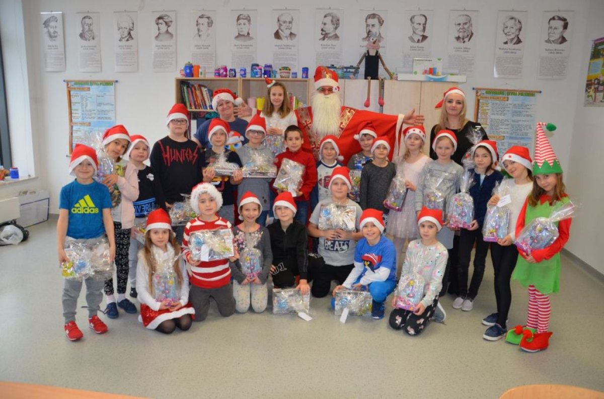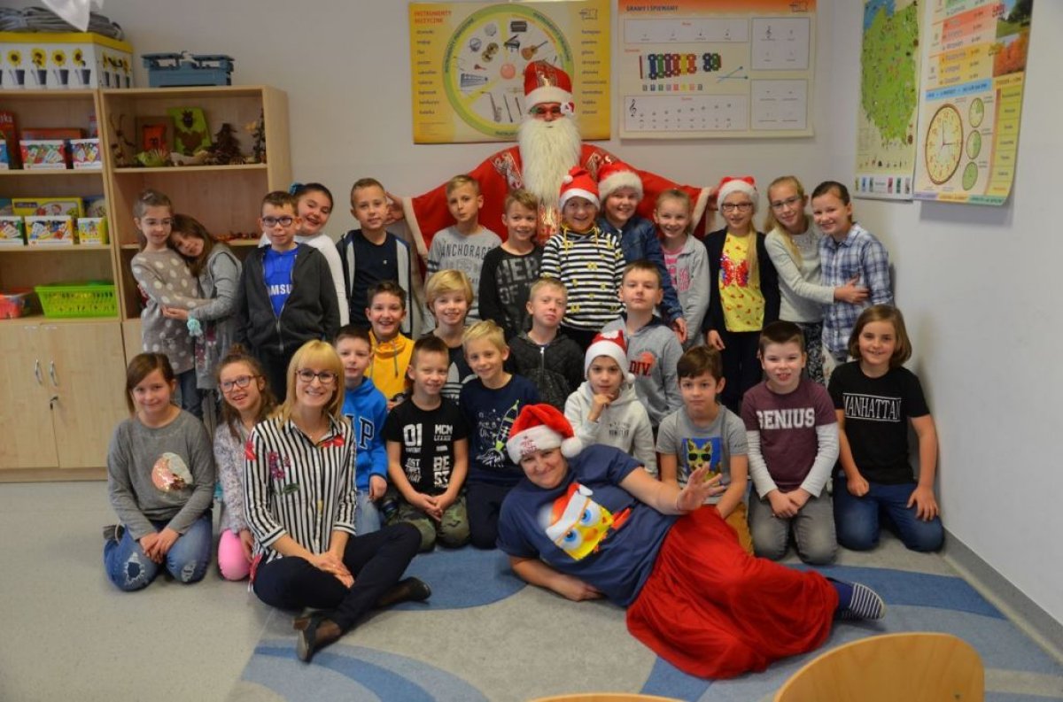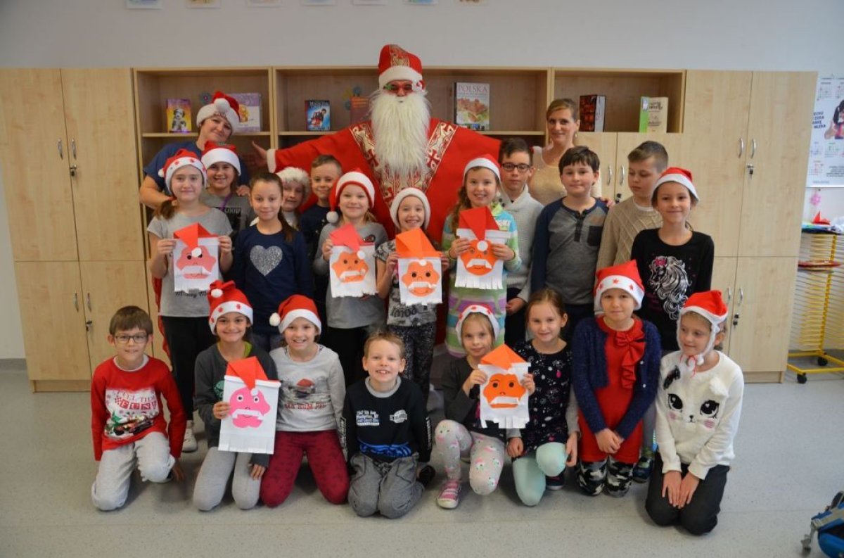 W naszej szkole są same grzeczne dzieci, dlatego 6 grudnia, jak co roku, odwiedził nas bardzo wesoły Święty Mikołaj. Wędrował z klasy do klasy z workiem pełnym pięknych prezentów. Długo oczekiwany gość wywołał uśmiech na twarzach wszystkich uczniów. Mikołaj rozmawiał z dziećmi, wprowadzając wszystkich w radosny świąteczny klimat. Wszystkie dzieci zostały obdarowane prezentami. Uczniowie również przygotowali i wręczyli drobne upominki dla strudzonego Mikołaja. Miło spędzony czas z naszym gościem uświetniły wspólne wesołe zdjęcia.