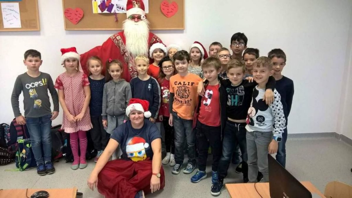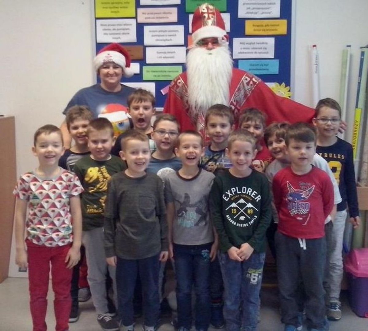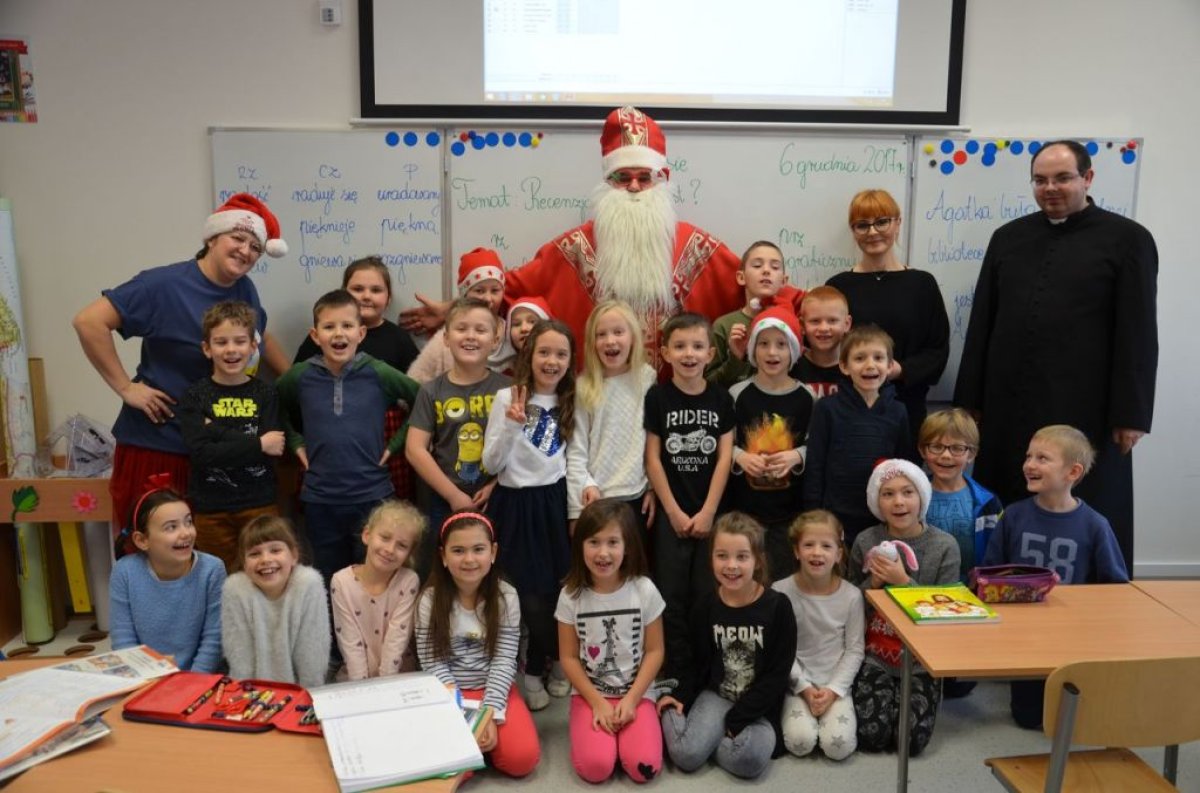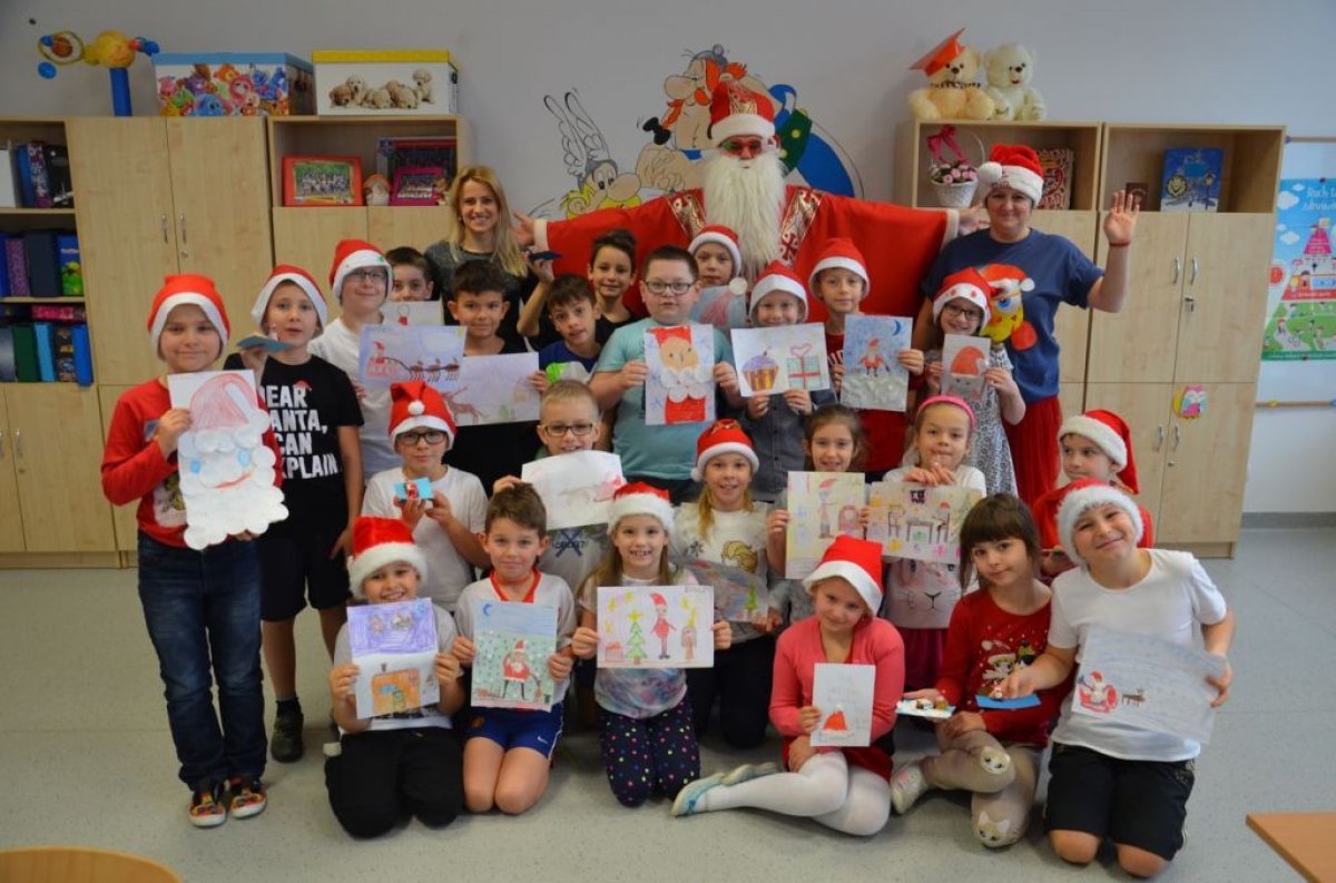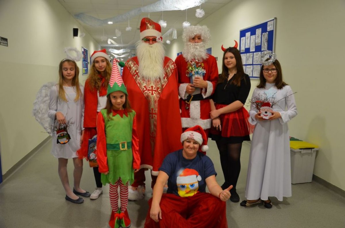 W naszej szkole są same grzeczne dzieci, dlatego 6 grudnia, jak co roku, odwiedził nas bardzo wesoły Święty Mikołaj. Wędrował z klasy do klasy z workiem pełnym pięknych prezentów. Długo oczekiwany gość wywołał uśmiech na twarzach wszystkich uczniów. Mikołaj rozmawiał z dziećmi, wprowadzając wszystkich w radosny świąteczny klimat. Wszystkie dzieci zostały obdarowane prezentami. Uczniowie również przygotowali i wręczyli drobne upominki dla strudzonego Mikołaja. Miło spędzony czas z naszym gościem uświetniły wspólne wesołe zdjęcia.