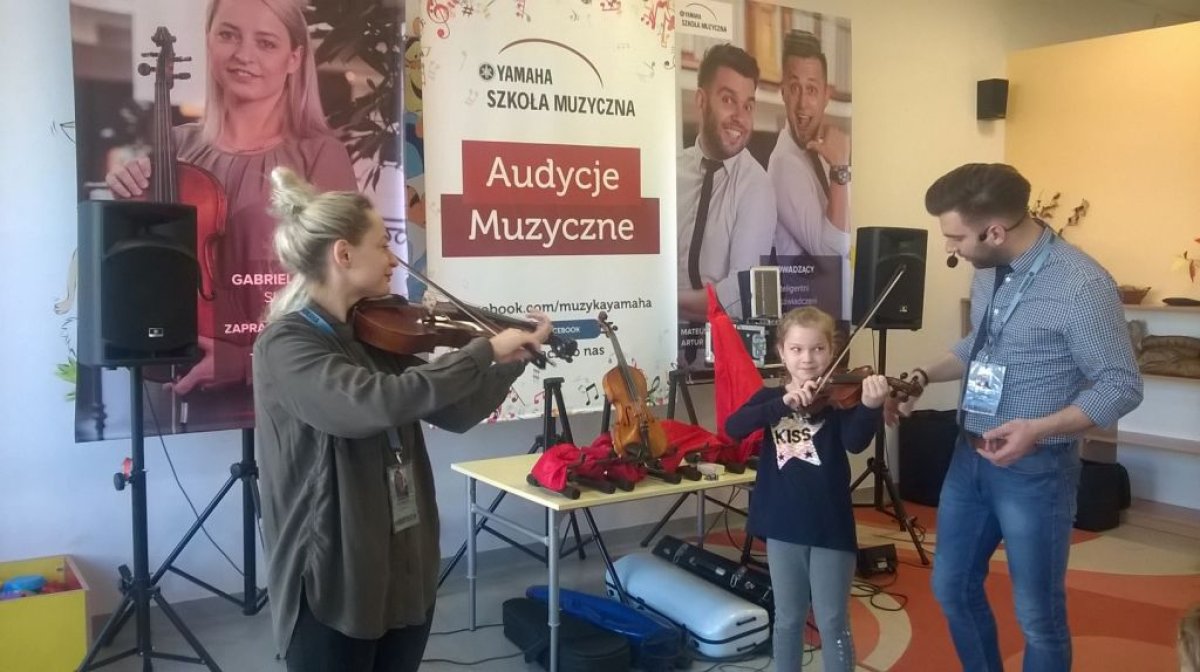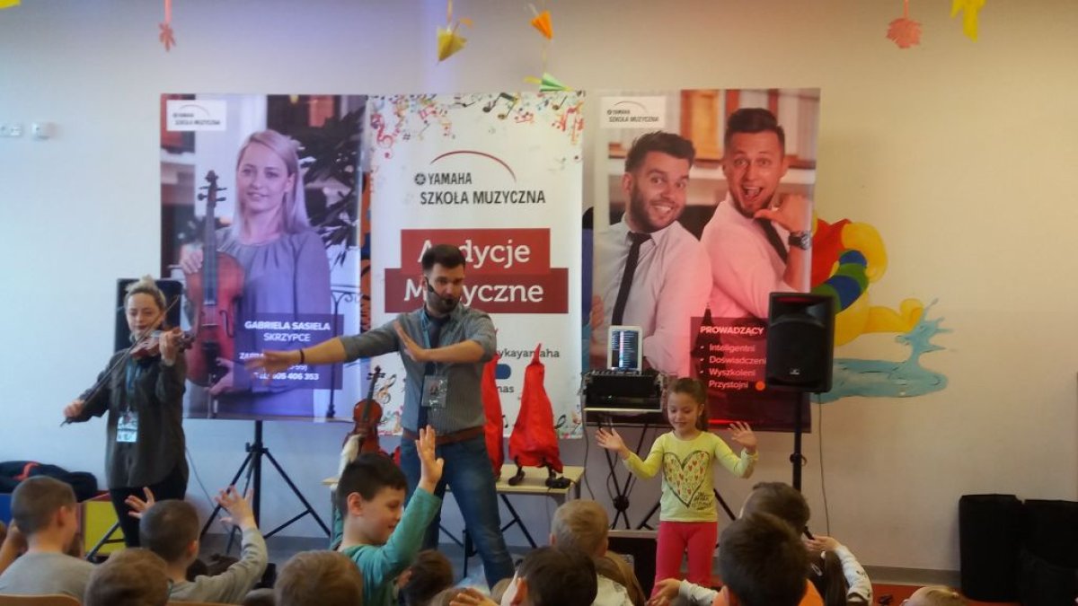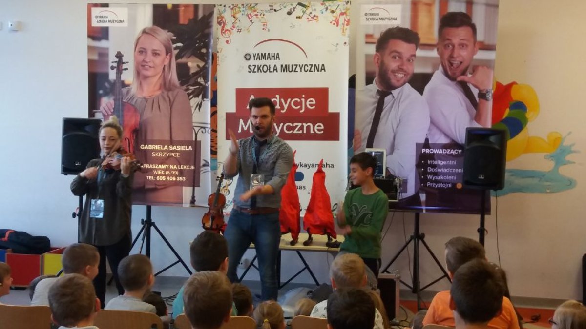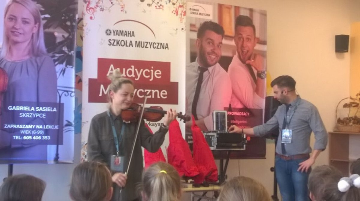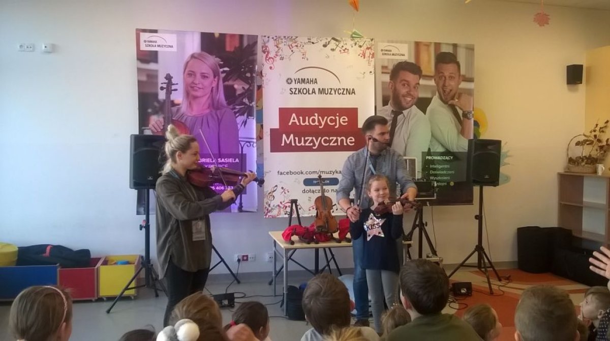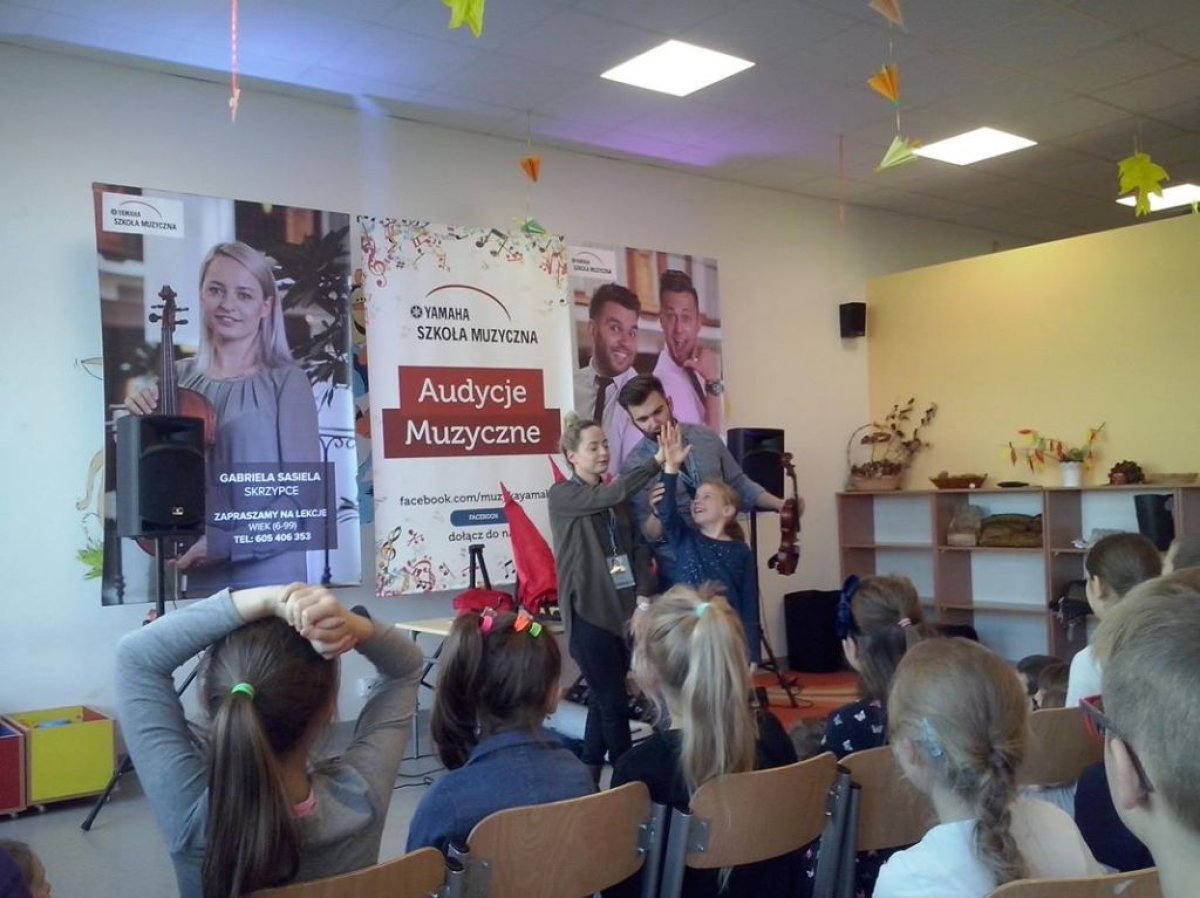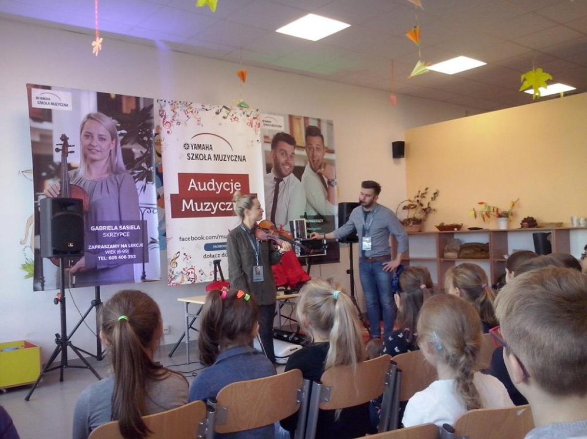 Dnia 8 grudnia 2017 r. uczniowie klas I-III wzięli udział w kolejnej audycji poprowadzonej przez Szkołę Muzyczną Yamaha. Podczas zajęć muzycy zaprezentowali skrzypce małe, duże, elektryczne i altówkę. Uczniowie poznali ich budowę oraz ciekawostki dotyczące smyczka, a także techniki wydobywania dźwięków (legato, staccato, tremolo, pizzicato). Każdy mógł usłyszeć brzmienie instrumentów w wykonaniu gościa – Gabrieli Sasieli, m.in. melodię z musicalu „Skrzypek na dachu”, a także melodie, które wprowadziły wszystkich uczestników w świąteczny nastrój. Spotkanie to cieszyło się bardzo dużym zainteresowaniem.