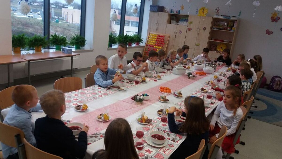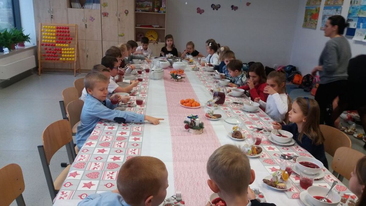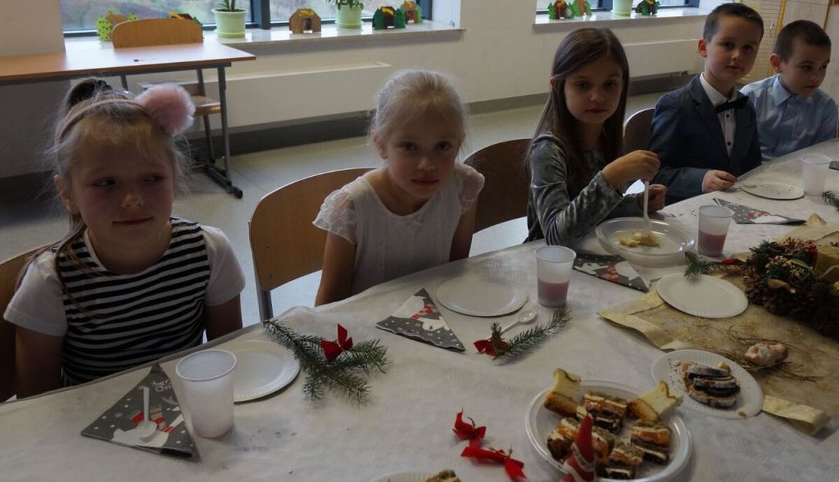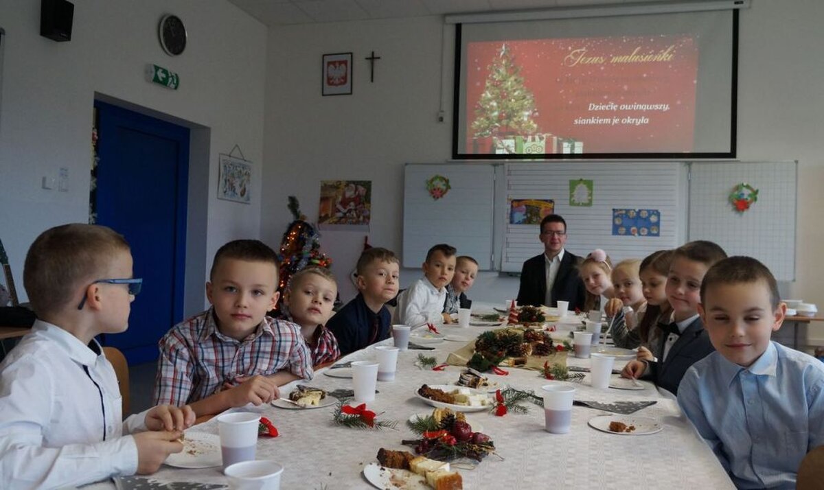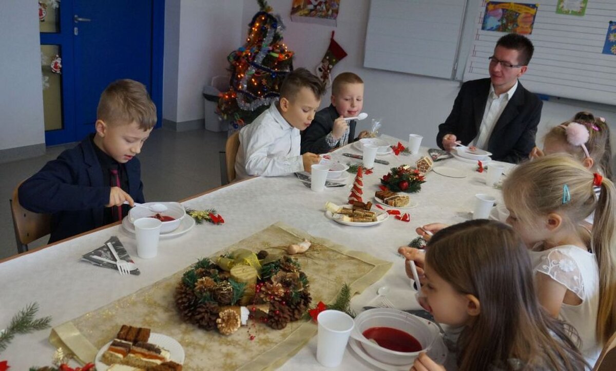 Kultywując naszą polska tradycję w dniu 22 grudnia 2017 roku we wszystkich klasach odbyła się Wigilia klasowa. Po uroczystym rozpoczęciu polegającym na złożeniu sobie życzeń i łamaniu się opłatkiem, wszyscy uczniowie wraz z wychowawcami zasiedli do wspólnego stołu, na którym nie mogło zabraknąć tradycyjnych, wigilijnych potraw: barszczu czerwonego z uszkami, pierogów, a także słodkich pierników, serników i makowców. Zdarzało się, że młodsze dzieci znajdowały też pod choinką symboliczne drobiazgi przygotowane przez rodziców. Wspólnemu ucztowaniu towarzyszył śpiew kolęd.
