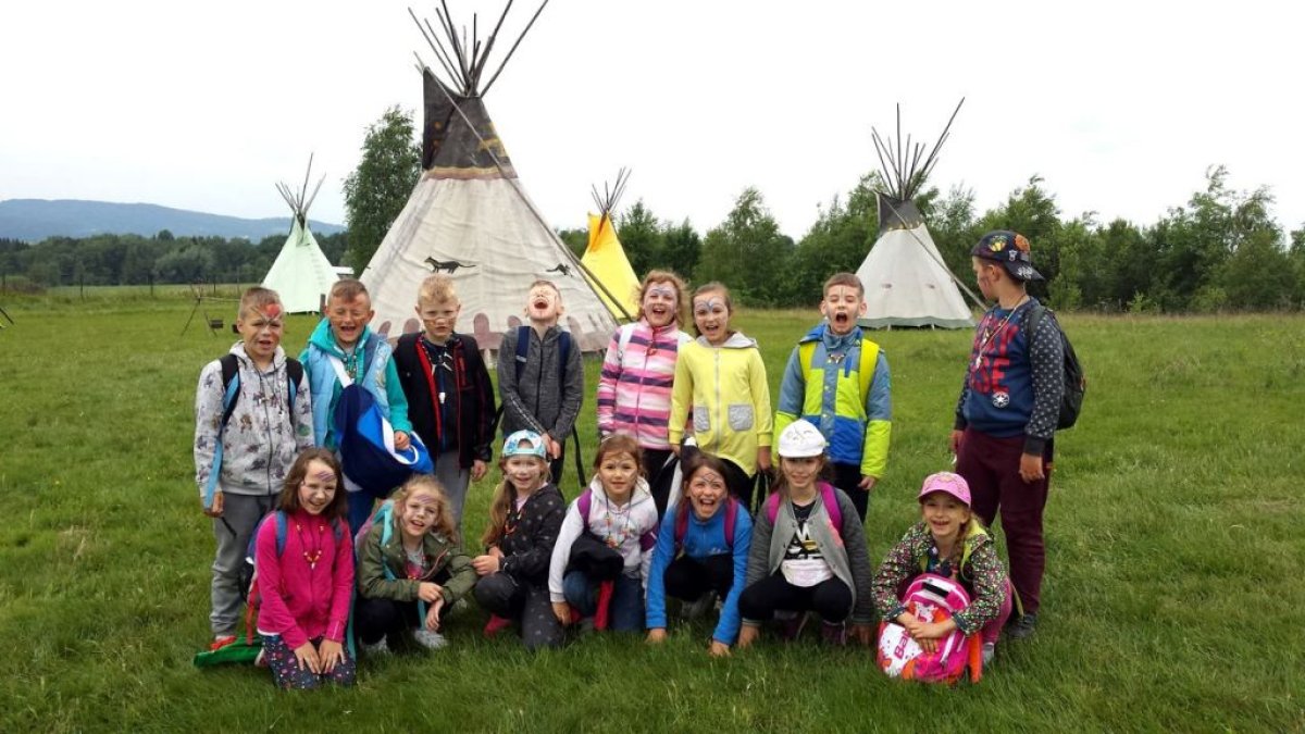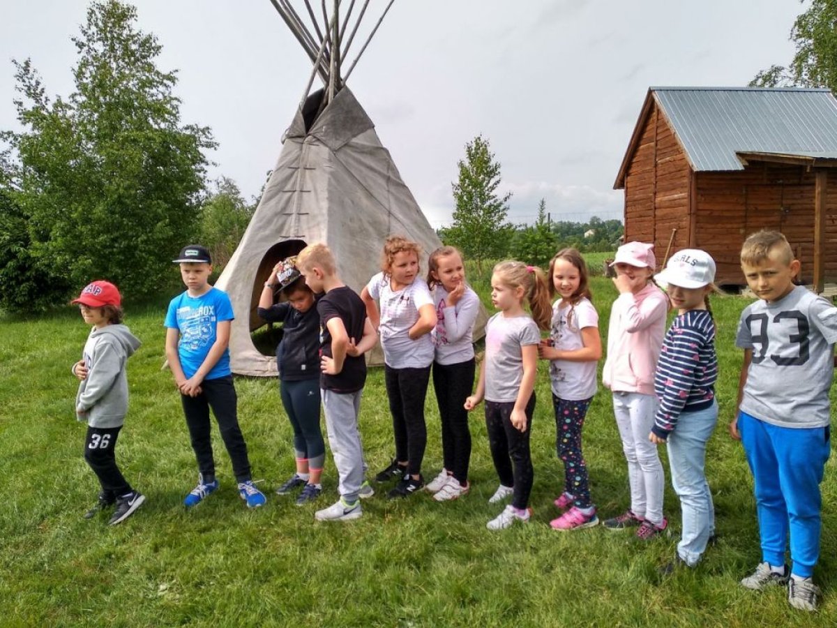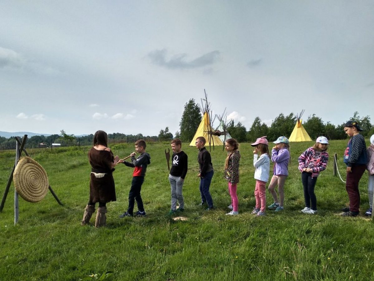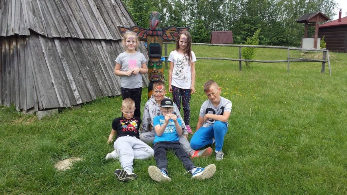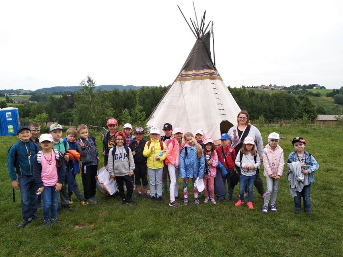 W dniu 15.05.2018 r. klasy 1a i 2b wyruszyły do wioski indiańskiej "FORT WAPITI", położonej w malowniczych okolicach Parku Krajobrazowego Pasma Brzanki, na terenie czystego, obfitującego w piękne widoki. Po przywitaniu się z wodzem dzieci miały możliwość oglądania oryginalnych tipi, totemów, indiańskich strojów oraz narzędzi do codziennego użytku. Odśpiewały z wodzem indiańską pieśń ducha ognia. Zajęcia prowadzone w wiosce połączone były z dodatkowymi atrakcjami (strzelanie z łuku, z dmuchawki, rzuty włócznią, rzut na bizonie rogi, wyścigi węży, indiański połów ryb, a to tylko niektóre zabawy). Wiele radości sprawił dzieciom indiański tor przeszkód, który usprawnia równowagę, koncentrację oraz ćwiczy cierpliwość i zwinność. Dzieci chętnie korzystały z możliwości pomalowania twarzy w indiańskie wzory i nauczyły się indiańskiego tańca aligatora z plemienia Irokezów. W trakcie zabaw dzieci częstowały się kiełbaską smażoną na grillu. Na zakończenie dzieci wzięły udział w warsztatach rękodzieła indiańskiego wykonując naszyjnik indiański z kolorowych koralików i kolorując samodzielnie drewniany szablon tipi, które będą wspaniałymi pamiątkami.