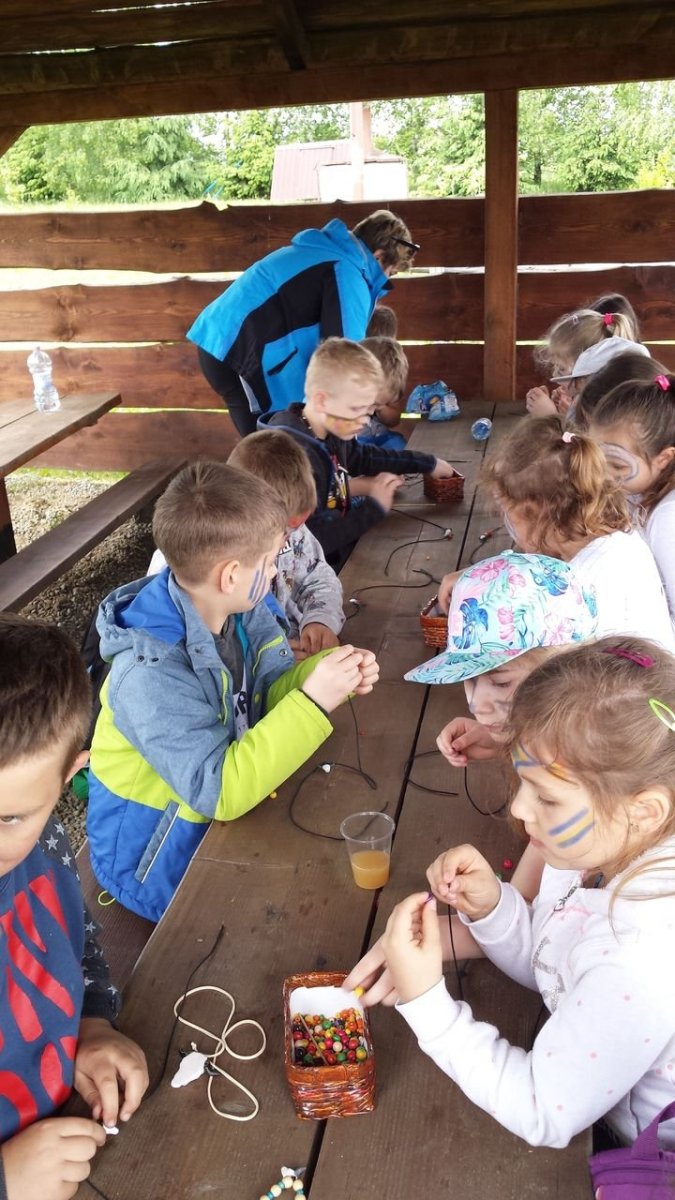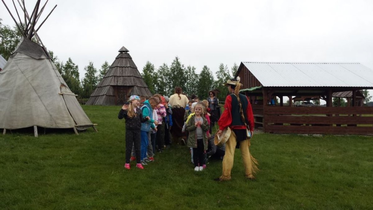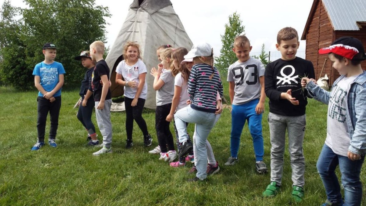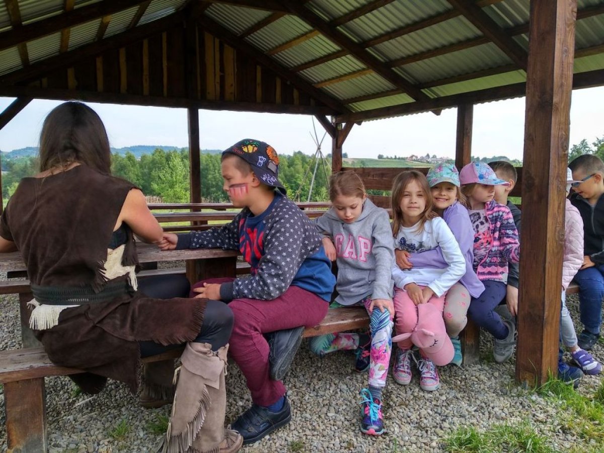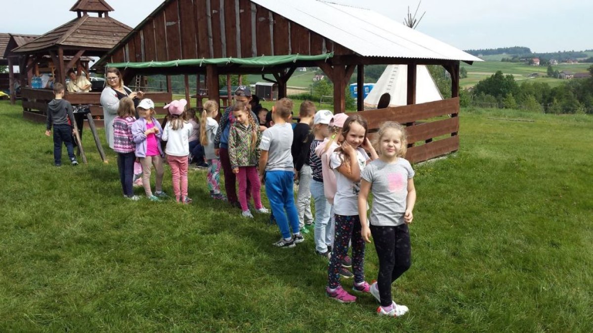 W dniu 15.05.2018 r. klasy 1a i 2b wyruszyły do wioski indiańskiej "FORT WAPITI", położonej w malowniczych okolicach Parku Krajobrazowego Pasma Brzanki, na terenie czystego, obfitującego w piękne widoki. Po przywitaniu się z wodzem dzieci miały możliwość oglądania oryginalnych tipi, totemów, indiańskich strojów oraz narzędzi do codziennego użytku. Odśpiewały z wodzem indiańską pieśń ducha ognia. Zajęcia prowadzone w wiosce połączone były z dodatkowymi atrakcjami (strzelanie z łuku, z dmuchawki, rzuty włócznią, rzut na bizonie rogi, wyścigi węży, indiański połów ryb, a to tylko niektóre zabawy). Wiele radości sprawił dzieciom indiański tor przeszkód, który usprawnia równowagę, koncentrację oraz ćwiczy cierpliwość i zwinność. Dzieci chętnie korzystały z możliwości pomalowania twarzy w indiańskie wzory i nauczyły się indiańskiego tańca aligatora z plemienia Irokezów. W trakcie zabaw dzieci częstowały się kiełbaską smażoną na grillu. Na zakończenie dzieci wzięły udział w warsztatach rękodzieła indiańskiego wykonując naszyjnik indiański z kolorowych koralików i kolorując samodzielnie drewniany szablon tipi, które będą wspaniałymi pamiątkami.