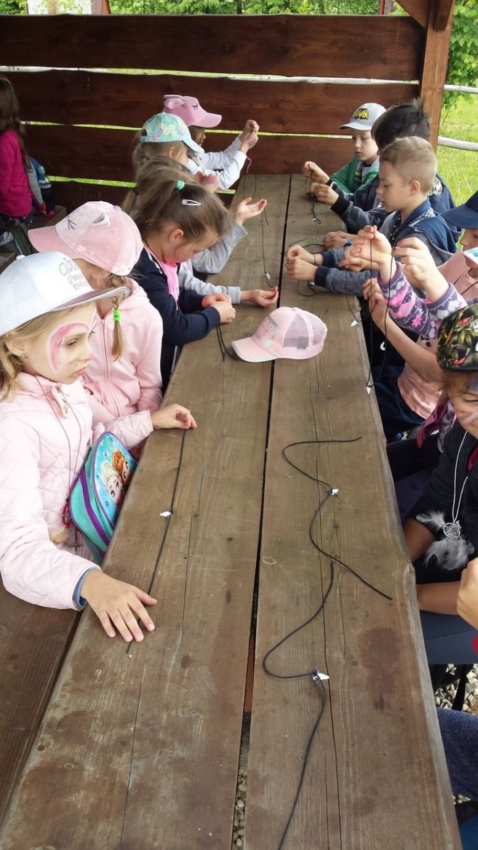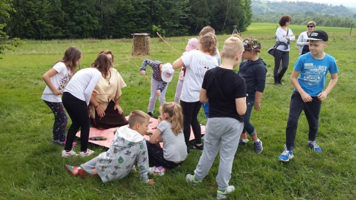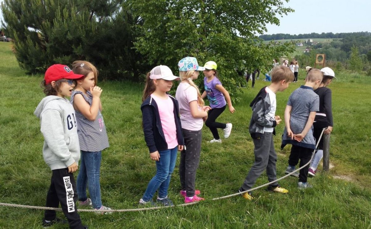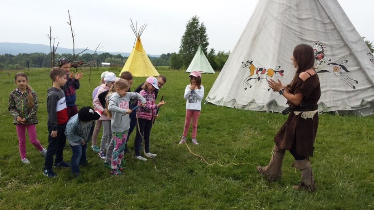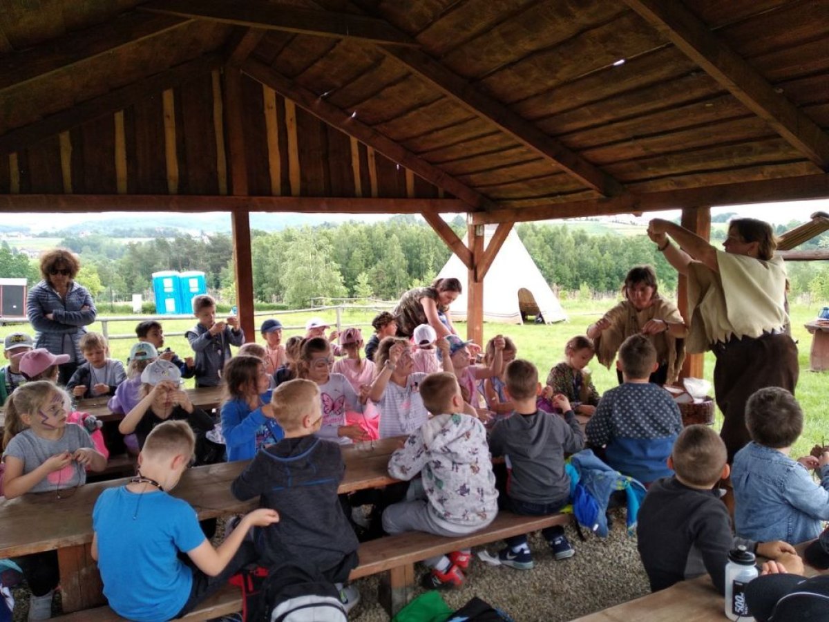 W dniu 15.05.2018 r. klasy 1a i 2b wyruszyły do wioski indiańskiej "FORT WAPITI", położonej w malowniczych okolicach Parku Krajobrazowego Pasma Brzanki, na terenie czystego, obfitującego w piękne widoki. Po przywitaniu się z wodzem dzieci miały możliwość oglądania oryginalnych tipi, totemów, indiańskich strojów oraz narzędzi do codziennego użytku. Odśpiewały z wodzem indiańską pieśń ducha ognia. Zajęcia prowadzone w wiosce połączone były z dodatkowymi atrakcjami (strzelanie z łuku, z dmuchawki, rzuty włócznią, rzut na bizonie rogi, wyścigi węży, indiański połów ryb, a to tylko niektóre zabawy). Wiele radości sprawił dzieciom indiański tor przeszkód, który usprawnia równowagę, koncentrację oraz ćwiczy cierpliwość i zwinność. Dzieci chętnie korzystały z możliwości pomalowania twarzy w indiańskie wzory i nauczyły się indiańskiego tańca aligatora z plemienia Irokezów. W trakcie zabaw dzieci częstowały się kiełbaską smażoną na grillu. Na zakończenie dzieci wzięły udział w warsztatach rękodzieła indiańskiego wykonując naszyjnik indiański z kolorowych koralików i kolorując samodzielnie drewniany szablon tipi, które będą wspaniałymi pamiątkami.