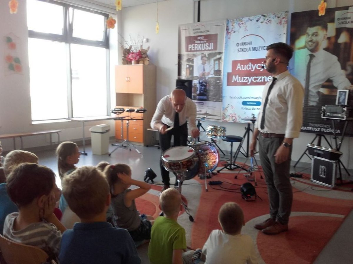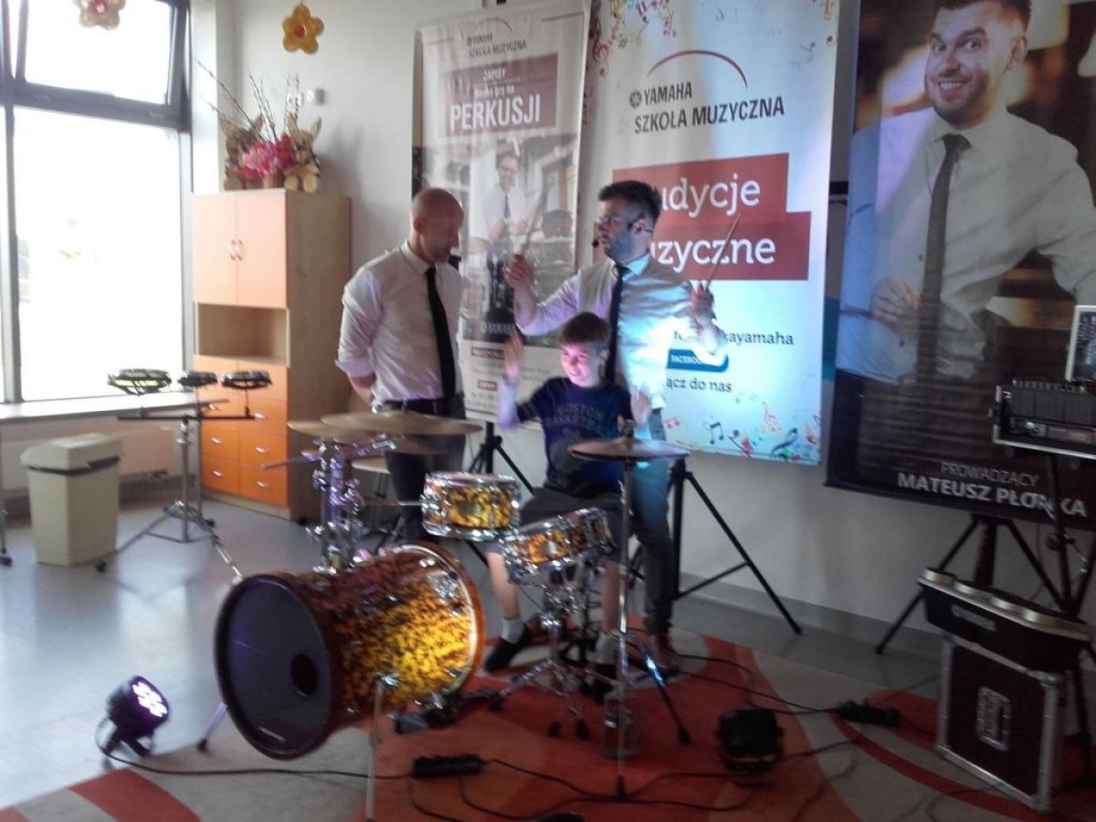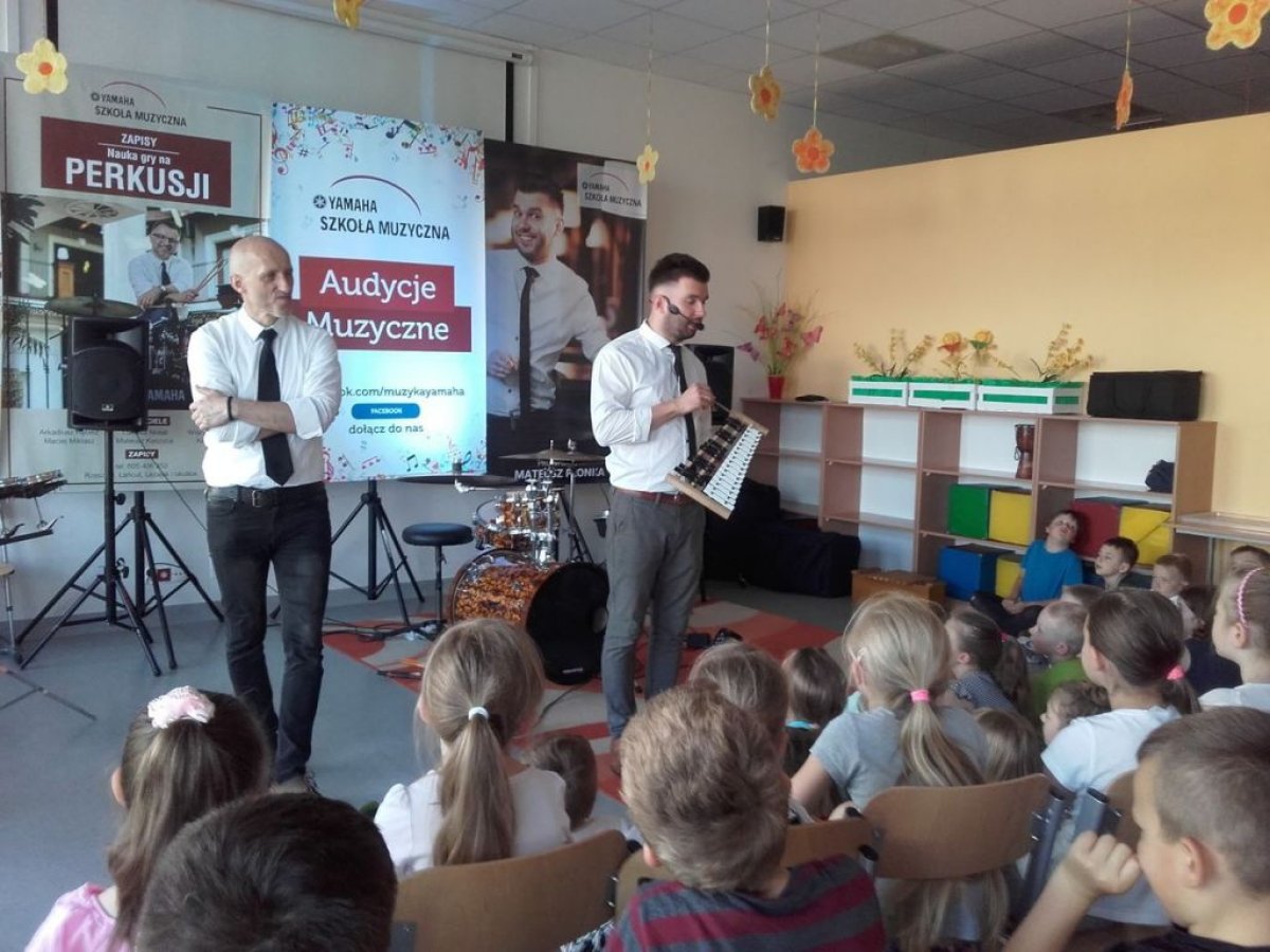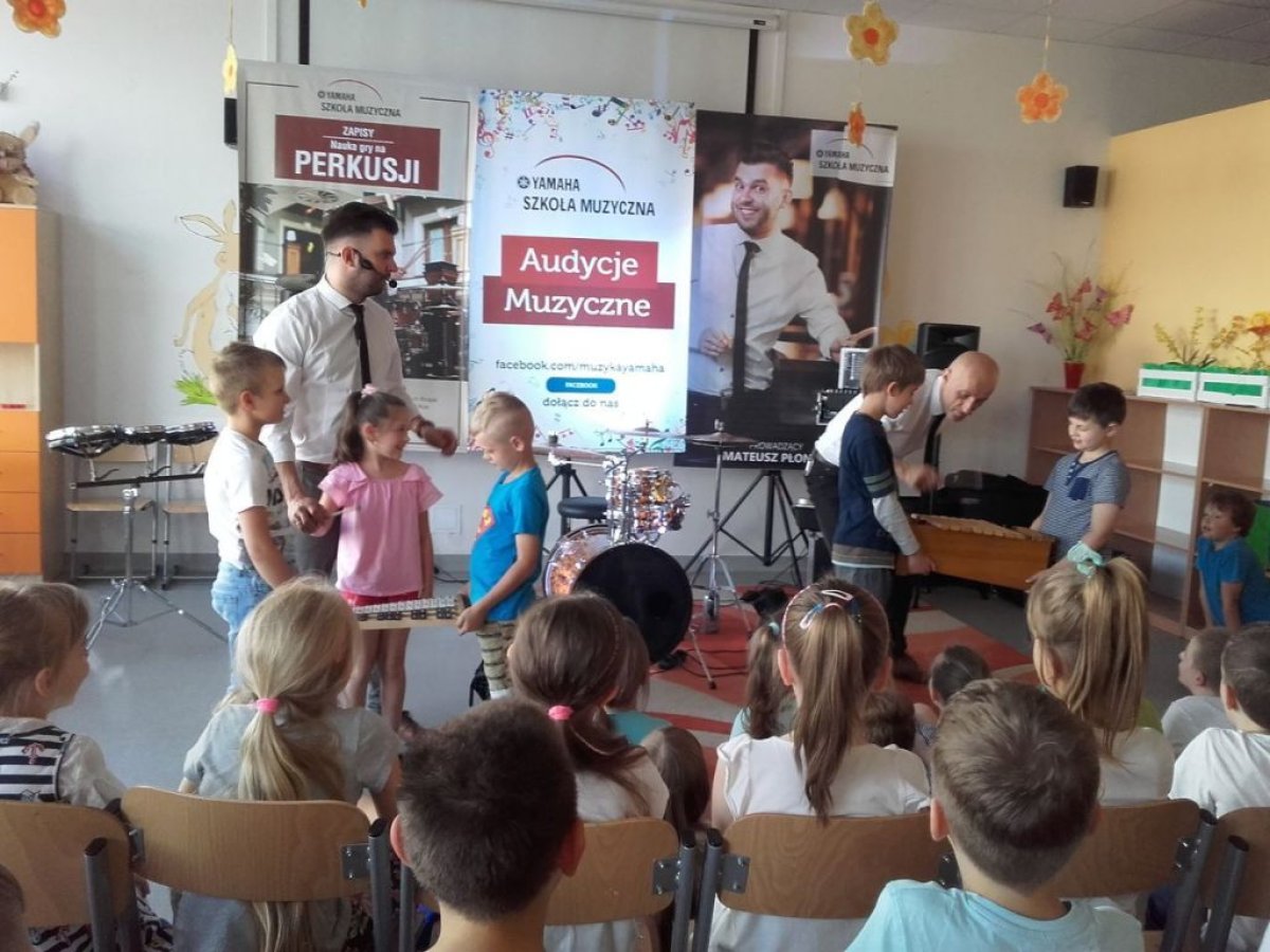 Ostanie zajęcia muzyczne w tym roku szkolnym z Yamahą odbyły się z perkusistą panem Robertem Winczowskim. Tym razem nasi uczniowie mieli możliwość posłuchać znanego muzyka oraz zagrać na instrumentach perkusyjnych takich jak: perkusja, djembe, dzwonki, ksylofon, rototomy. Ilość instrumentów oraz różnorodność wydobywanych dźwięków zrobiła na uczniach duże wrażenie.