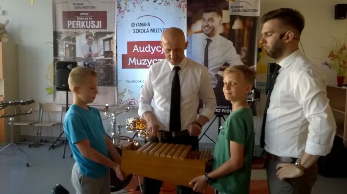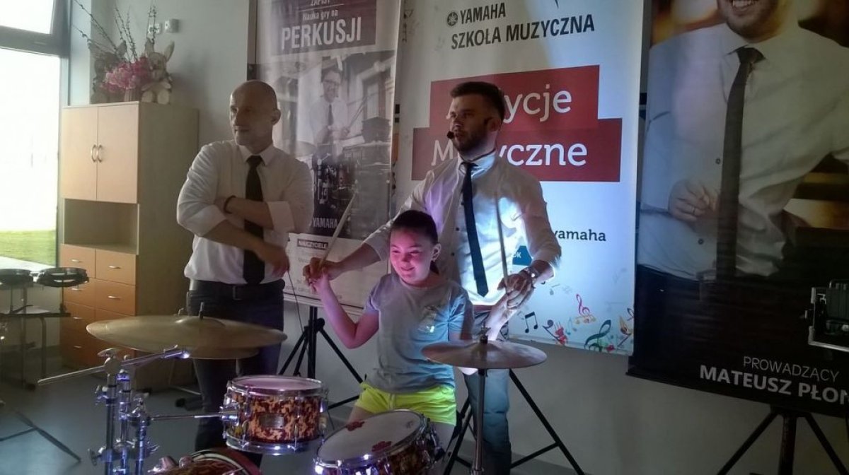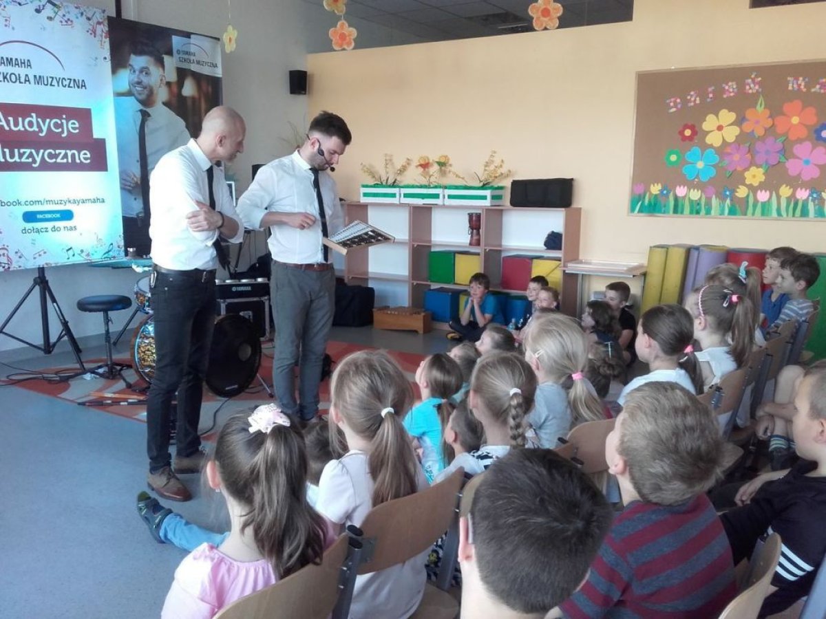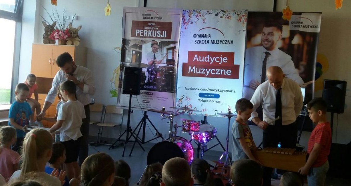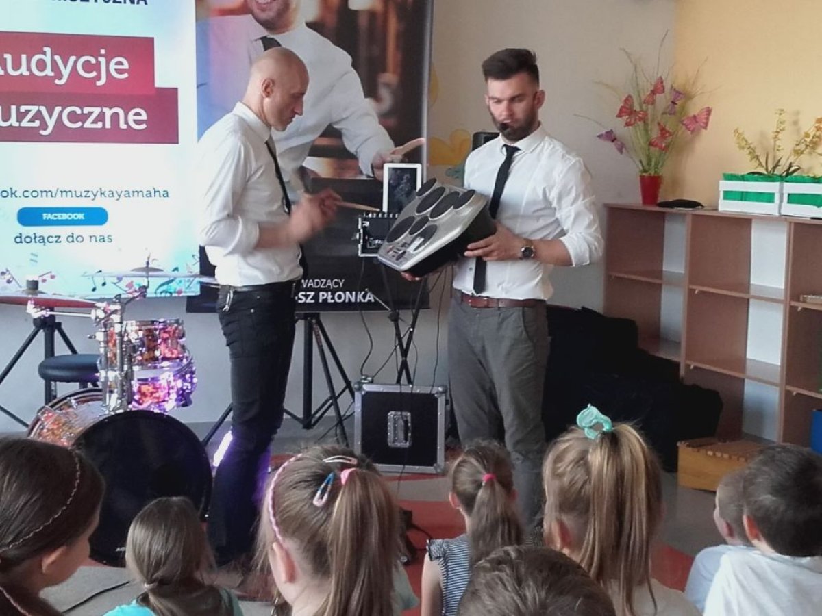 Ostanie zajęcia muzyczne w tym roku szkolnym z Yamahą odbyły się z perkusistą panem Robertem Winczowskim. Tym razem nasi uczniowie mieli możliwość posłuchać znanego muzyka oraz zagrać na instrumentach perkusyjnych takich jak: perkusja, djembe, dzwonki, ksylofon, rototomy. Ilość instrumentów oraz różnorodność wydobywanych dźwięków zrobiła na uczniach duże wrażenie.