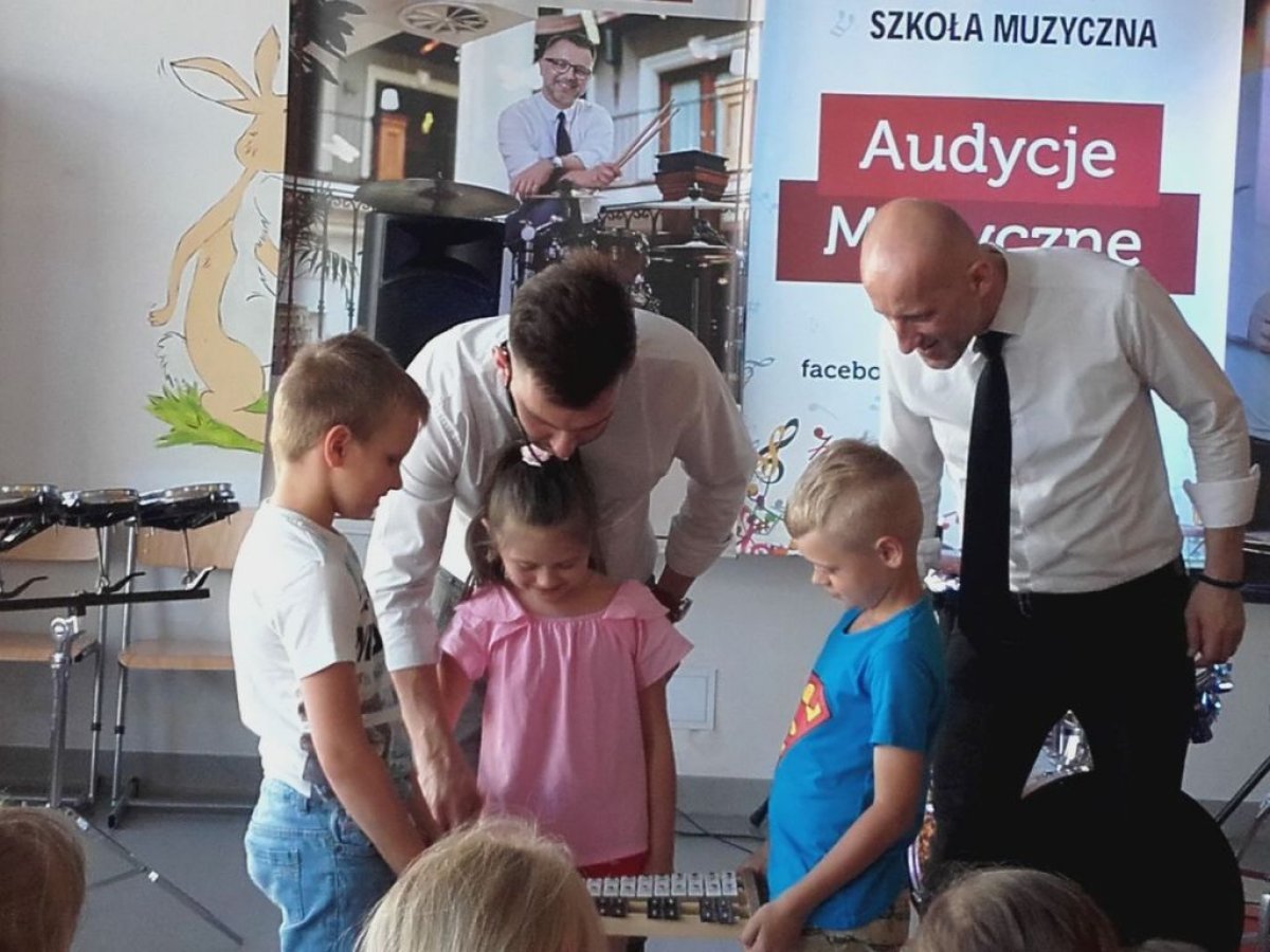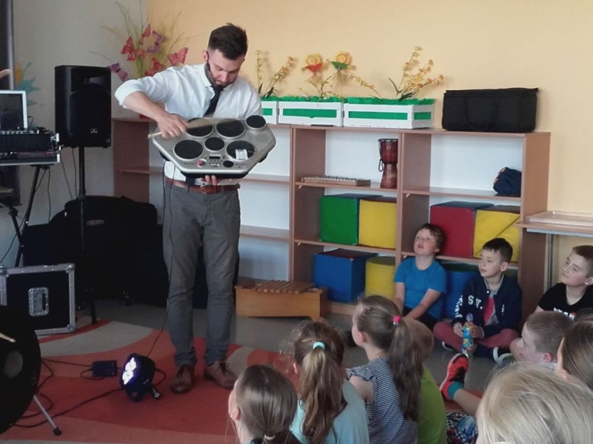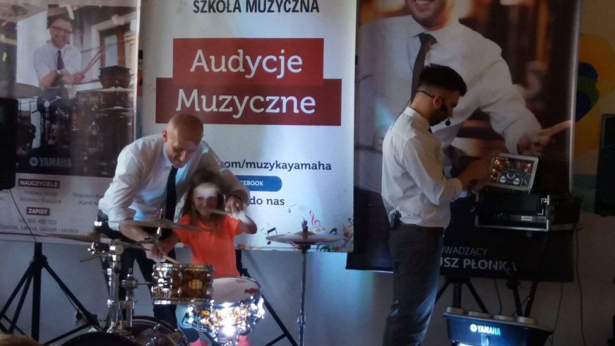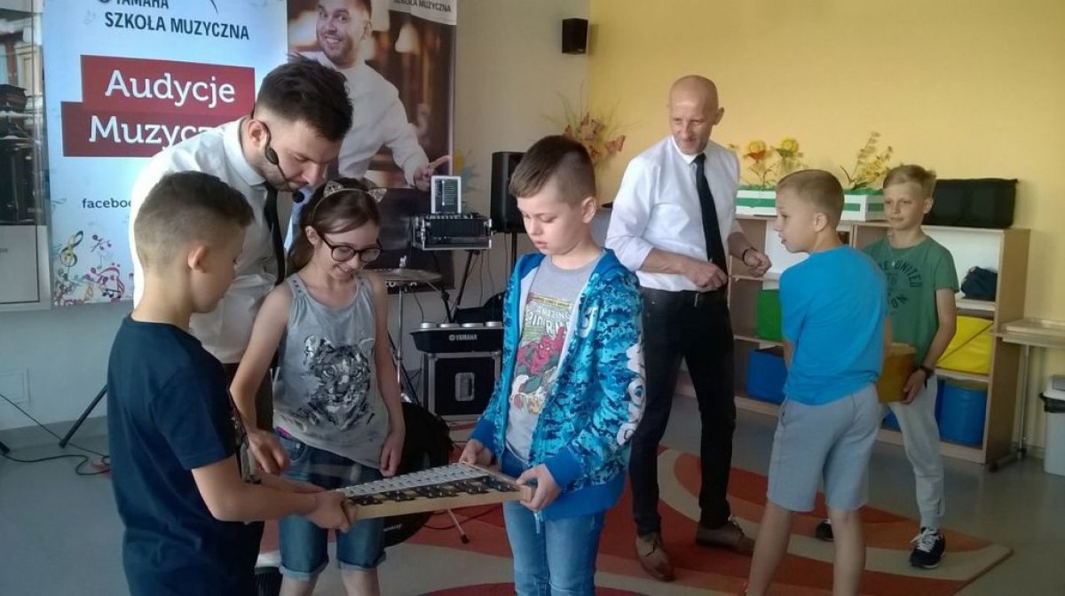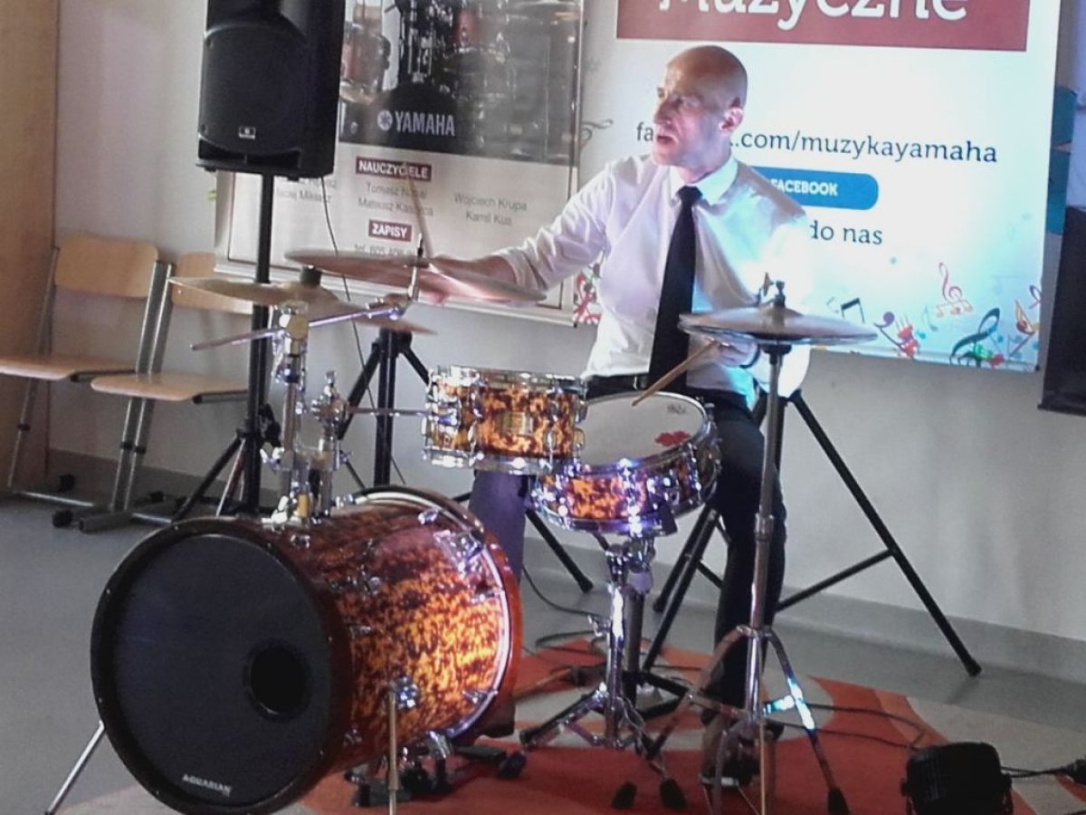 Ostanie zajęcia muzyczne w tym roku szkolnym z Yamahą odbyły się z perkusistą panem Robertem Winczowskim. Tym razem nasi uczniowie mieli możliwość posłuchać znanego muzyka oraz zagrać na instrumentach perkusyjnych takich jak: perkusja, djembe, dzwonki, ksylofon, rototomy. Ilość instrumentów oraz różnorodność wydobywanych dźwięków zrobiła na uczniach duże wrażenie.