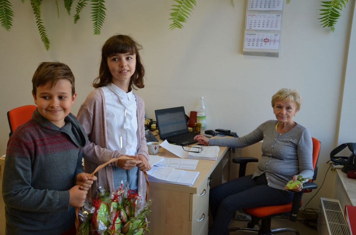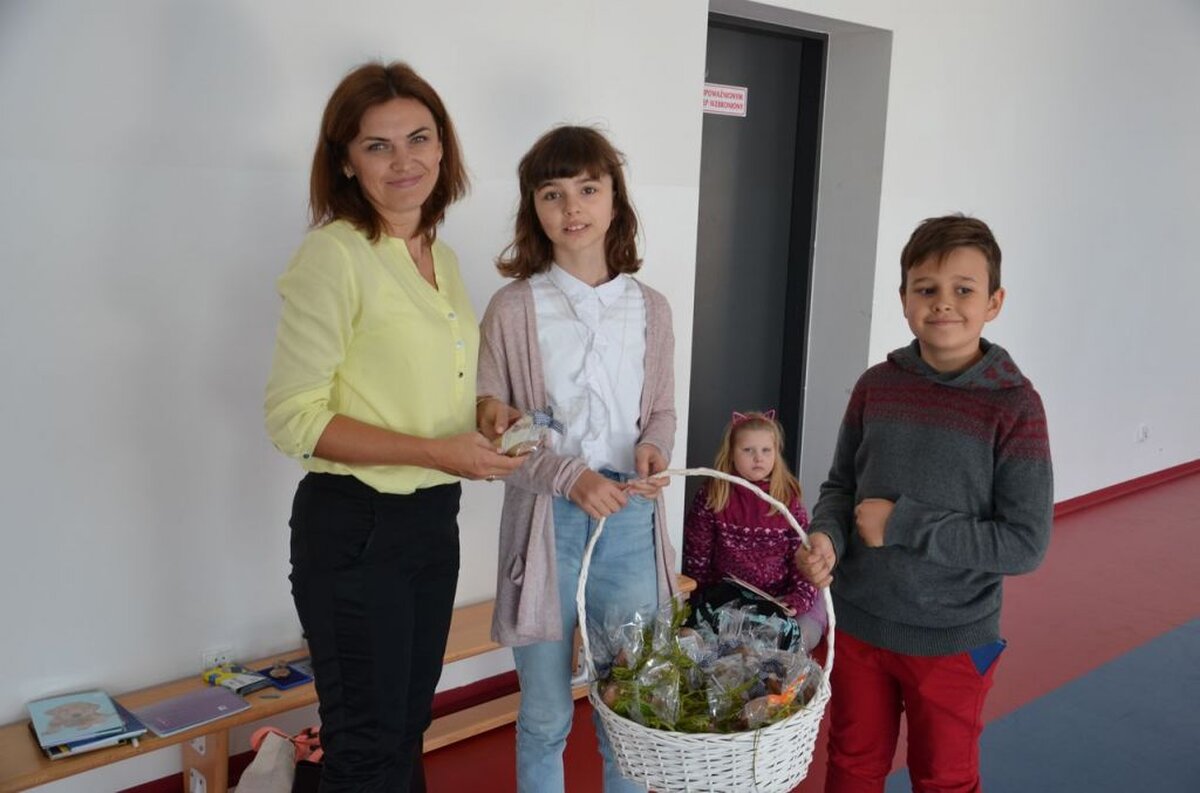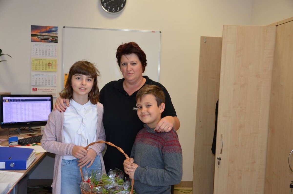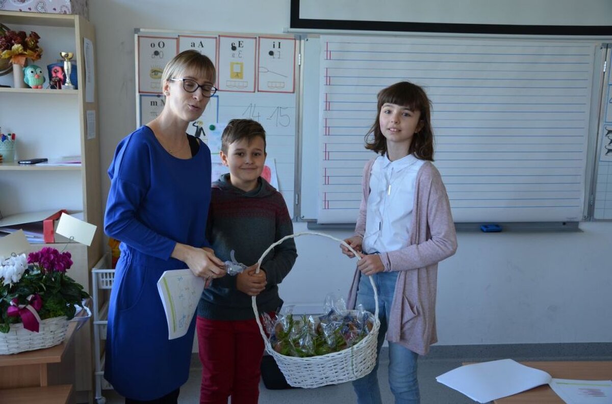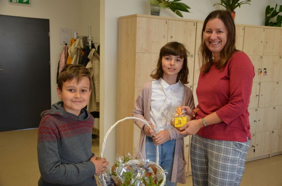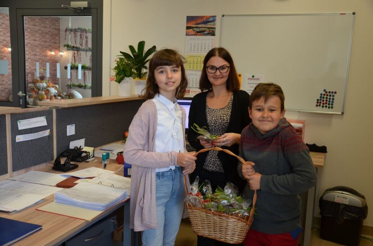Nasi uczniowie, składając życzenia i podziękowania nauczycielom, pracownikom administracji i obsługi, wręczali im smaczne upominki.