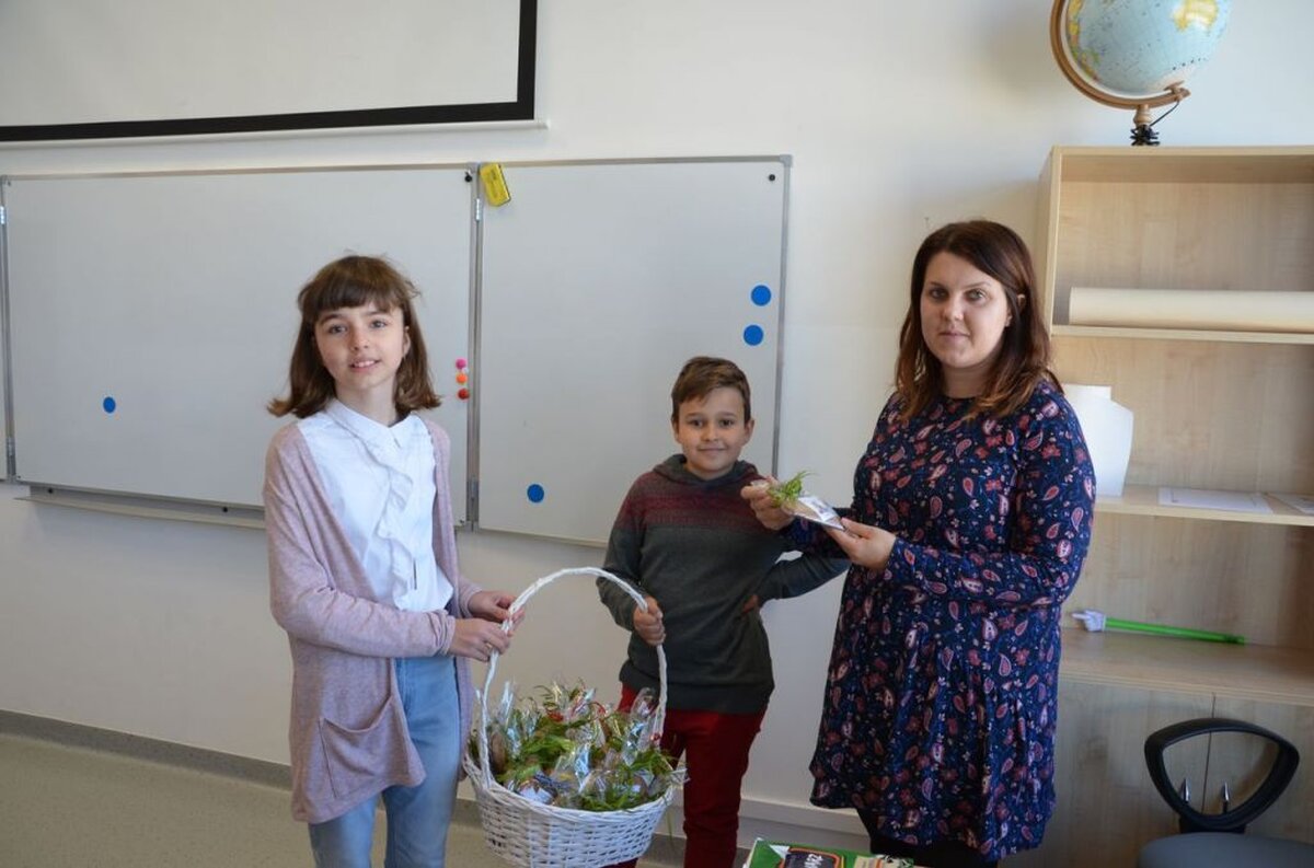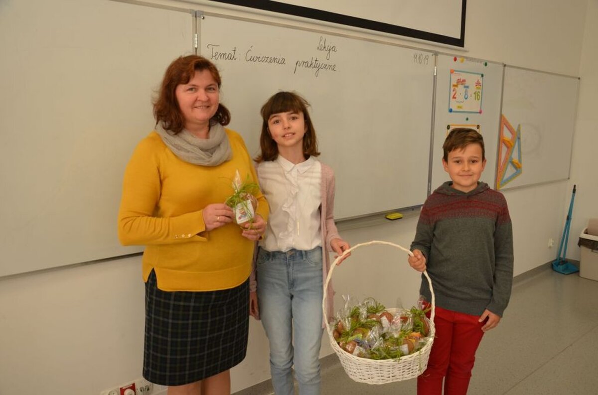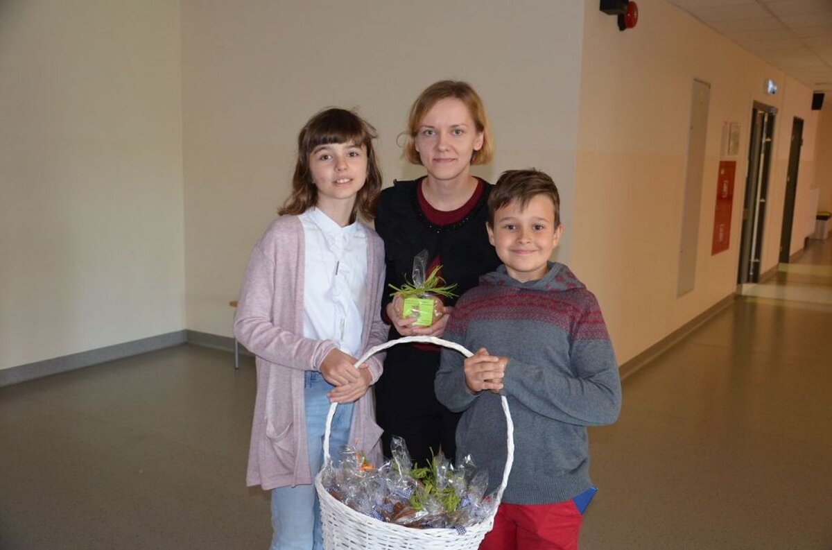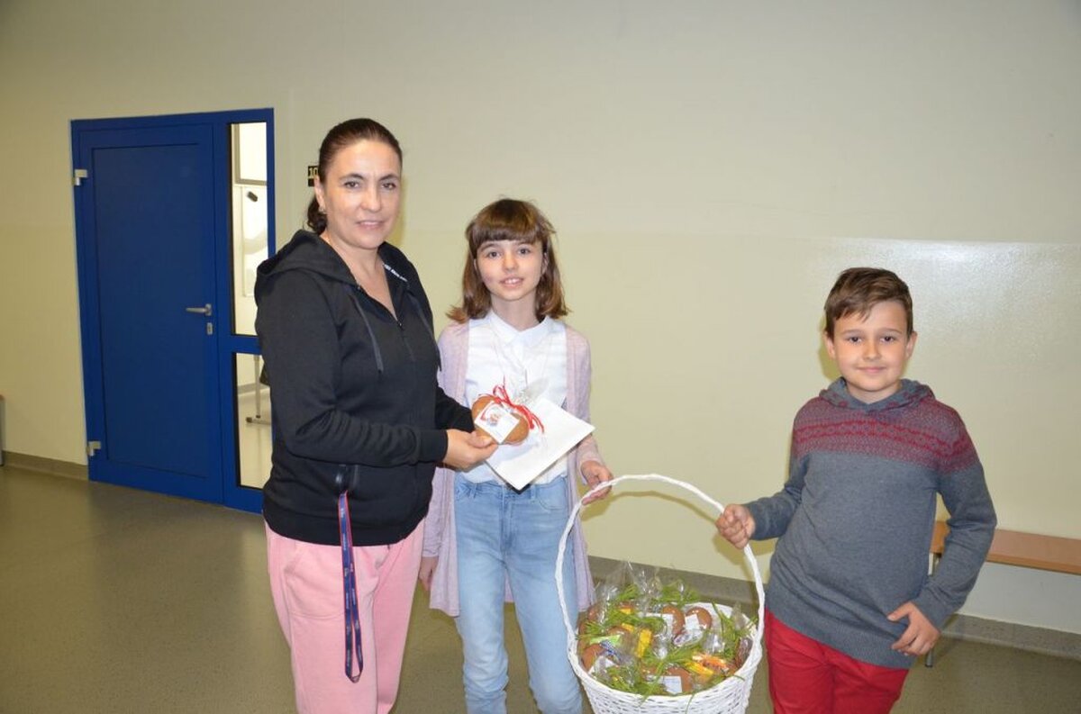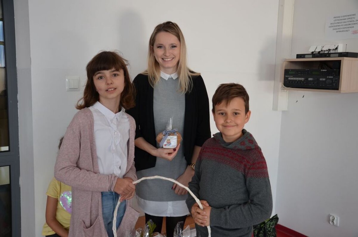 Nasi uczniowie, składając życzenia i podziękowania nauczycielom, pracownikom administracji i obsługi, wręczali im smaczne upominki.