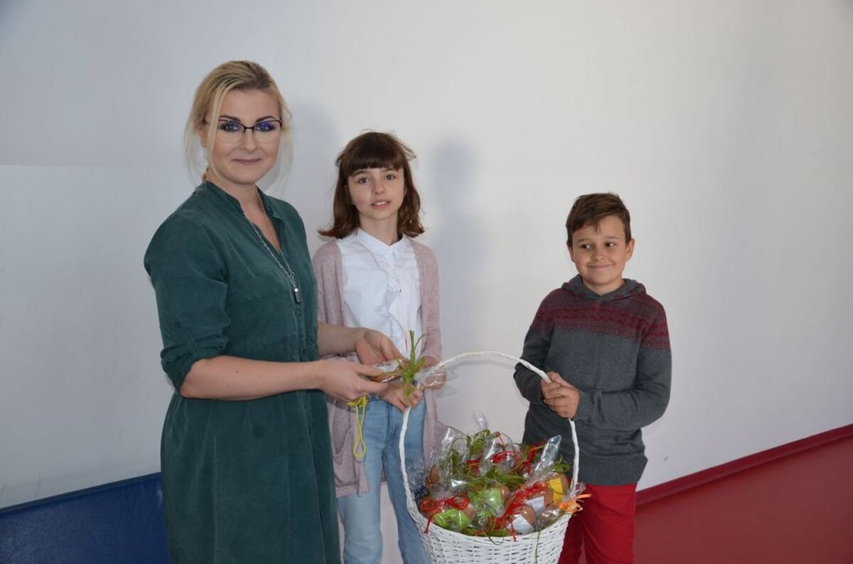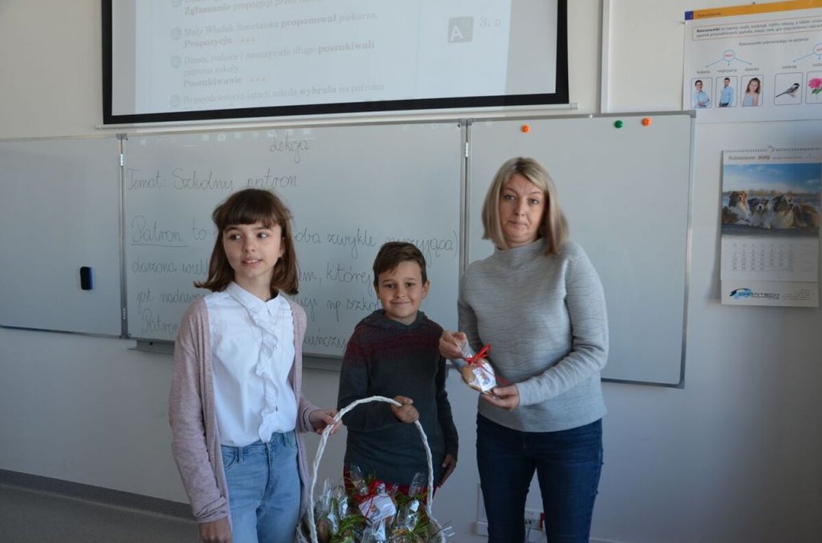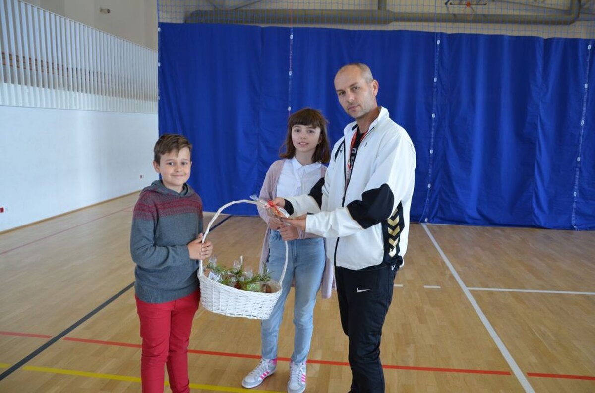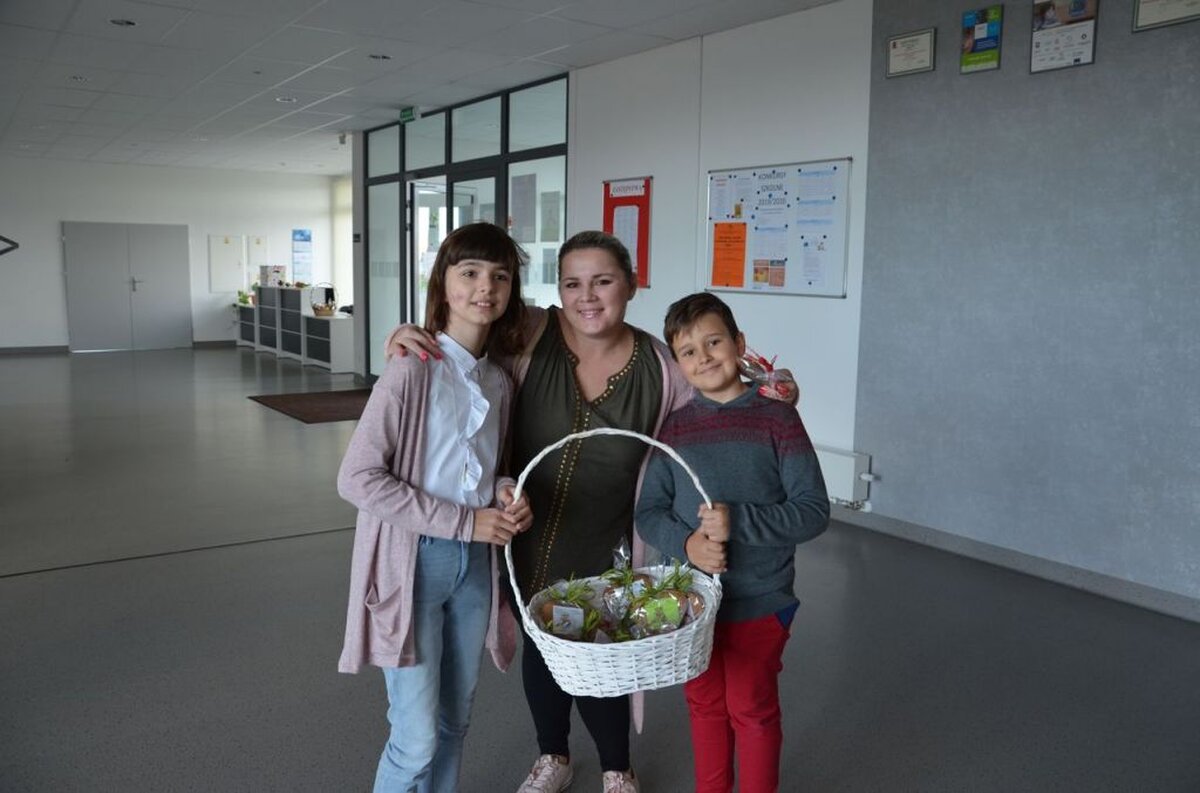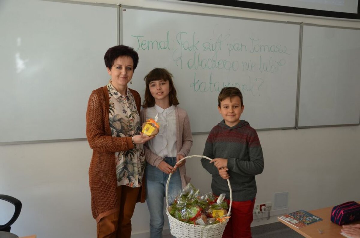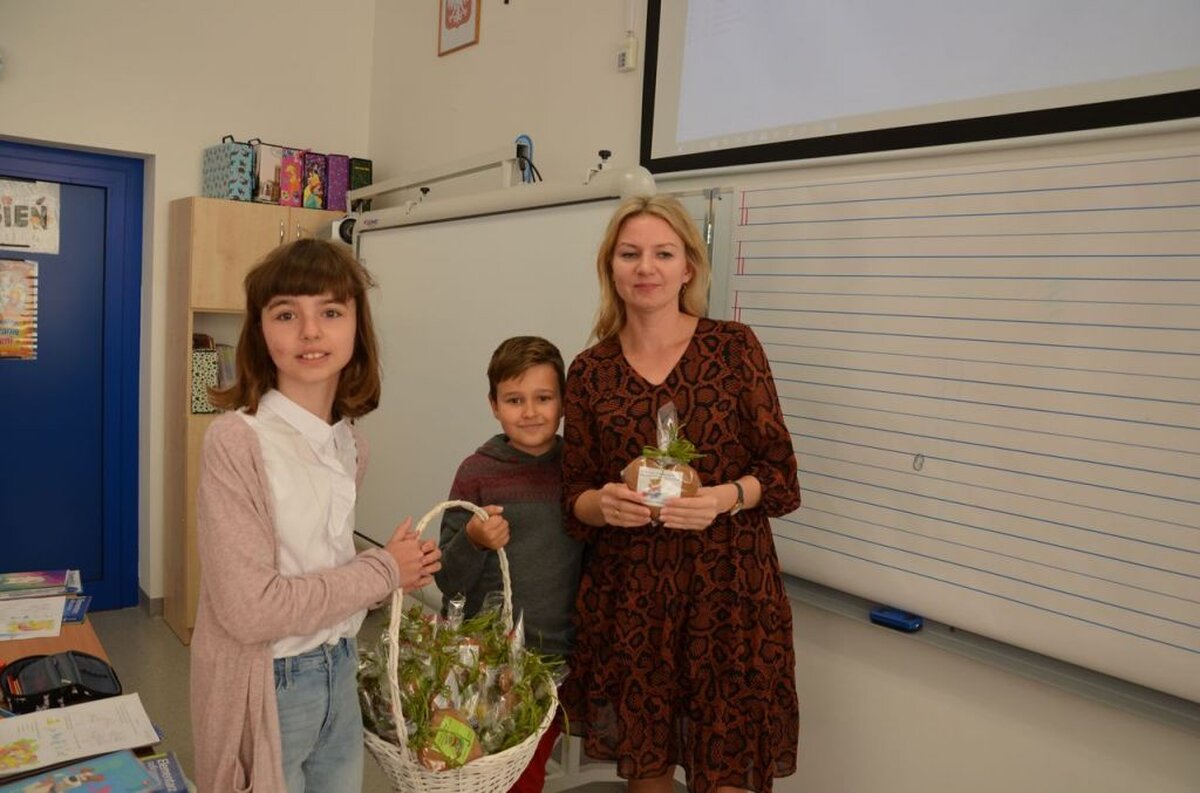 Nasi uczniowie, składając życzenia i podziękowania nauczycielom, pracownikom administracji i obsługi, wręczali im smaczne upominki.