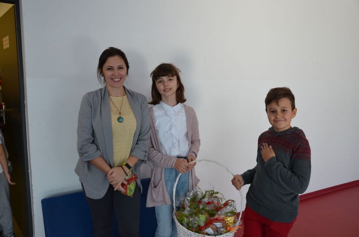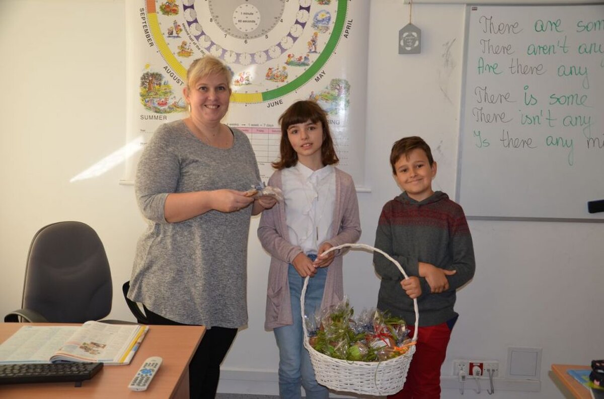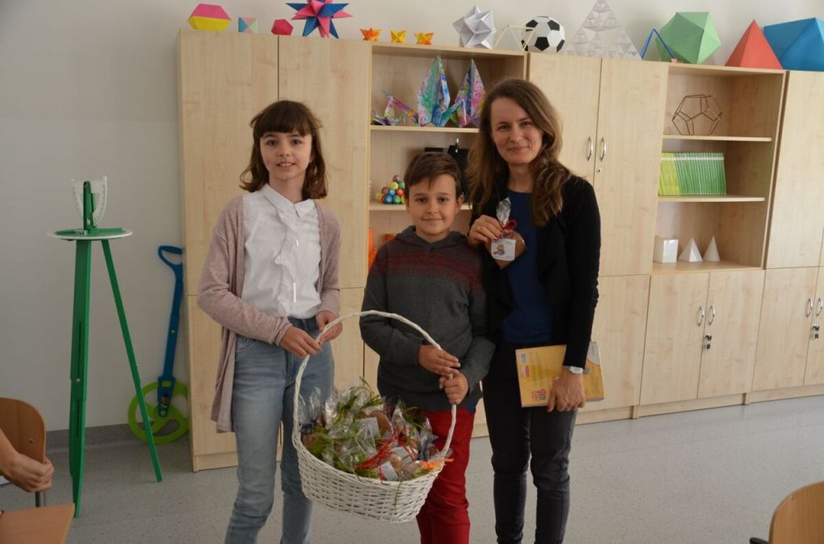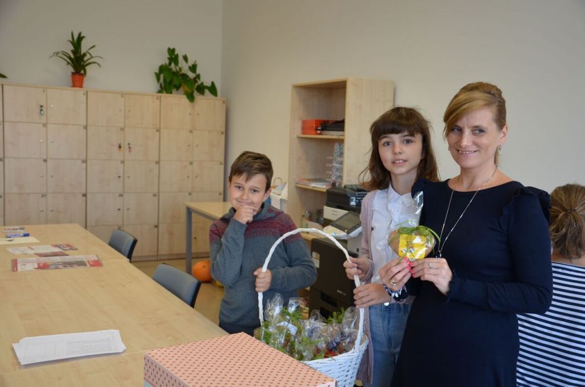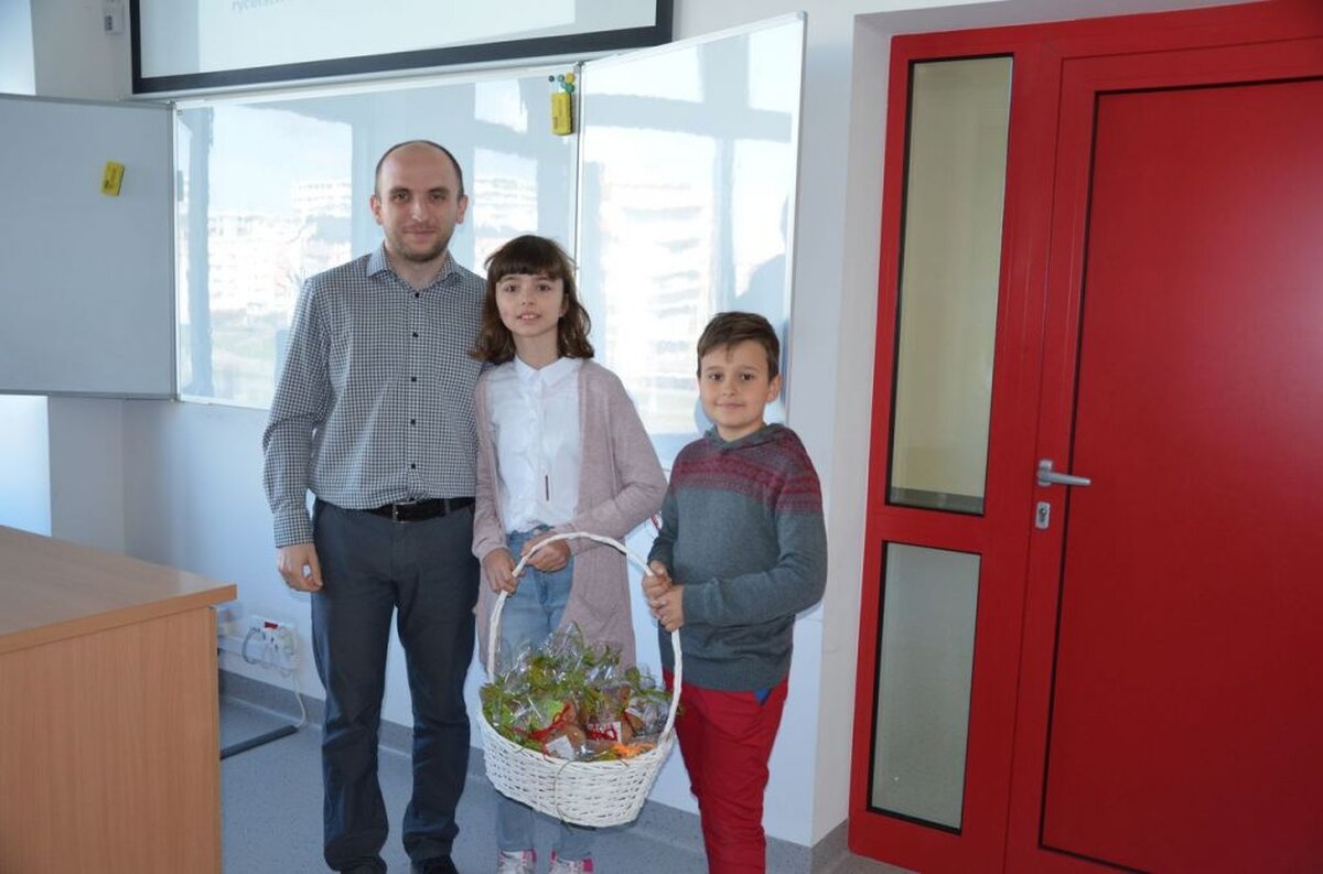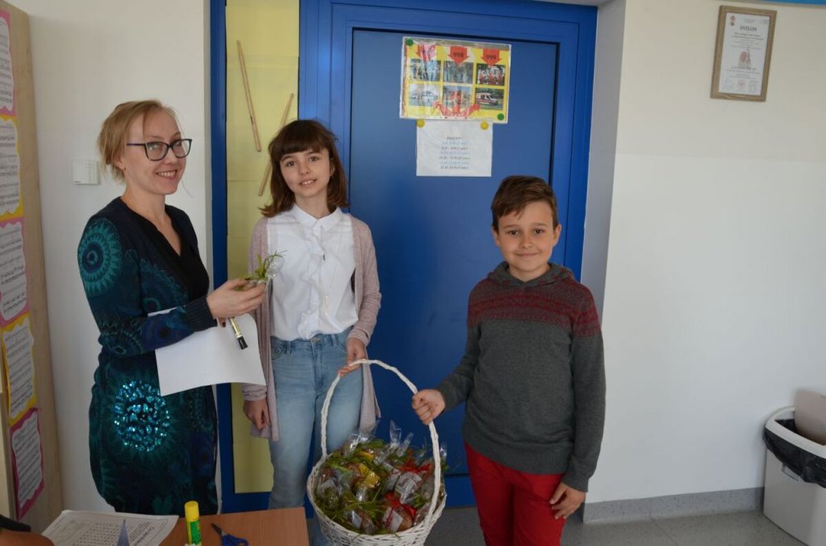 Nasi uczniowie, składając życzenia i podziękowania nauczycielom, pracownikom administracji i obsługi, wręczali im smaczne upominki.