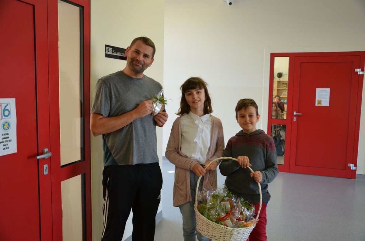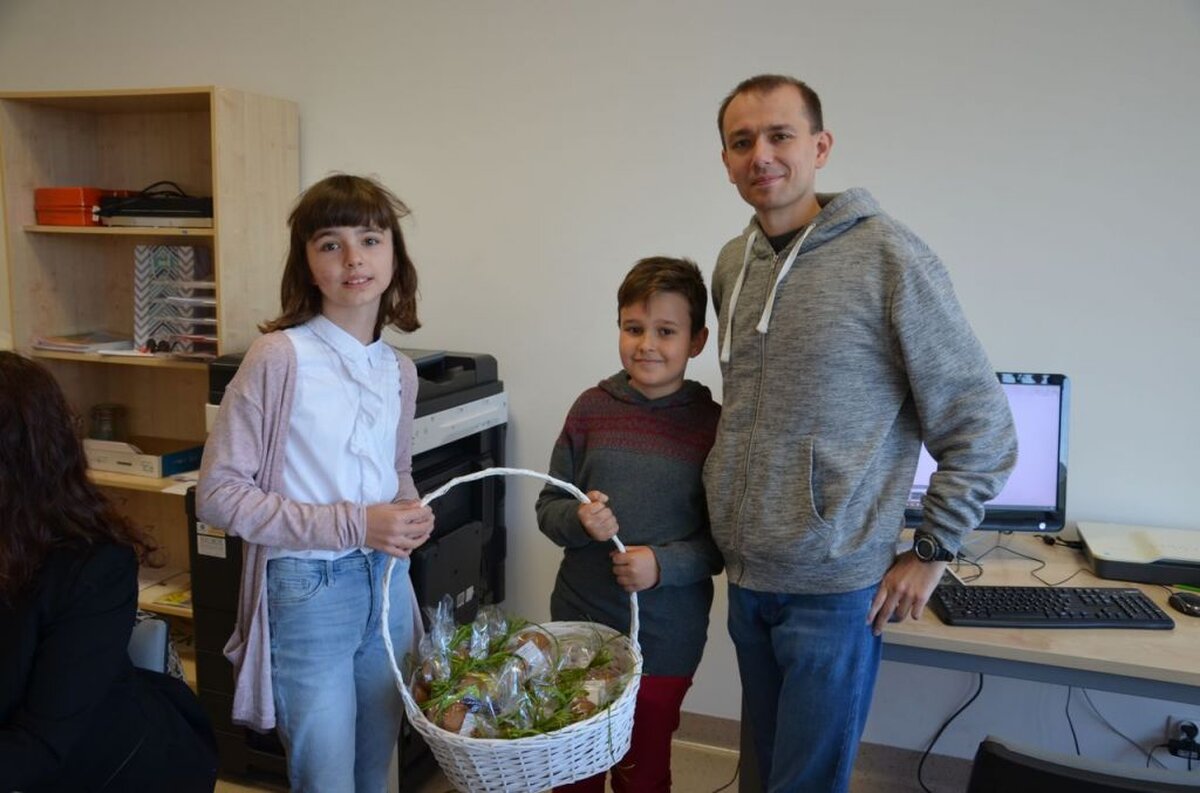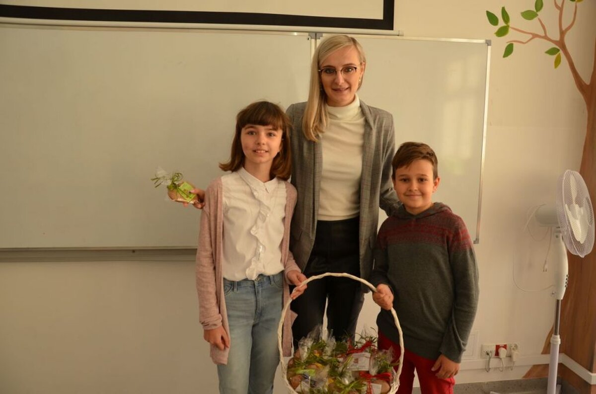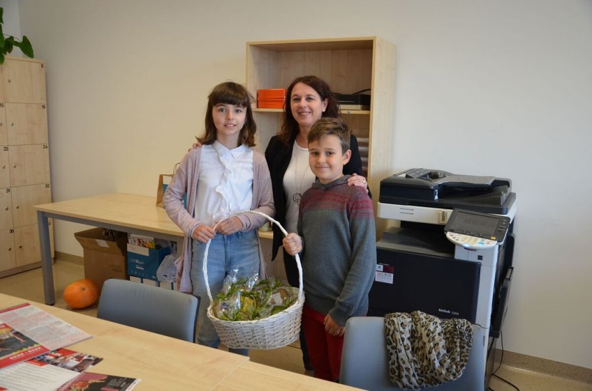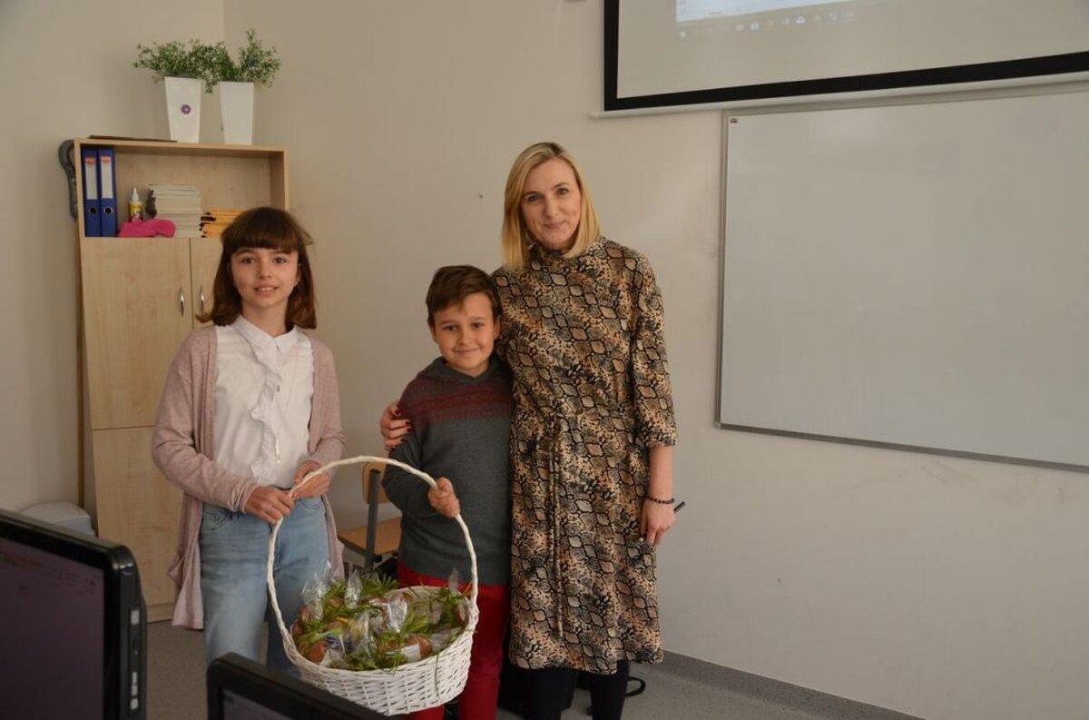 Nasi uczniowie, składając życzenia i podziękowania nauczycielom, pracownikom administracji i obsługi, wręczali im smaczne upominki.