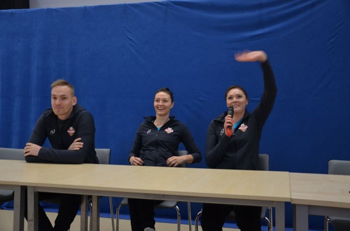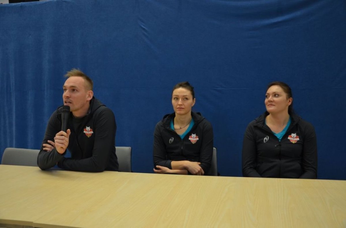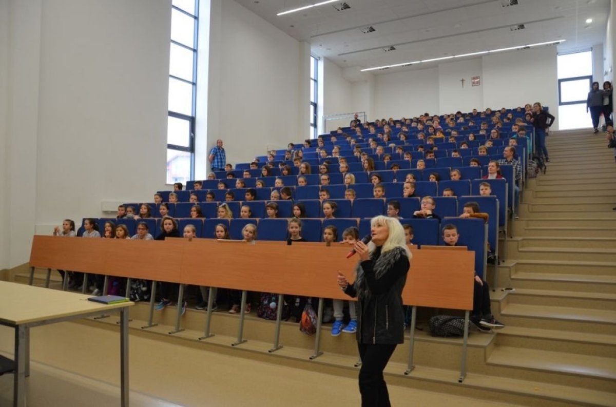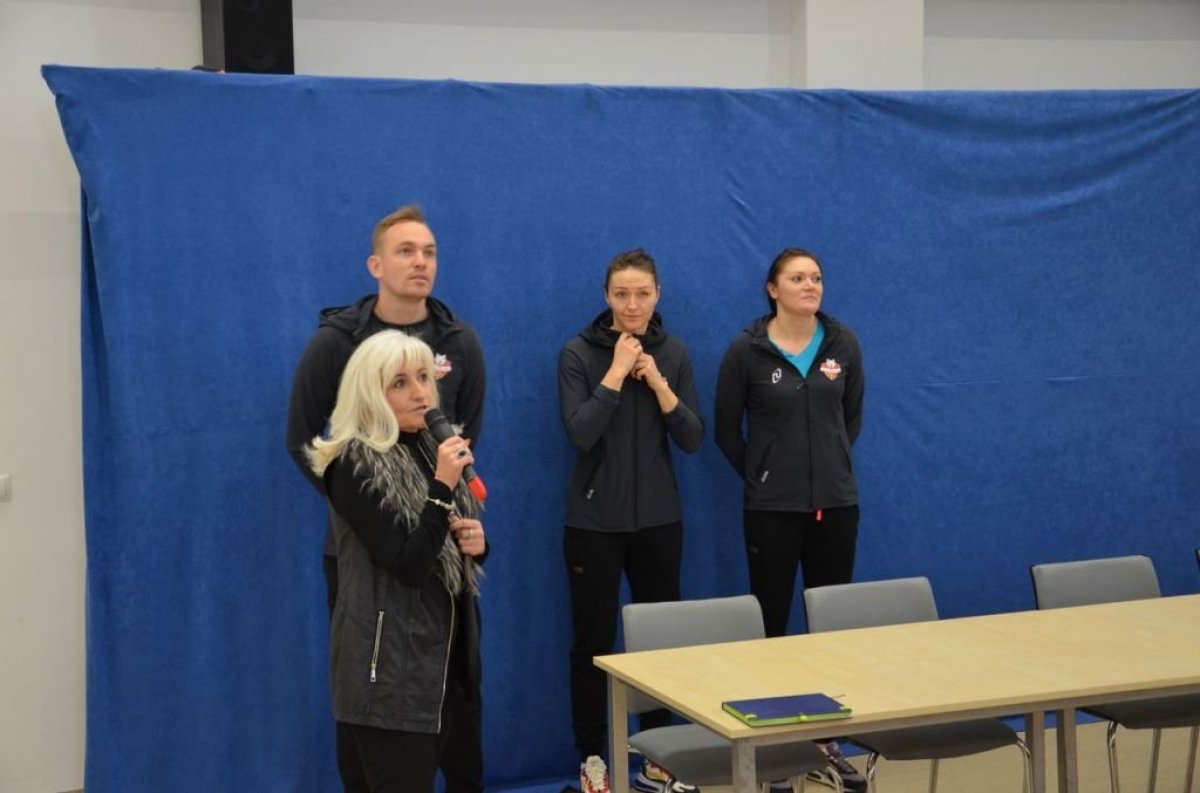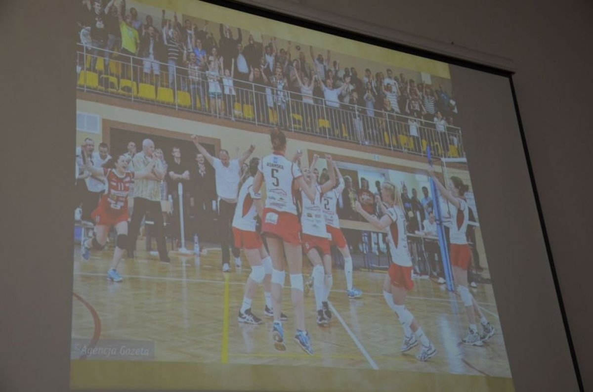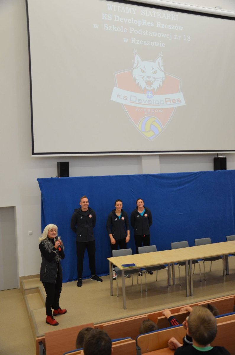Pani Dyrektor, Grażyna Lachcik na wstępie serdecznie przywitała siatkarki i trenera. Spotkanie podzielone był na II części. W pierwszej została przedstawiona prezentacja multimedialna o historii oraz sukcesach klubu, a także sylwetkach naszych gości. Obecni na spotkaniu uczniowie, a także nauczyciele mogli dowiedzieć się jak bardzo utytułowane są siatkarki Developresu Rzeszów oraz trener. Ta część spotkanie zakończyła się pytaniami do naszych gość na różne tematy.