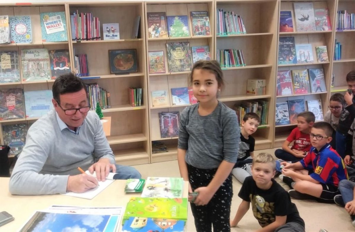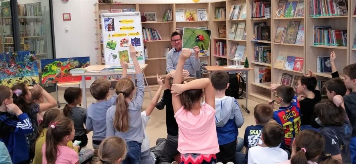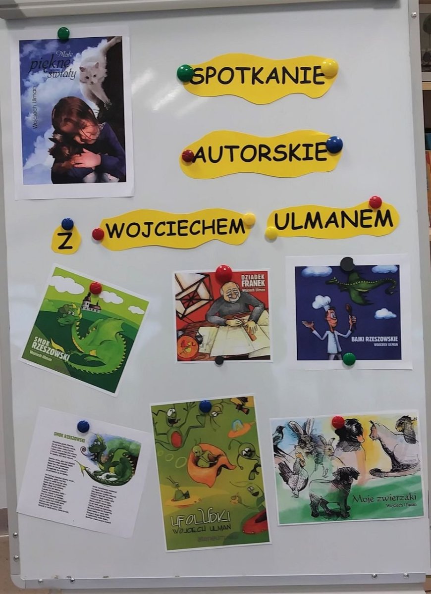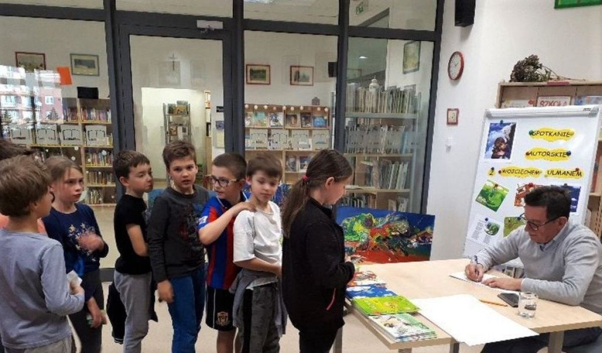 W dniu 10 grudnia 2019r w bibliotece szkolnej odbyło się spotkanie autorskie z regionalnym pisarzem i artystą, fotografem, autorem książek dla dzieci (m.in. „Moje zwierzaki", „Ufoludki", „Małe piękne światy”) – Wojciechem Ulmanem. Na spotkanie zostali zaproszeni uczniowie klas 3c oraz 3e. Zgromadzeni uczestnicy mieli niepowtarzalną okazję poznać osobiście pisarza. Pan Wojciech Ulman na początku spotkania opowiedział o swojej drodze zawodowej i sposobie, w jaki rozpoczął przygodę z pisaniem książek do młodego czytelnika. Artysta pokazał i opowiedział dzieciom o swoich zdjęciach oraz obrazach, które poruszyły wyobraźnię uczestników spotkania. Uczniowie od razu zauważyli pasję z jaką pisarz opowiada o swoich dziełach i z zaciekawieniem wsłuchiwali się w jego opowiadania. Po zajęciach każde dziecko otrzymało książkę autorstwa Wojciecha Ulmana wraz z dedykacją oraz autografem.