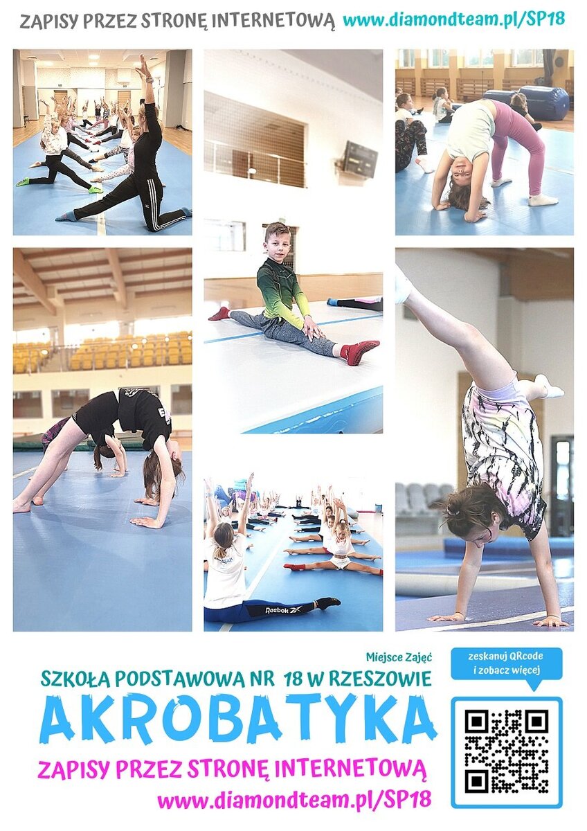 Zachęcamy naszych uczniów do zapisania się na zajęcia z akrobatyki, które będą odbywać się w naszej szkole. Więcej informacji wraz z linkiem do zapisów można znaleźć na stronie: www.diamondteam.pl/akrobatyka lub www.diamondteam.pl/sp18