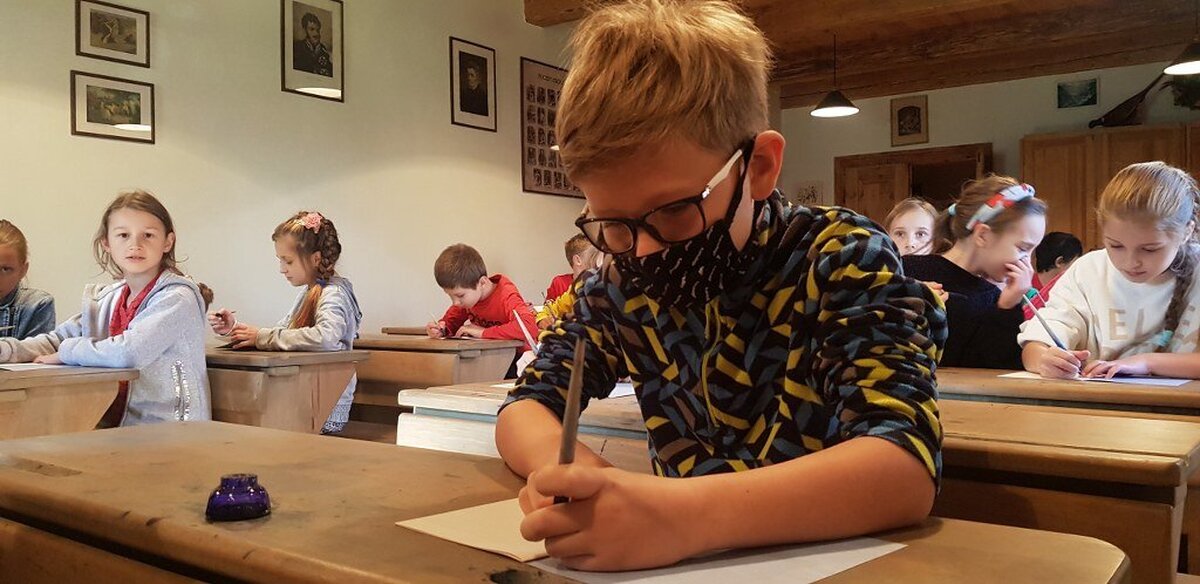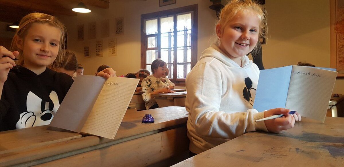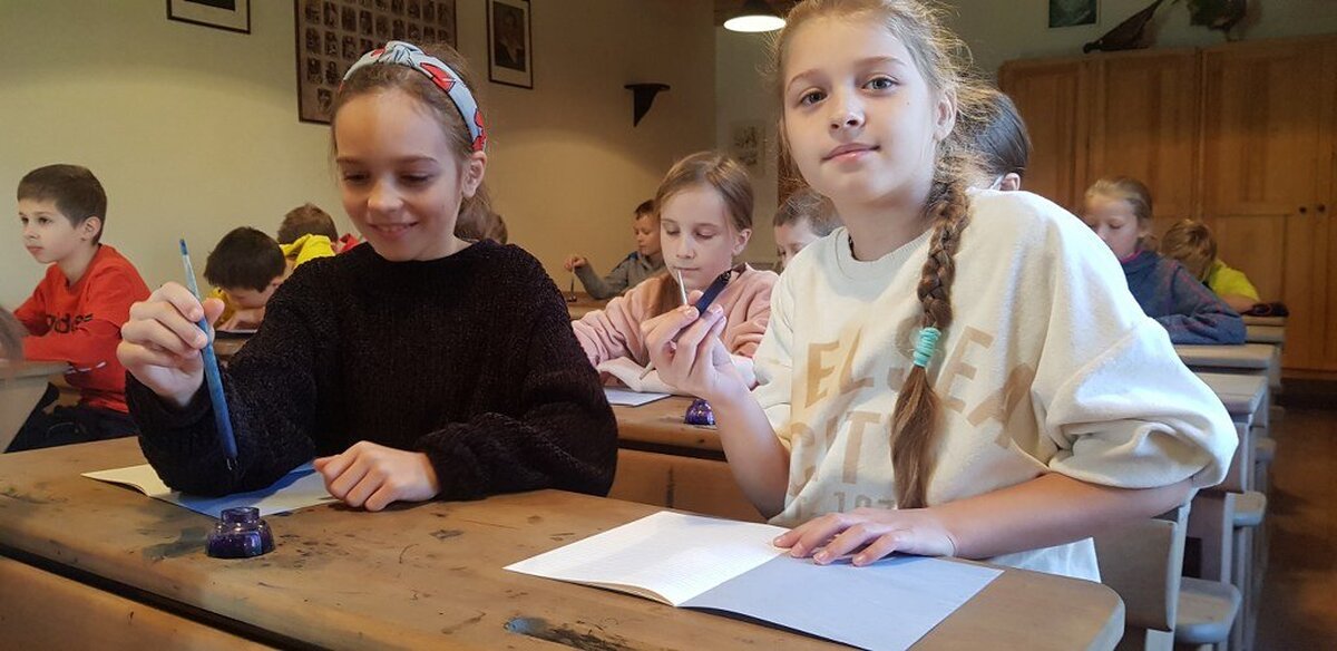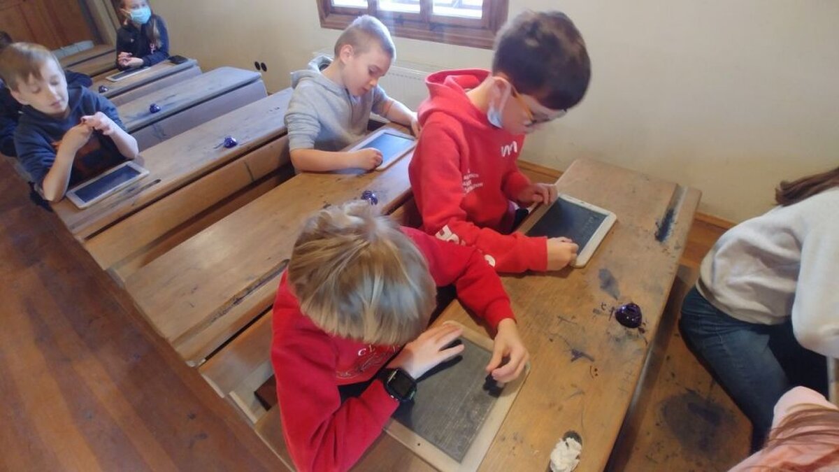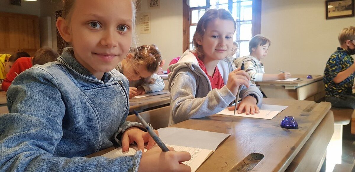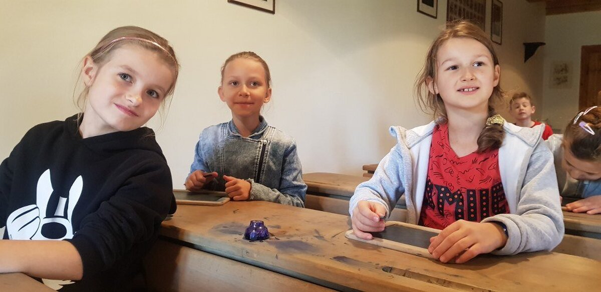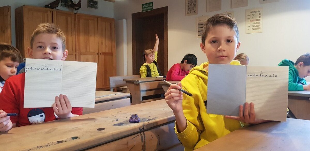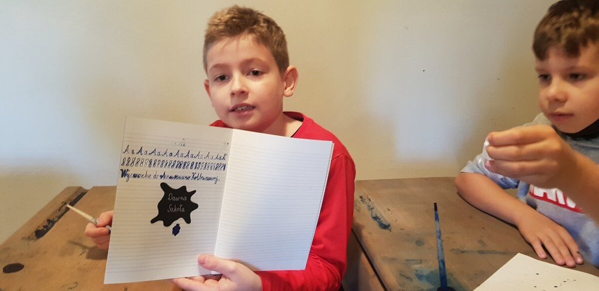 Uczniowie uczestniczyli również w warsztatach pt. „W dawnej klasie – lekcja kaligrafii”. Była to znakomita lekcja historii- prawdziwy powrót do przeszłości ! Siedząc w dawnych ławach, dzieci wcieliły się w uczniów sprzed stu lat i na własnej skórze przekonały się, jak to w dawniej szkole bywało… Uczniowie doświadczyli pisania rysikiem na tabliczkach oraz stalówką maczaną w kałamarzu z atramentem. W nagrodę za piękne pisanie dzieci otrzymały zeszyty do kaligrafii.