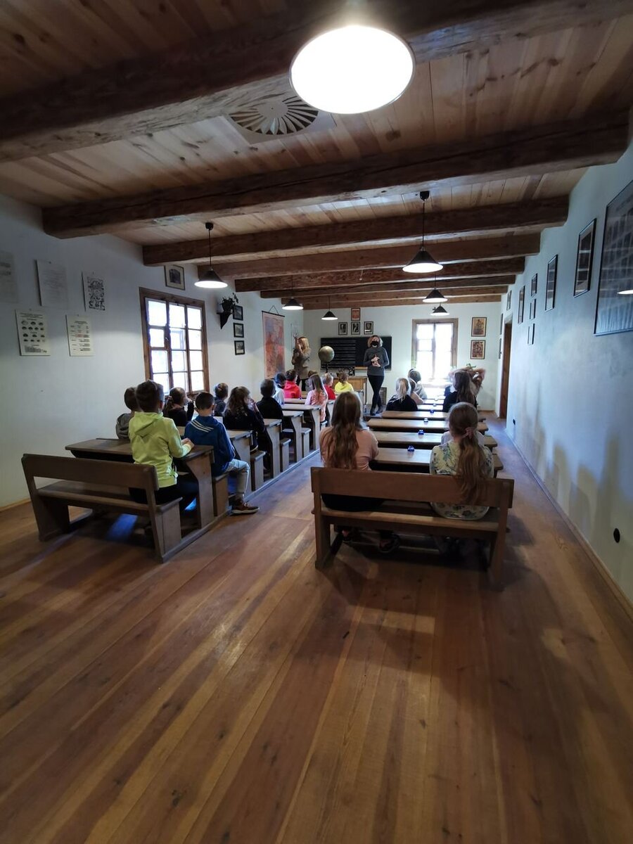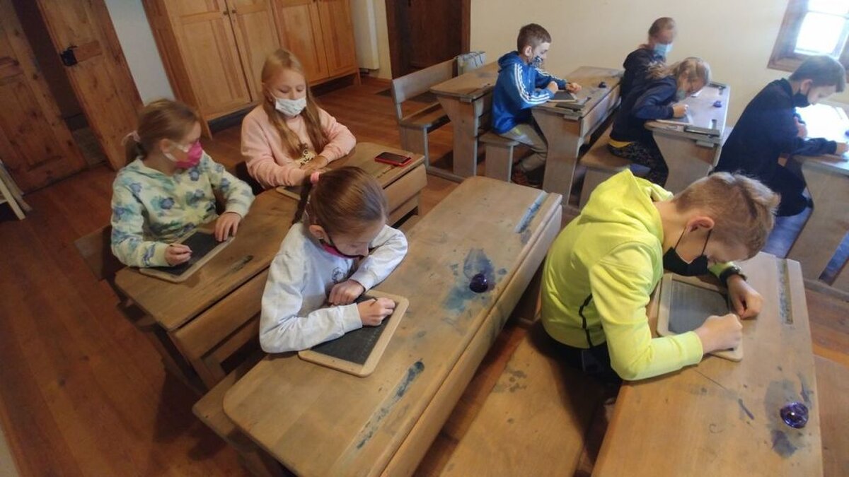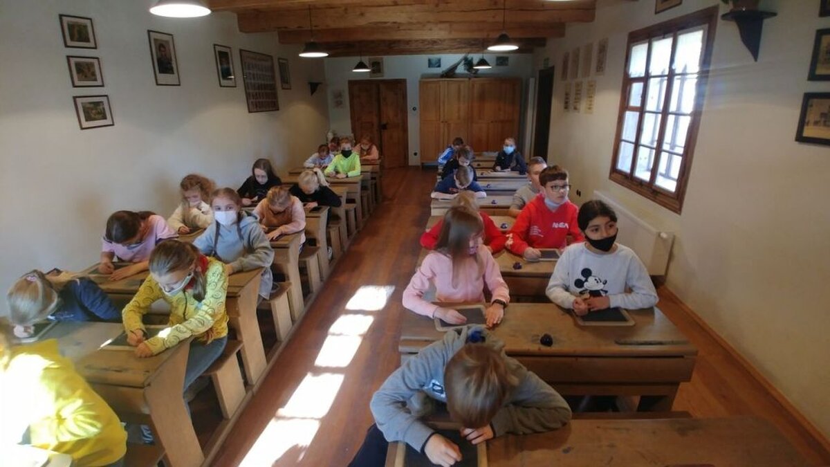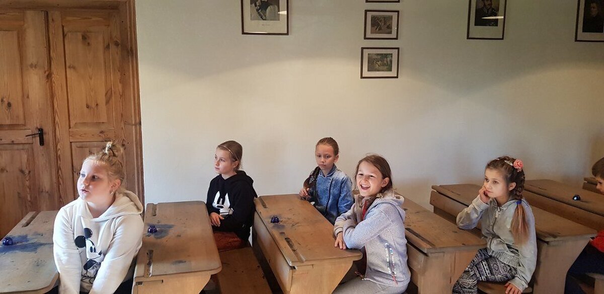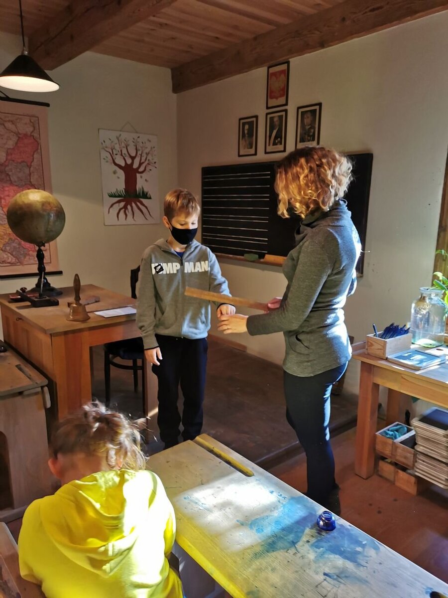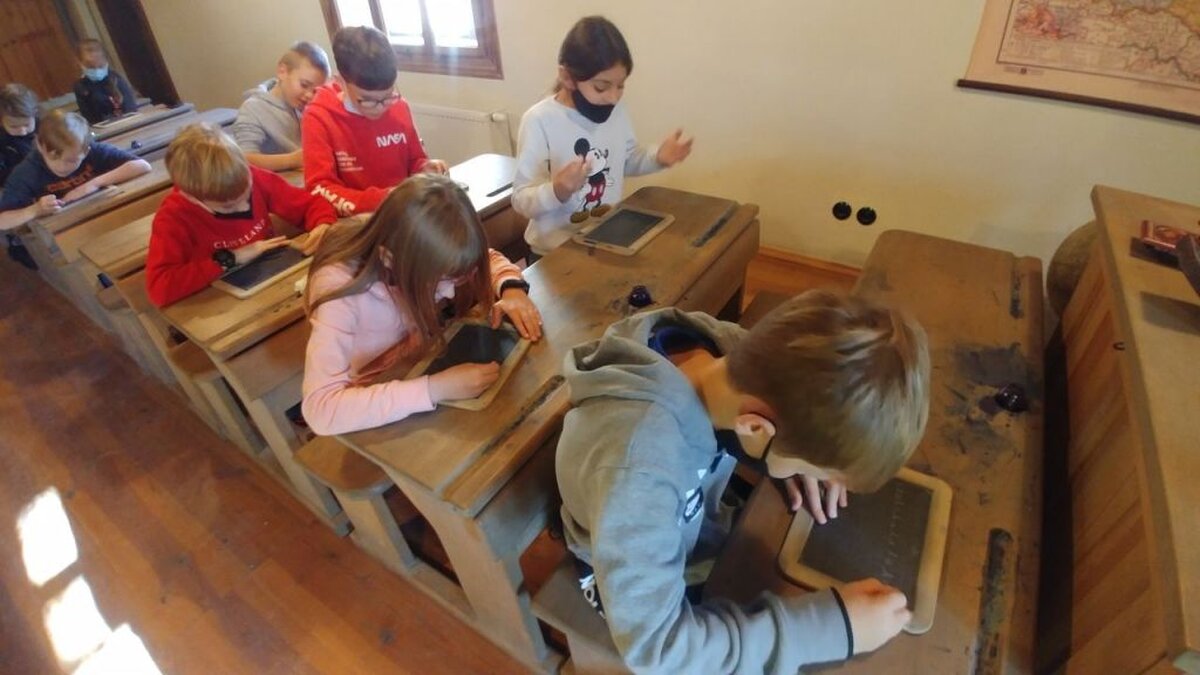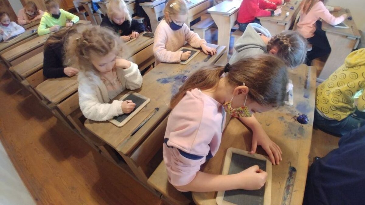 Uczniowie uczestniczyli również w warsztatach pt. „W dawnej klasie – lekcja kaligrafii”. Była to znakomita lekcja historii- prawdziwy powrót do przeszłości ! Siedząc w dawnych ławach, dzieci wcieliły się w uczniów sprzed stu lat i na własnej skórze przekonały się, jak to w dawniej szkole bywało… Uczniowie doświadczyli pisania rysikiem na tabliczkach oraz stalówką maczaną w kałamarzu z atramentem. W nagrodę za piękne pisanie dzieci otrzymały zeszyty do kaligrafii.
