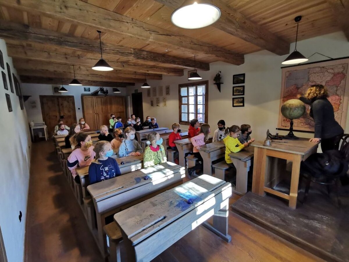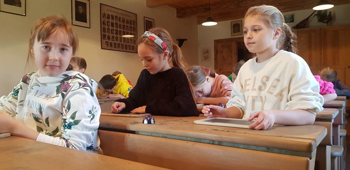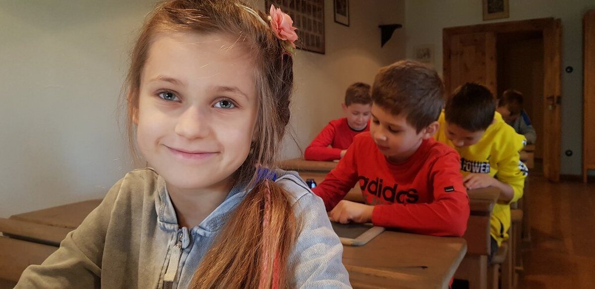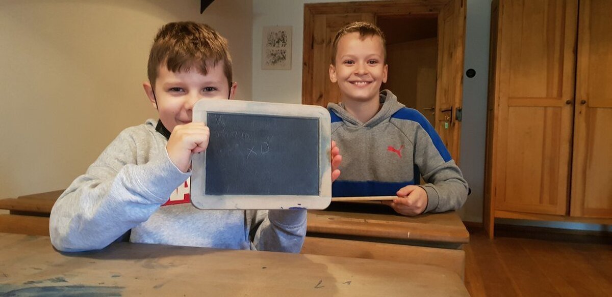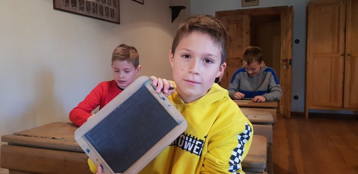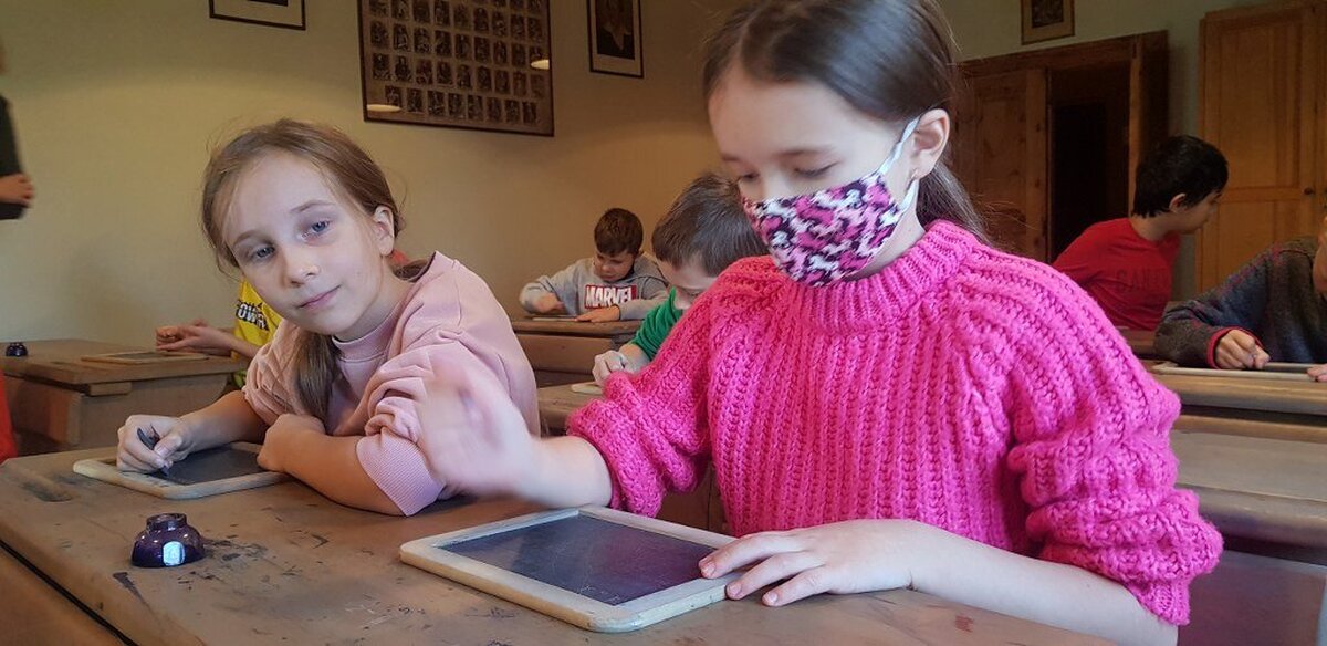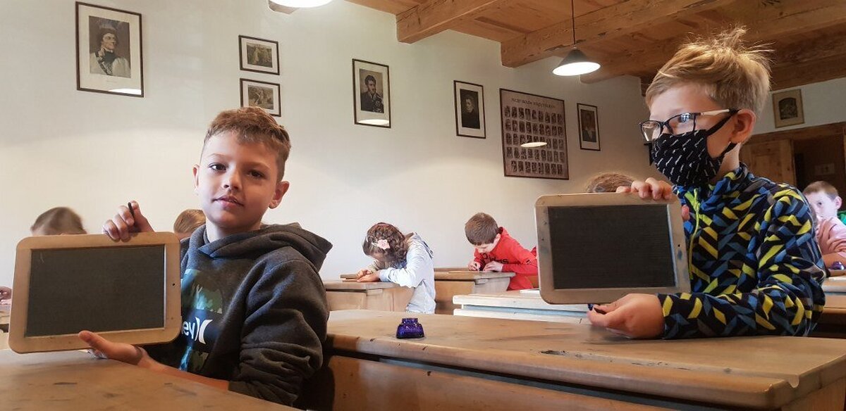 Uczniowie uczestniczyli również w warsztatach pt. „W dawnej klasie – lekcja kaligrafii”. Była to znakomita lekcja historii- prawdziwy powrót do przeszłości ! Siedząc w dawnych ławach, dzieci wcieliły się w uczniów sprzed stu lat i na własnej skórze przekonały się, jak to w dawniej szkole bywało… Uczniowie doświadczyli pisania rysikiem na tabliczkach oraz stalówką maczaną w kałamarzu z atramentem. W nagrodę za piękne pisanie dzieci otrzymały zeszyty do kaligrafii.