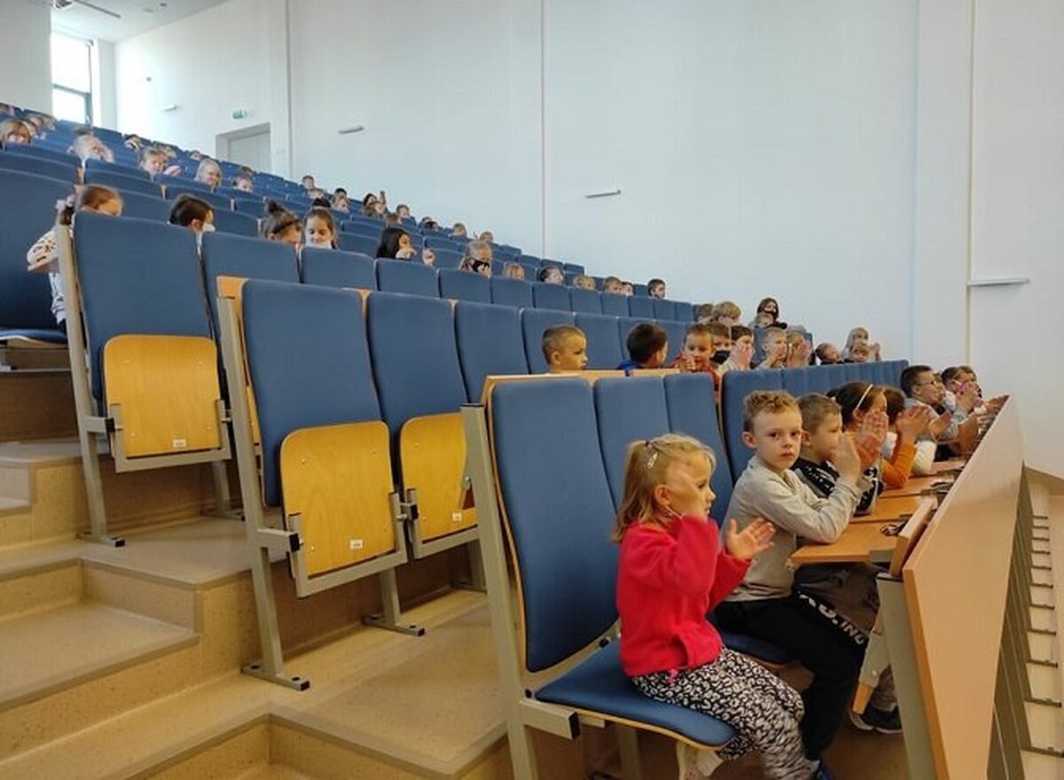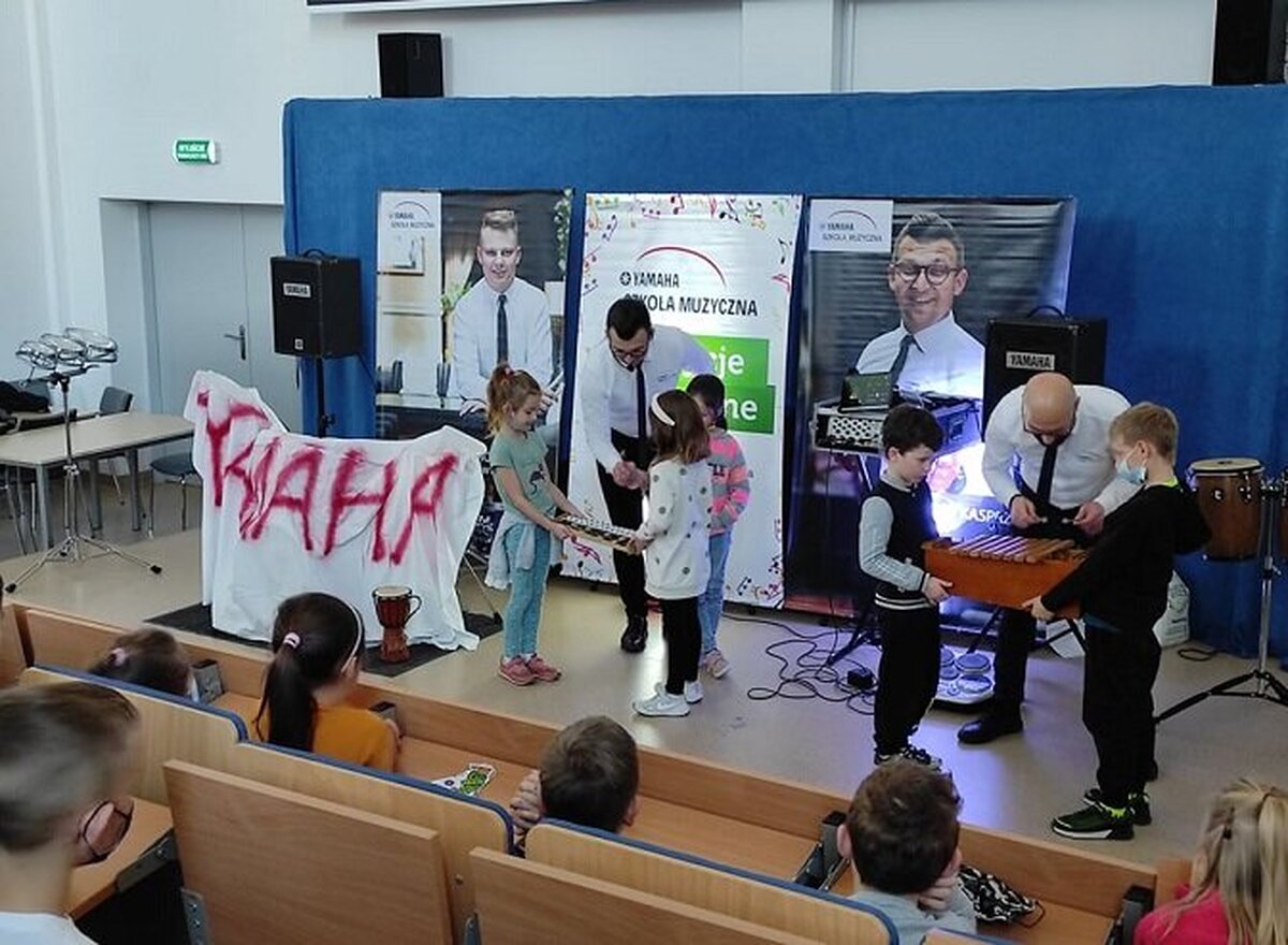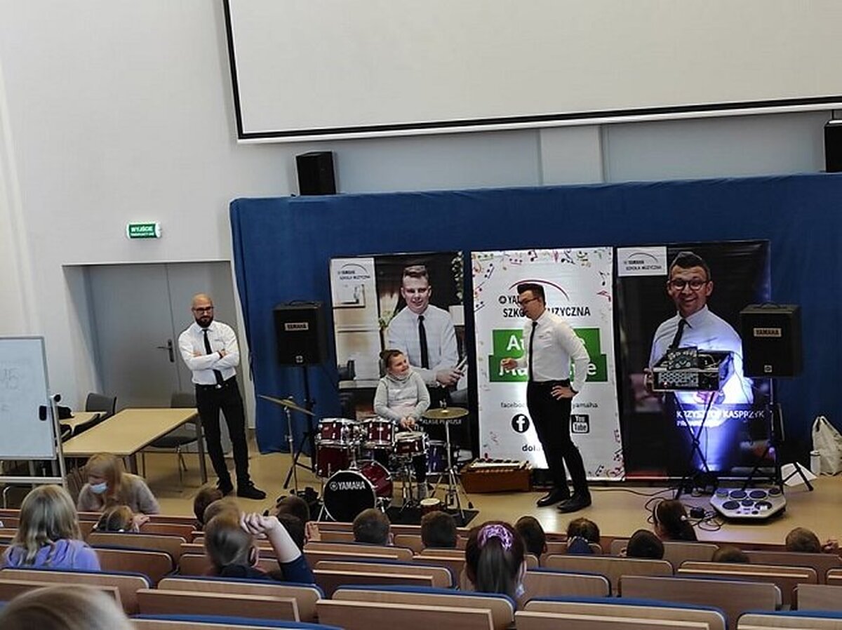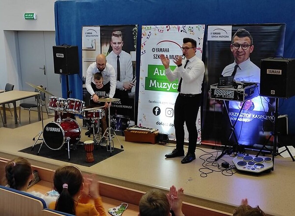 16 listopada 2021r. uczniowie edukacji wczesnoszkolnej uczestniczyli w kolejnych audycjach muzycznych Szkoły Muzycznej Yamaha. Podczas spotkania zostały przedstawione instrumenty perkusyjne, używane w różnych zakątkach świata. Pierwsze z nich to Kongi- bębny afrykańskie, które stanowią integralną część tradycyjnej kubańskiej kultury i muzyki. Pozostając w klimatach afrykańskich, prowadzący zaprezentowali Djembe, następny rodzaj bębna. Na scenie pojawiły się również Rototomy- instrument perkusyjny, z którego można wydobyć brzmienie różnej wysokości. Z pomocą nauczycieli prowadzących audycje, uczniowie mieli możliwość zaprezentowania swoich umiejętności gry na dzwonkach i ksylofonie. Największym i ostatnim z zaprezentowanych instrumentów był zestaw perkusyjny. Uczniowie z wielkim entuzjazmem wsłuchiwali się w muzykę, do której chętnie tańczyli i wyklaskiwali rytmy.