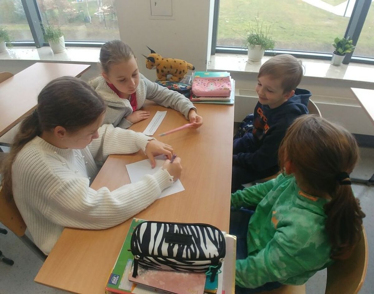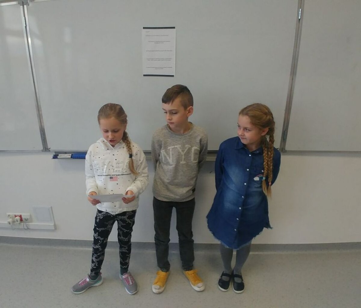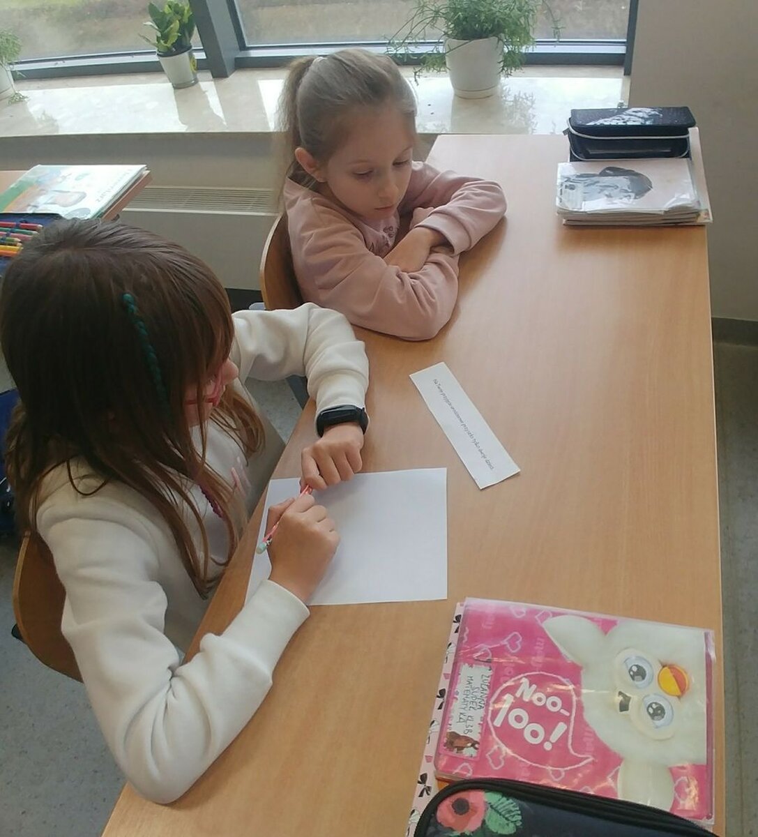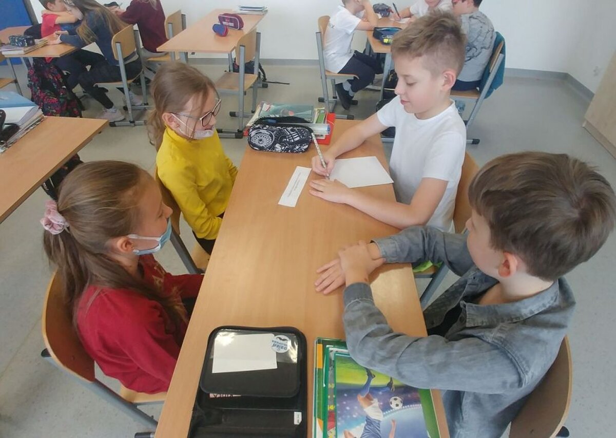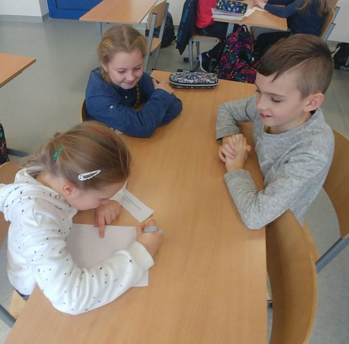 Uczniowie klasy 3b podczas realizacji projektu edukacyjnego Mądre bajki z całego świata wspólnie wysłuchali treści opowiadania pt. „Jak Maisa z Naimą na jeden dzień życiem się zamieniły”, a następnie porozmawiali na temat miłych i trudnych sytuacji przedstawionych w treści bajki. W dalszej części spotkania uczniowie zostali podzieleni na grupy, gdzie zadaniem każdej z nich było wylosowanie karteczki z opisem sytuacji oraz znalezienie jej jasnych stron. Następnie każda spośród grup odczytała wypracowane wspólne rozwiązania. Dzięki temu spotkaniu uczniowie mogli spojrzeć na sytuacje z innej perspektywy i odnaleźć pozytywne strony każdej okoliczności. Ponadto odwaga, otwartość na innych, szukanie porozumienia to postawy, które kształtowane były podczas pracy wśród uczniów.