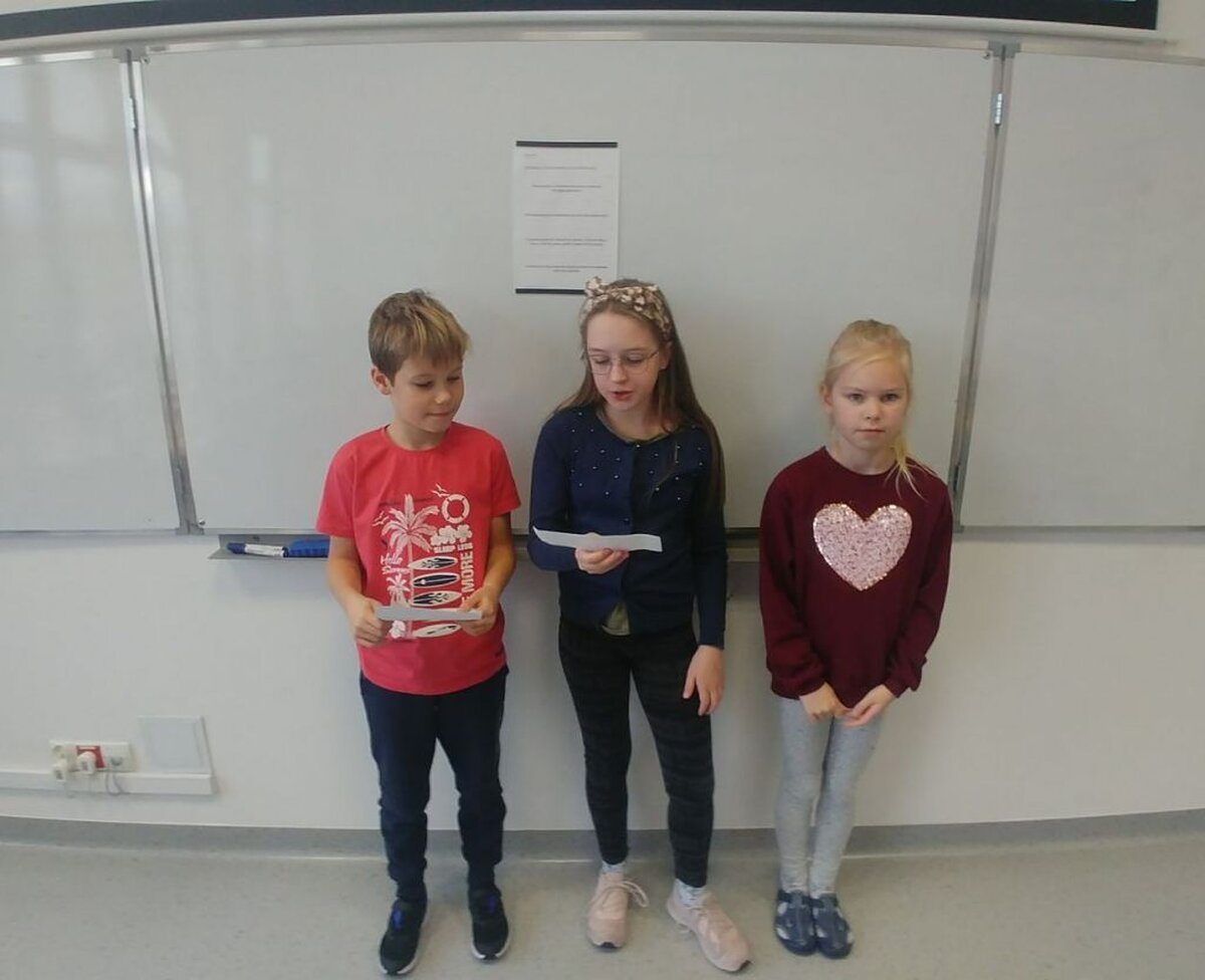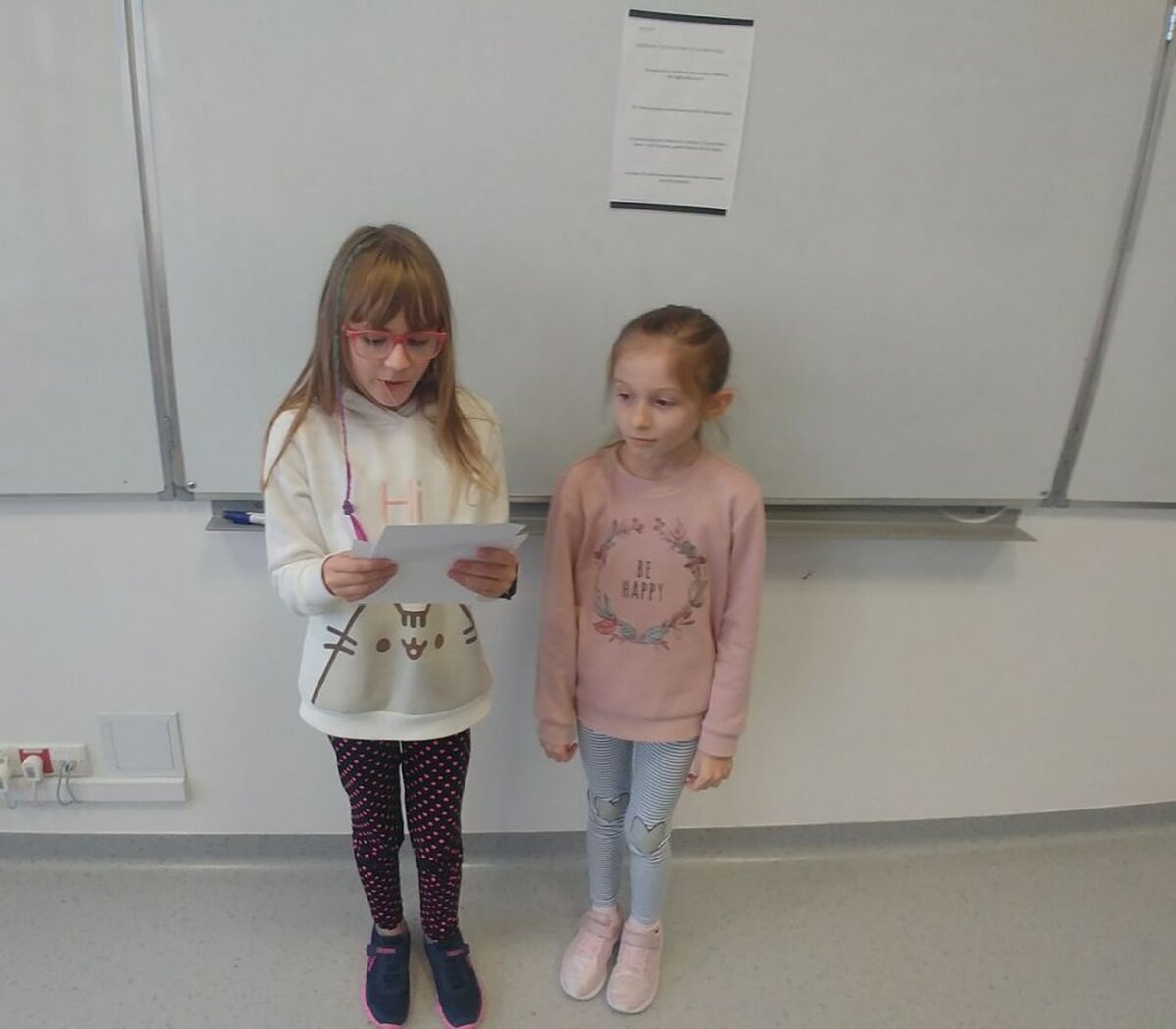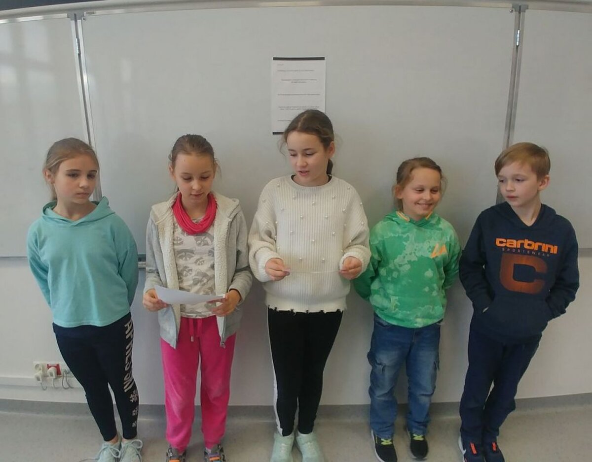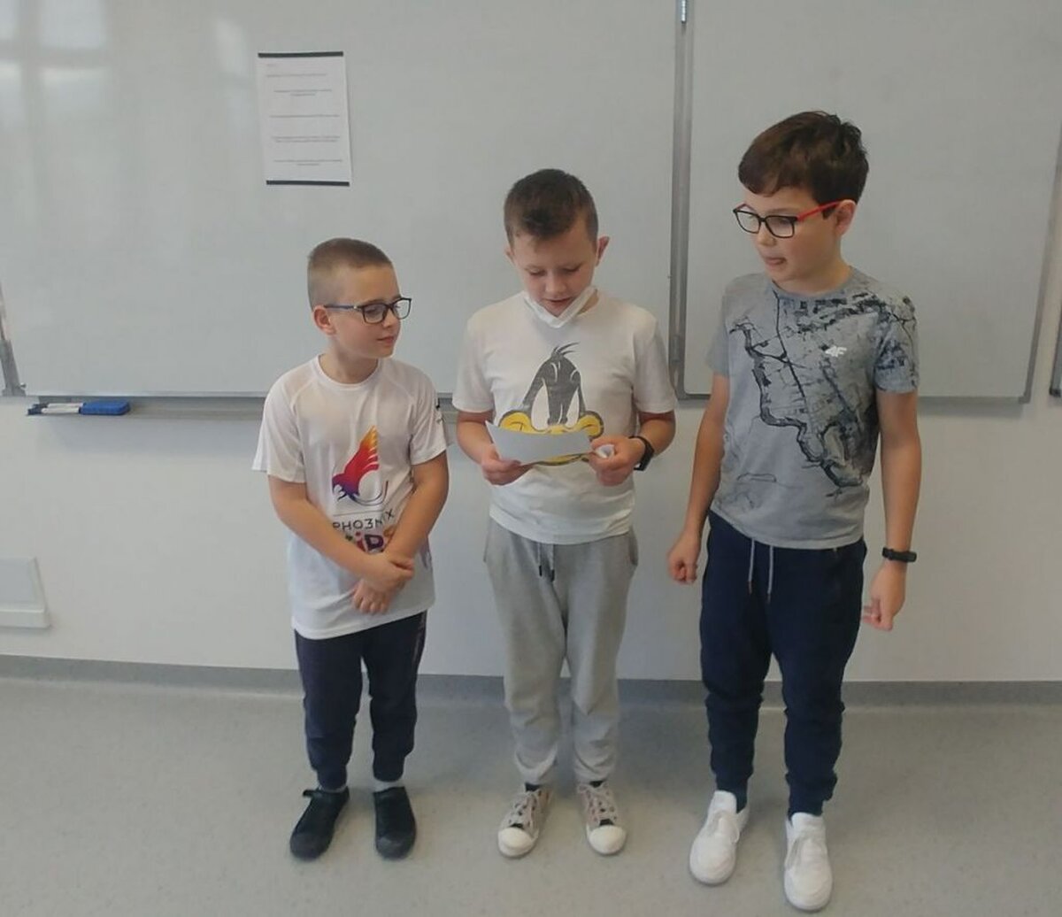 Uczniowie klasy 3b podczas realizacji projektu edukacyjnego Mądre bajki z całego świata wspólnie wysłuchali treści opowiadania pt. „Jak Maisa z Naimą na jeden dzień życiem się zamieniły”, a następnie porozmawiali na temat miłych i trudnych sytuacji przedstawionych w treści bajki. W dalszej części spotkania uczniowie zostali podzieleni na grupy, gdzie zadaniem każdej z nich było wylosowanie karteczki z opisem sytuacji oraz znalezienie jej jasnych stron. Następnie każda spośród grup odczytała wypracowane wspólne rozwiązania. Dzięki temu spotkaniu uczniowie mogli spojrzeć na sytuacje z innej perspektywy i odnaleźć pozytywne strony każdej okoliczności. Ponadto odwaga, otwartość na innych, szukanie porozumienia to postawy, które kształtowane były podczas pracy wśród uczniów.