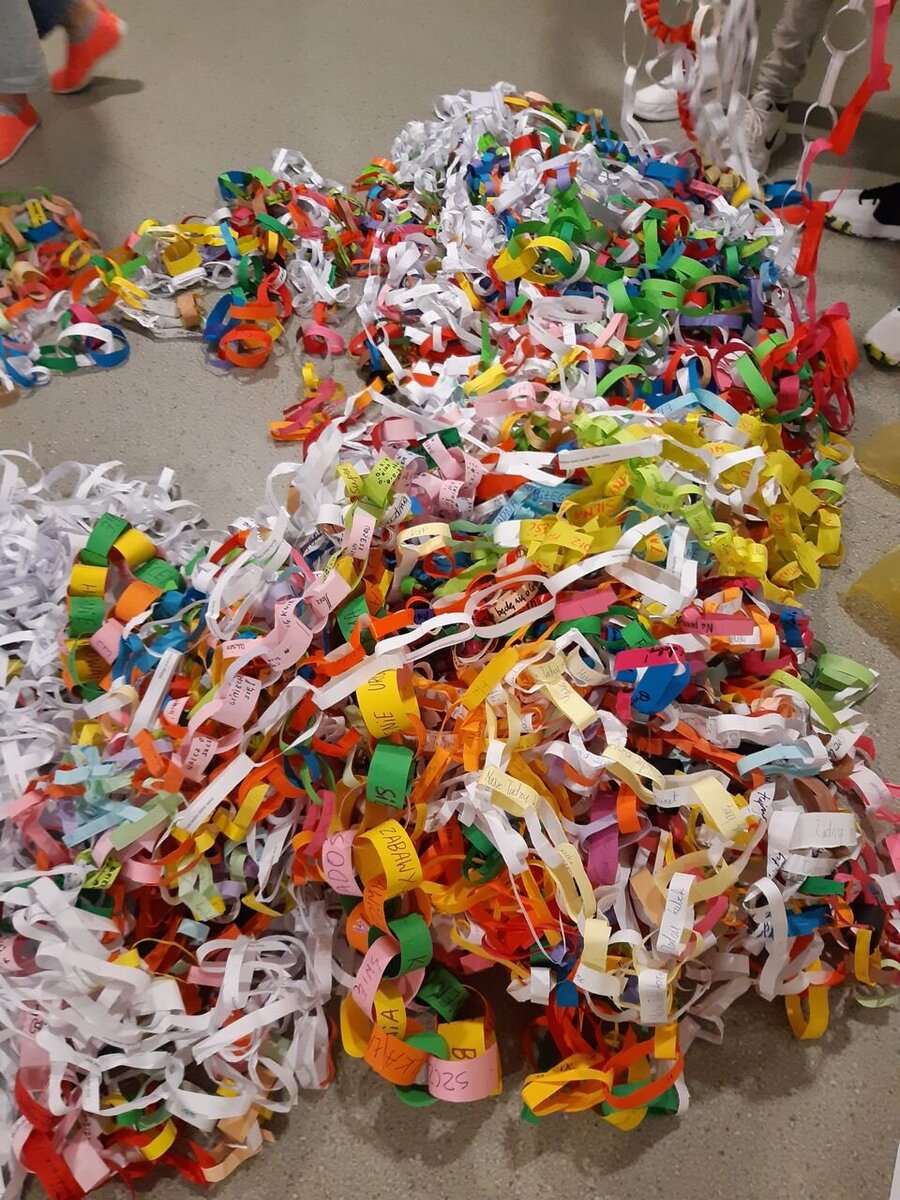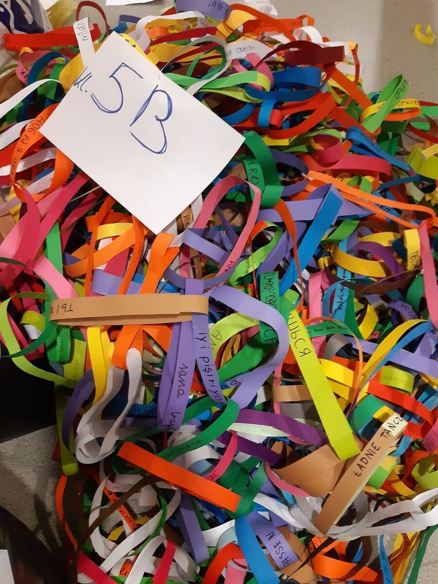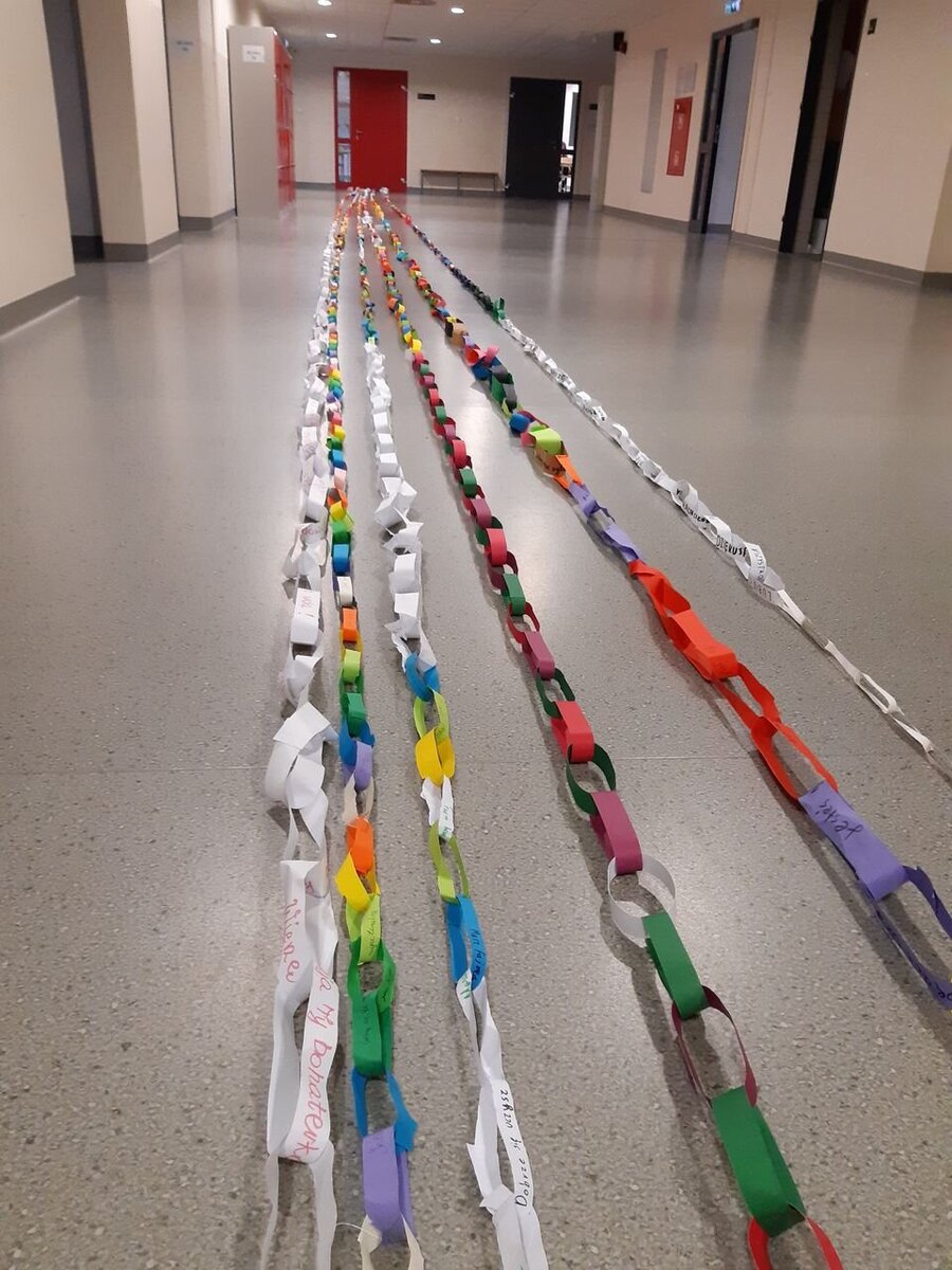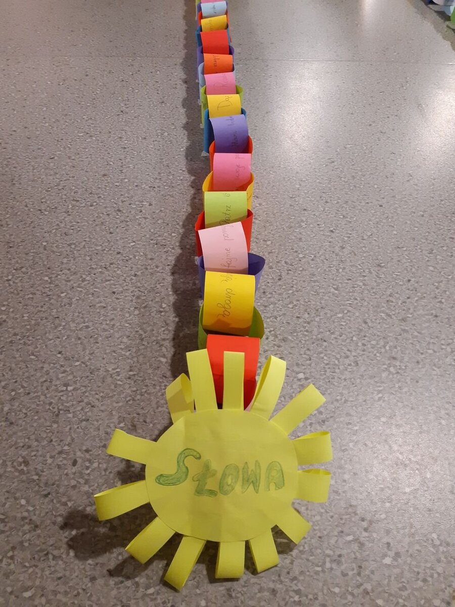 Kolejną akcją był „ Łańcuch Życzliwości”, polegał na wykonaniu przez poszczególne klasy najdłuższego łańcucha miłych słów i pozdrowień. Zgadnijcie, ile kilometrów łańcucha- tak, tak dobrze czytacie kilometrów wykonali nasi uczniowie?