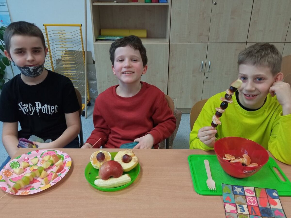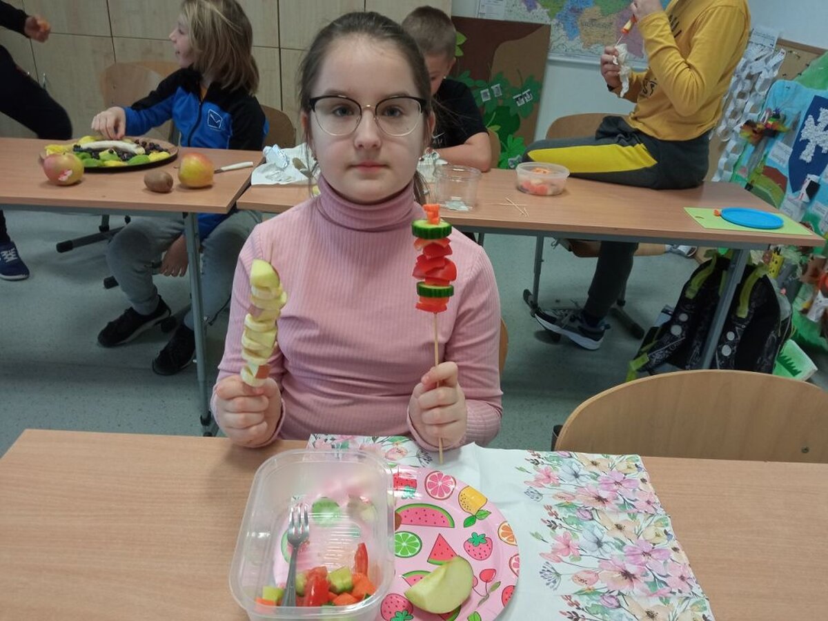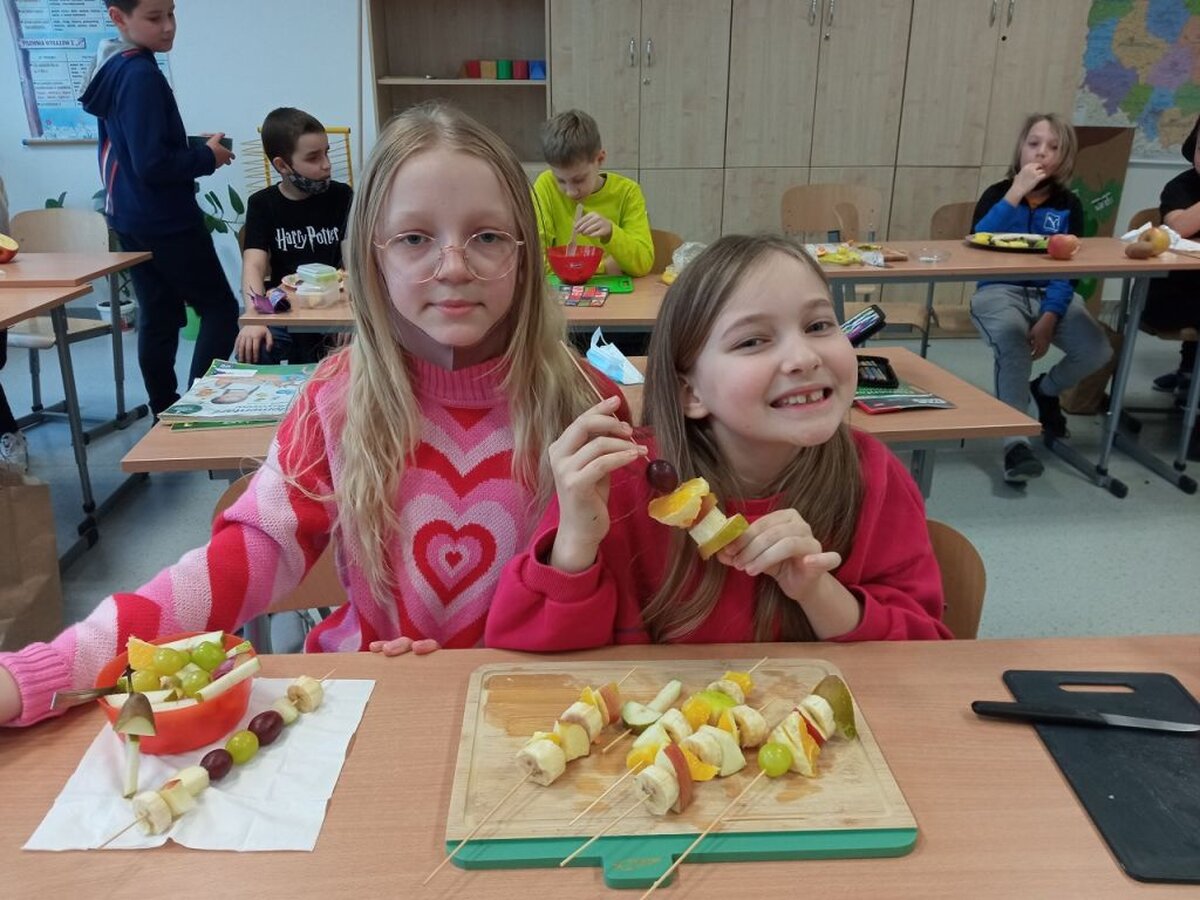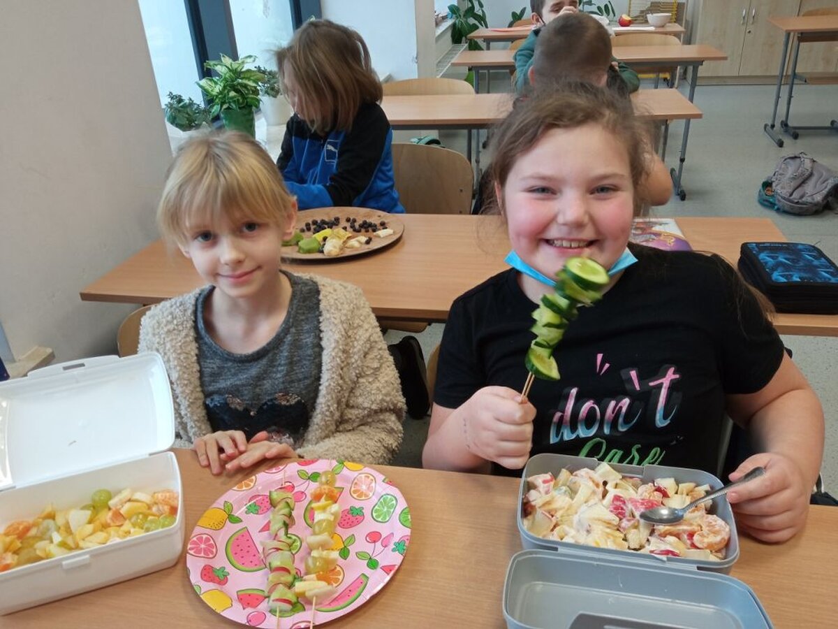 W ramach ogólnopolskiego projektu „Z ekologią na Ty” klasa 3e zorganizowała Dzień Zdrowego Śniadania. Uczniowie wykonali własnoręcznie zdrowe przekąski z owoców i warzyw w formie sałatek i szaszłyków. Dzięki lekcji uczniowie zwiększyli świadomość na temat zdrowego odżywiania oraz roli śniadania w codziennej diecie, jak również ćwiczyli samodzielność podczas przygotowywania posiłku. Na koniec lekcji dzieci ze smakiem zjadły zdrowe pyszności.