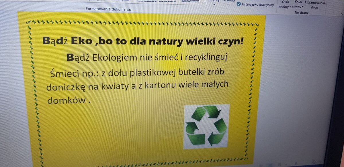 W ramach realizacji projektu edukacyjnego „ Z Ekologią na Ty” uczniowie klasy 3f wykonali kolejne eko- zadania. Tym razem uczniowie zostali poproszeni o wymyślenie oraz napisanie własnych haseł reklamowych związanych z ekologią. Kolejne zadanie również wymagało od uczniów kreatywności oraz pomysłowości, ponieważ projektowali własne logo projektu ekologicznego. Przeprowadzone zajęcia uzmysłowiły uczniom, że troska o środowisko jest troską o nas samych!