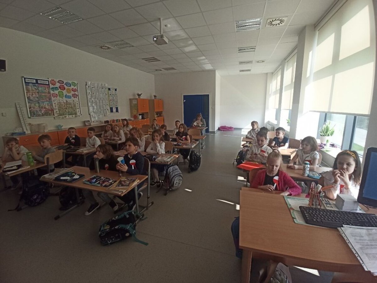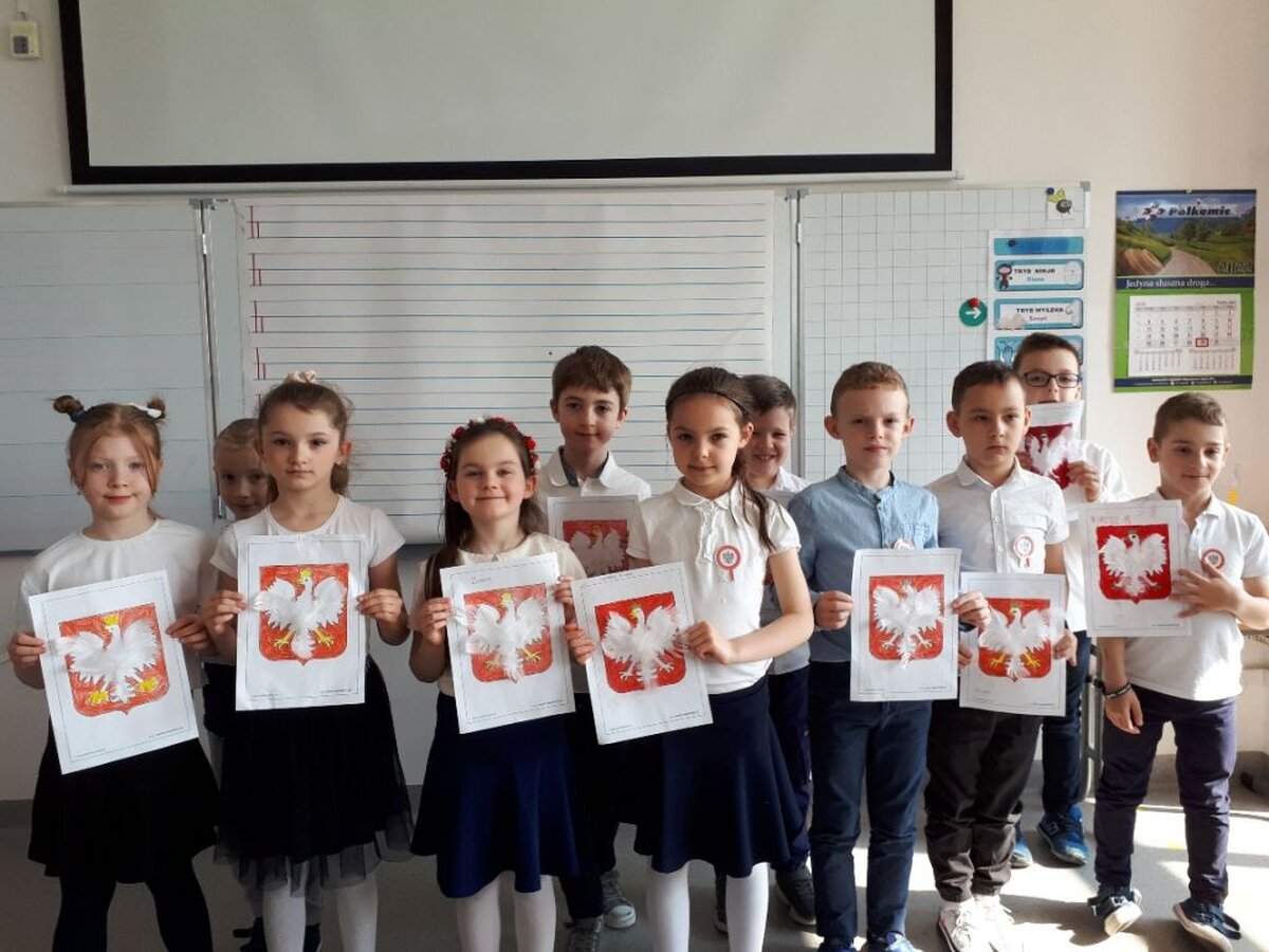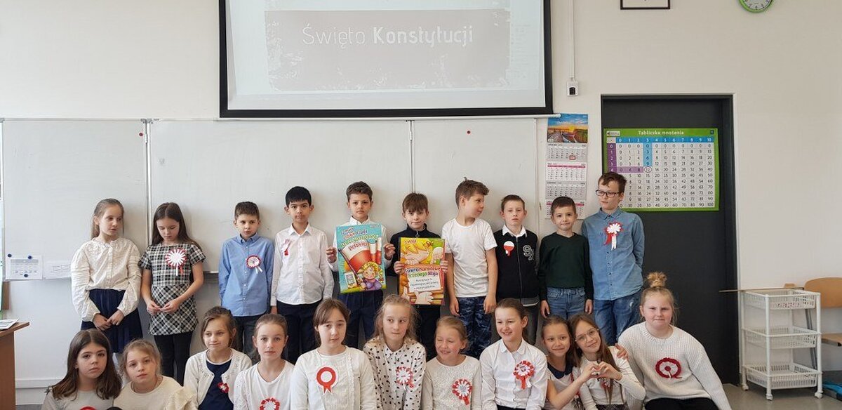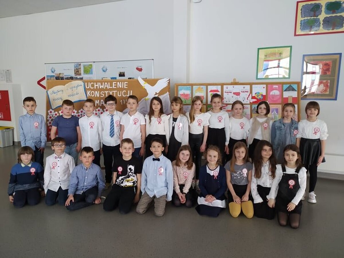 W dniu 29 kwietnia obchodziliśmy w Naszej szkole 231 rocznicę Uchwalenia Konstytucji 3 maja. Z tej okazji wszyscy uczniowie, nauczyciele i pracownicy szkoły założyli odświętne stroje, a na piersiach zawisły biało-czerwone kotyliony. Hol szkoły ozdobiły prace plastyczne przygotowane przez uczniów z klas 1-3 przedstawiające polskie symbole narodowe i scenki okolicznościowe prezentujące uchwalenie Konstytucji. Można też było obejrzeć prezentację multimedialną na temat okoliczności zwołania Sejmu Wielkiego, jego pracy i reform jakie w Rzeczpospolitej wprowadzała Konstytucja 3 maja. Przedstawiono też sylwetki zasłużonych dla dzieła reform działaczy patriotycznych tego okresu. Wszystko to zostało okraszone muzyką patriotyczną. Dodatkowo uczniowie mogli wziąć udział w konkursie poetyckim i przygotowali na niego krótkie utwory rymowane o tematyce świąt obchodzonych na początku maja w naszym kraju. Wszystkie wierszyki przygotowane przez dzieci świadczą o dużej ich wyobraźni, inwencji twórczej i znajomości świąt majowych. Jednak największym powodzeniem cieszył się quiz historyczny związany z Konstytucją. Ilość uczestników jacy wzięli w nim udział zaskoczył organizatorów, a opracowanie jego wyników potrwa zapewne jeszcze kilka najbliższych dni.