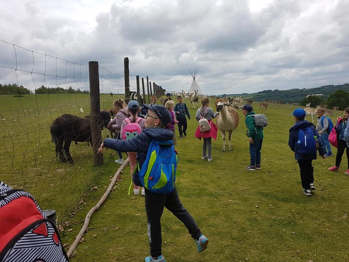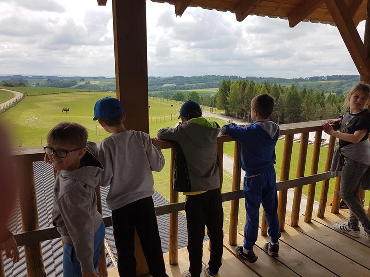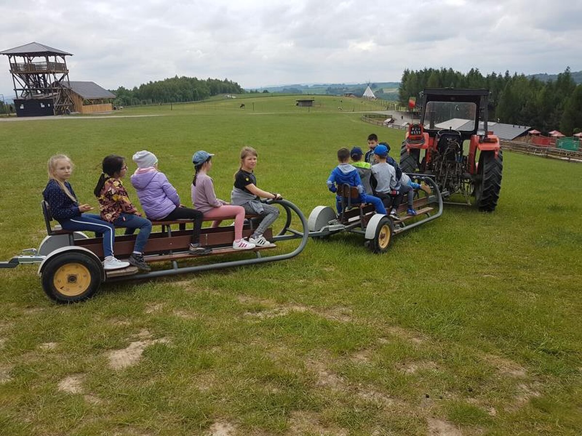 23 maja 2022r. klasy 2c i 2d wybrały się na długo wyczekiwaną wycieczkę do Zagrody Edukacyjnej- Ranczo Pstrągowa. Zagroda okazała się znakomitym miejscem na wypoczynek oraz ciekawą edukację dla wszystkich uczniów. Relaks na łonie natury był miłą okazją do integracji klas. Atrakcje, z których skorzystały dzieci to m. in. Park linowy- „Małpi Gaj”, wyjście na Wieżę widokową, zwiedzanie Mini Zoo (karmienie i głaskanie oswojonych zwierząt), przejazd wozem turystycznym po okolicy, warsztaty- „Pieczenie proziaków”. Nie zabrakło poczęstunku- kiełbaski z grilla, herbaty, napojów i ciasteczek.