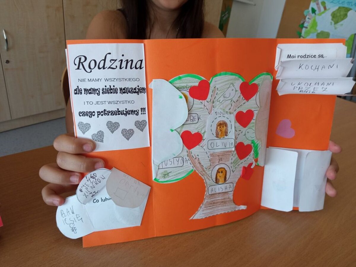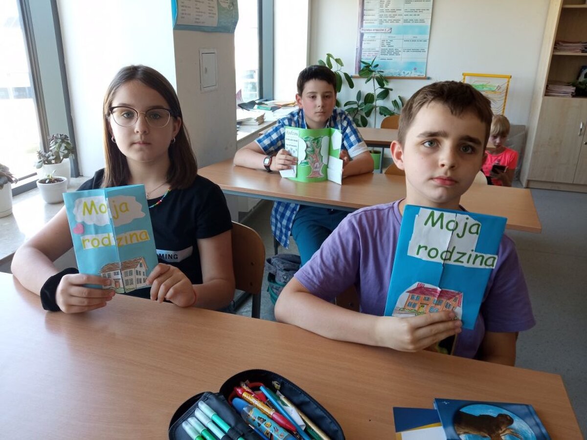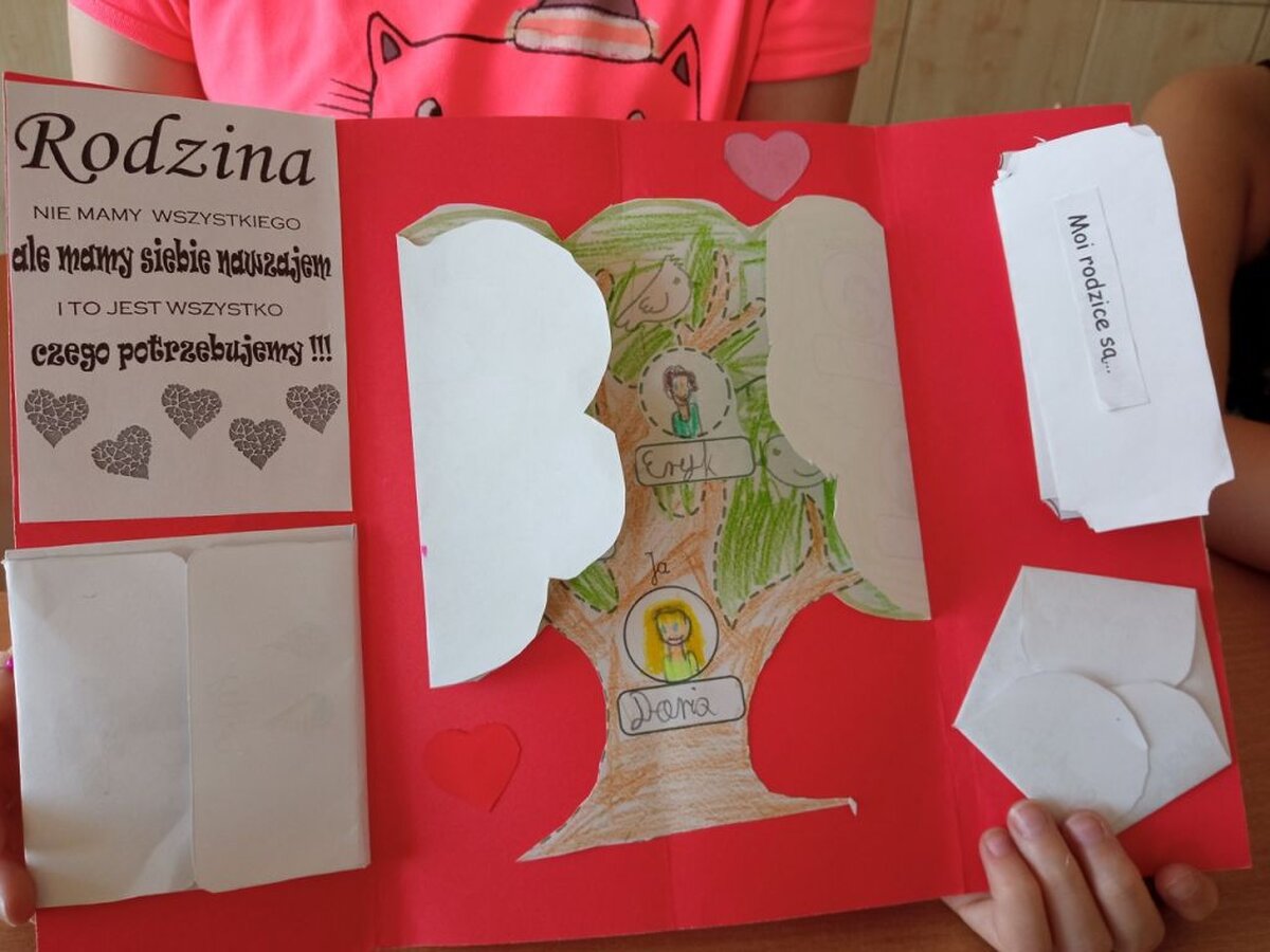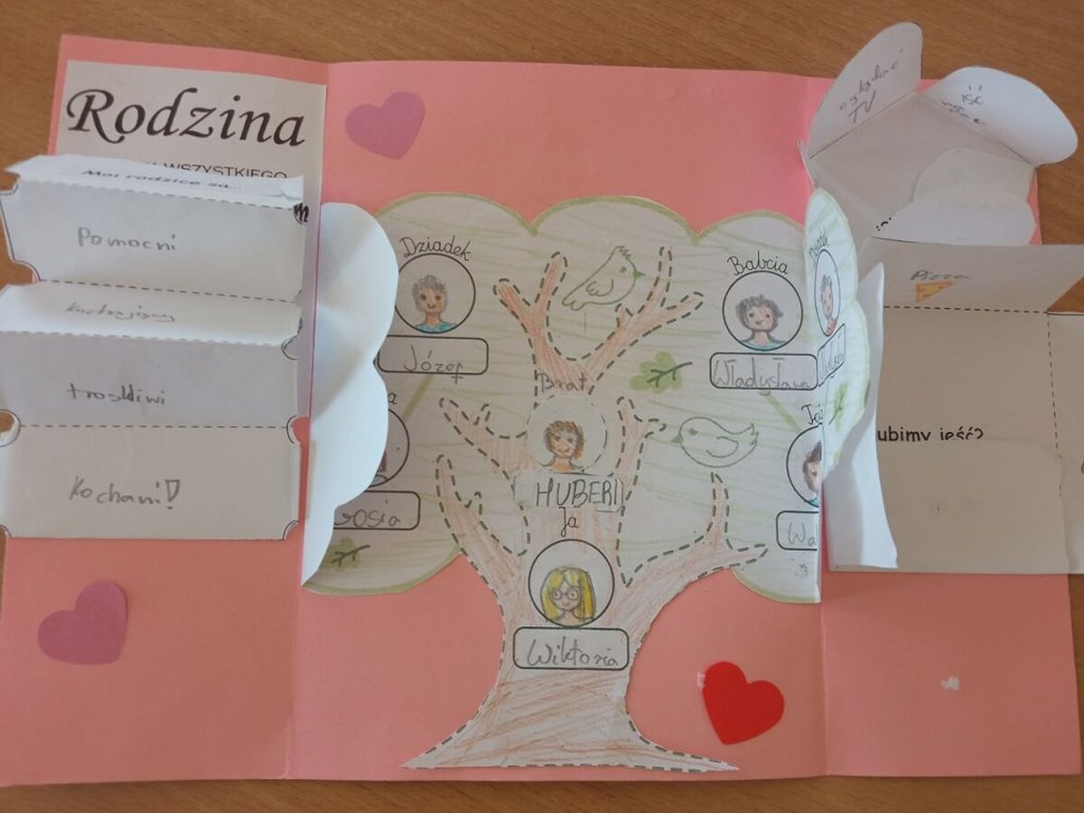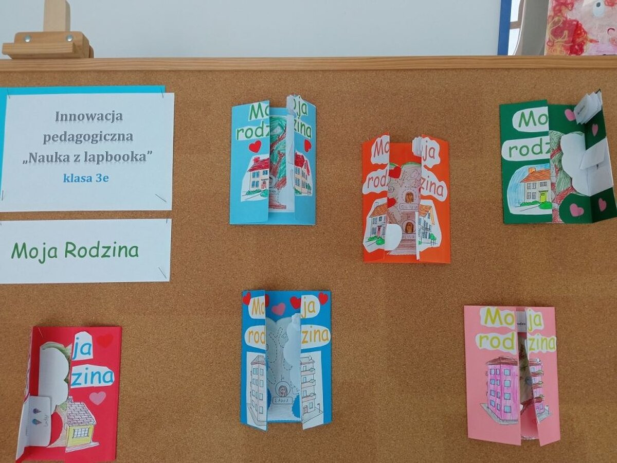 Ostatnią książeczką, którą wykonała klasa 3e podczas zajęć z innowacji pedagogicznej, był lapbook „Moja rodzina”. Dzieci umieściły drzewo genealogiczne swojej rodziny, rysując portrety bliskich i je podpisując. Następnie uczniowie przedstawiali cechy rodziców, tym samym utrwalając przymiotniki. Umieszczali również za pomocą rysunków ulubione potrawy całej rodziny (w ten sposób utrwalili rzeczowniki) oraz pisali lub rysowali, w jaki sposób wszyscy w rodzinie wspólnie spędzają czas. Na koniec omawialiśmy wklejony do lapbooka cytat dotyczący więzi rodzinnych: „Rodzina – nie mamy wszystkiego, ale mamy siebie nawzajem i to jest wszystko, czego potrzebujemy”.
