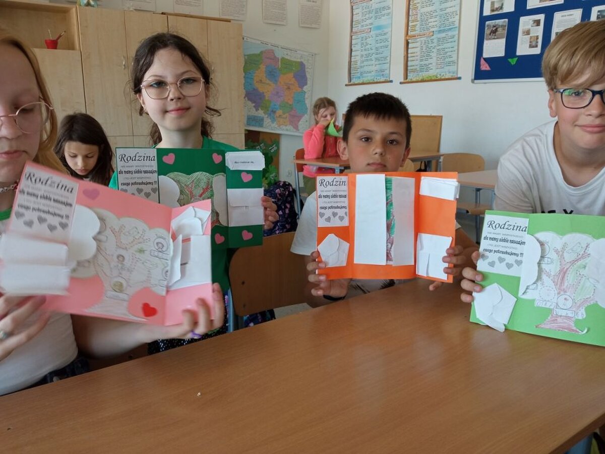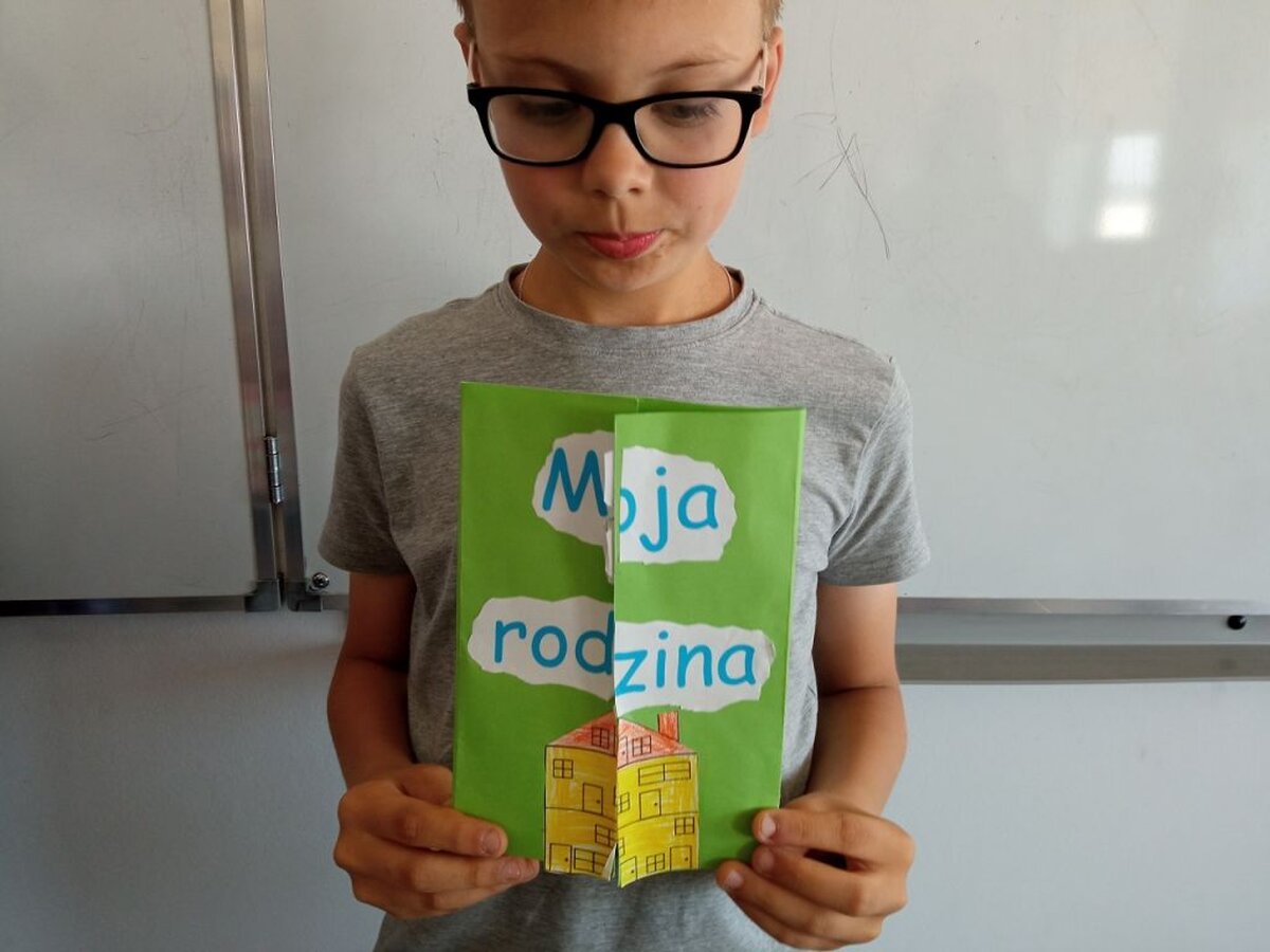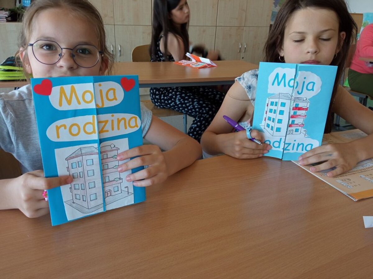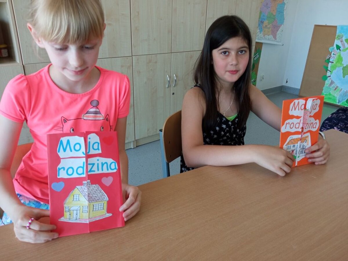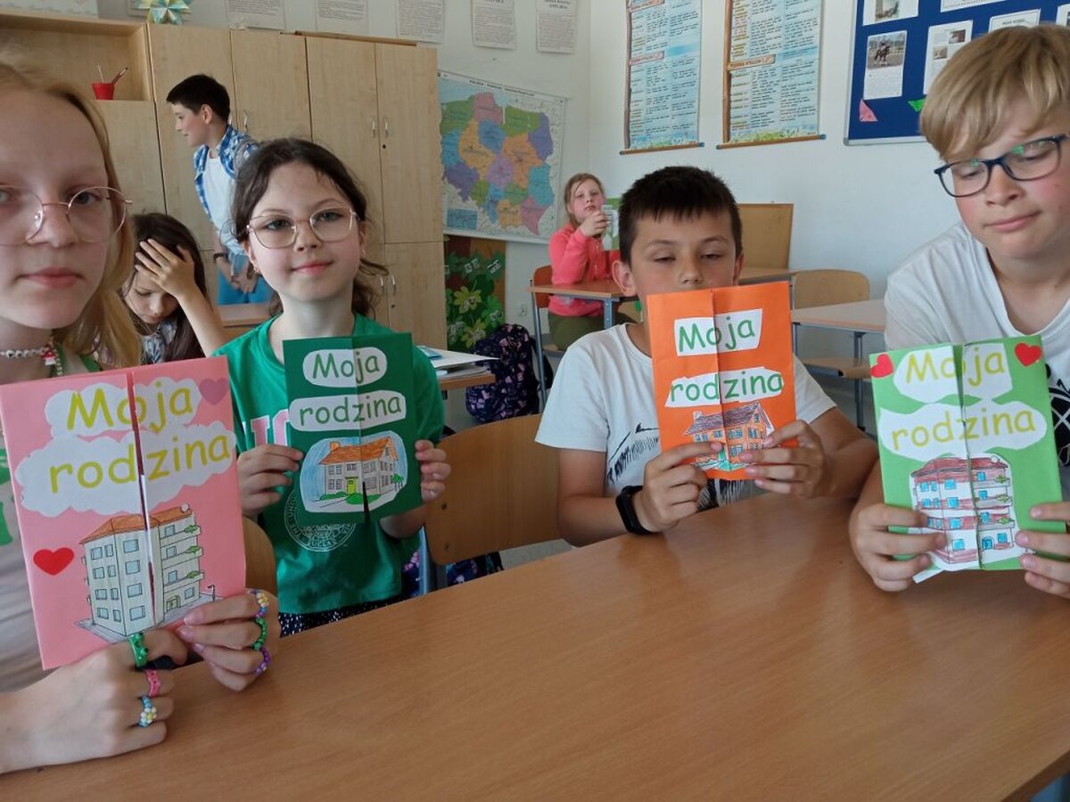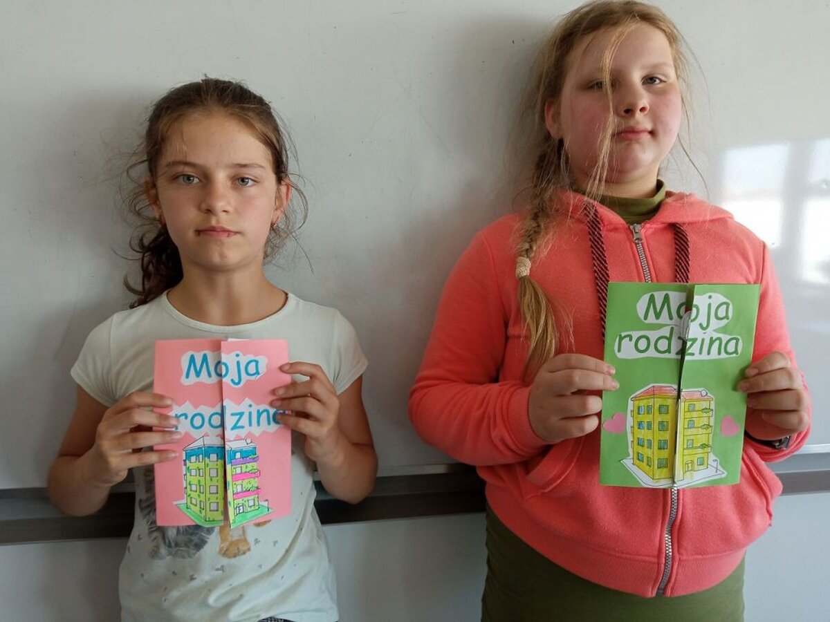 Ostatnią książeczką, którą wykonała klasa 3e podczas zajęć z innowacji pedagogicznej, był lapbook „Moja rodzina”. Dzieci umieściły drzewo genealogiczne swojej rodziny, rysując portrety bliskich i je podpisując. Następnie uczniowie przedstawiali cechy rodziców, tym samym utrwalając przymiotniki. Umieszczali również za pomocą rysunków ulubione potrawy całej rodziny (w ten sposób utrwalili rzeczowniki) oraz pisali lub rysowali, w jaki sposób wszyscy w rodzinie wspólnie spędzają czas. Na koniec omawialiśmy wklejony do lapbooka cytat dotyczący więzi rodzinnych: „Rodzina – nie mamy wszystkiego, ale mamy siebie nawzajem i to jest wszystko, czego potrzebujemy”.