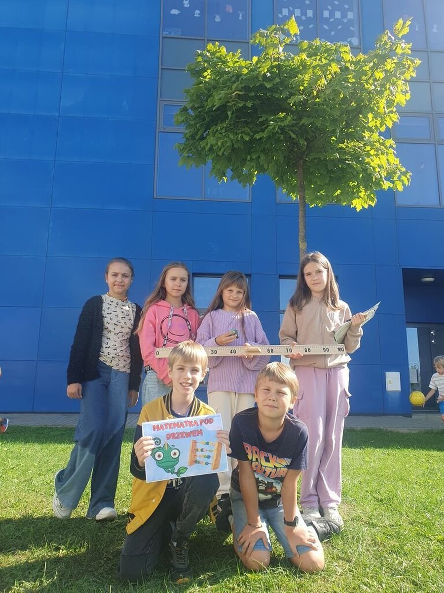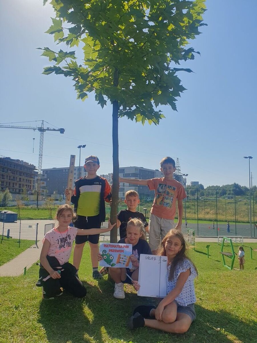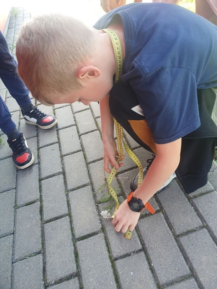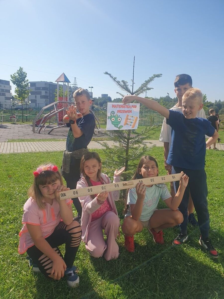 Klasa 3b zrealizowała zadanie pt. „Matematyka pod drzewem” - zadanie polegało na zabawach z miarą, dzięki czemu odkrywaliśmy praktyczną stronę matematyki. Pracując w małych grupach mieliśmy okazję mierzyć liście, trawy, krzewy, małe drzewka, kwiaty, patyczki oraz wiele innych przedmiotów w naszym otoczeniu. Dzięki temu doświadczeniu zrozumieliśmy, jak matematyka może być stosowana w praktyce. Poznawaliśmy różne jednostki miar, ćwiczyliśmy precyzję i dokładność w pomiarach oraz analizowaliśmy wyniki. Podczas wykonywania zadań towarzyszyła nam sylwetka kameleona.