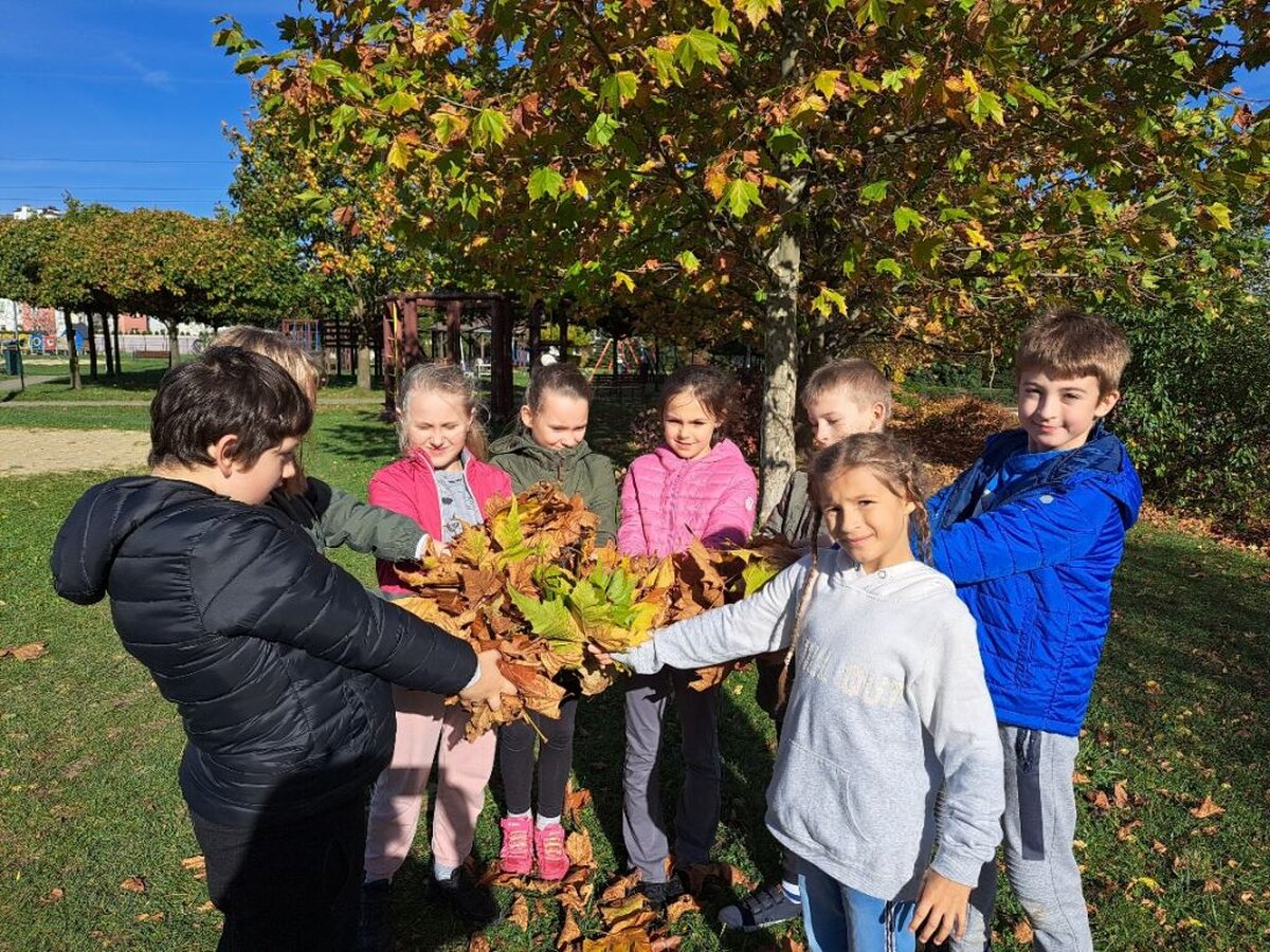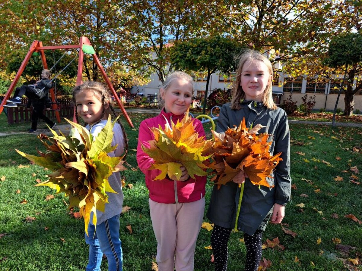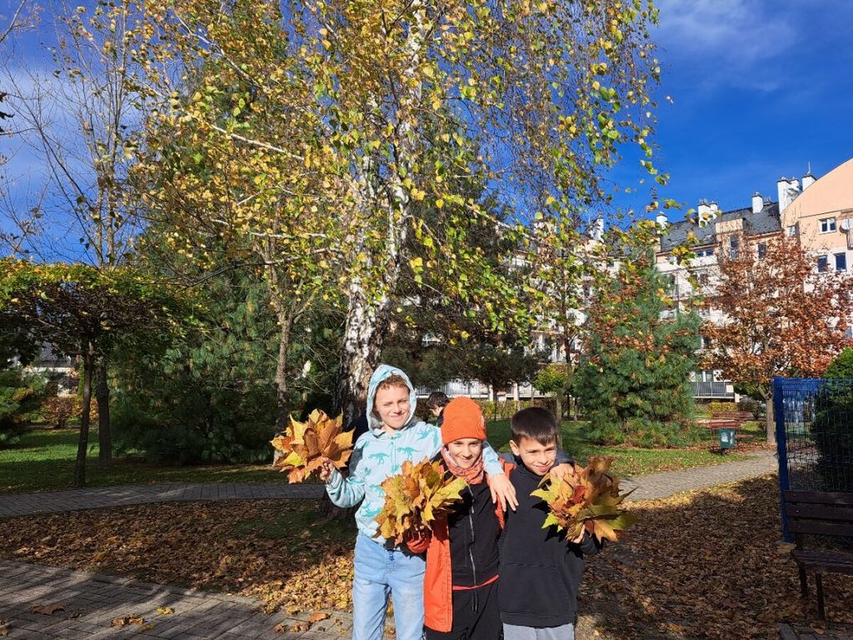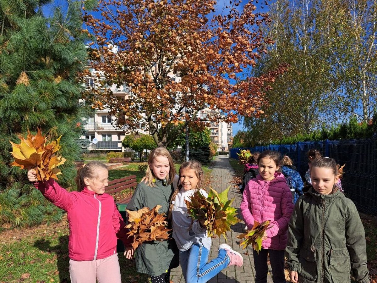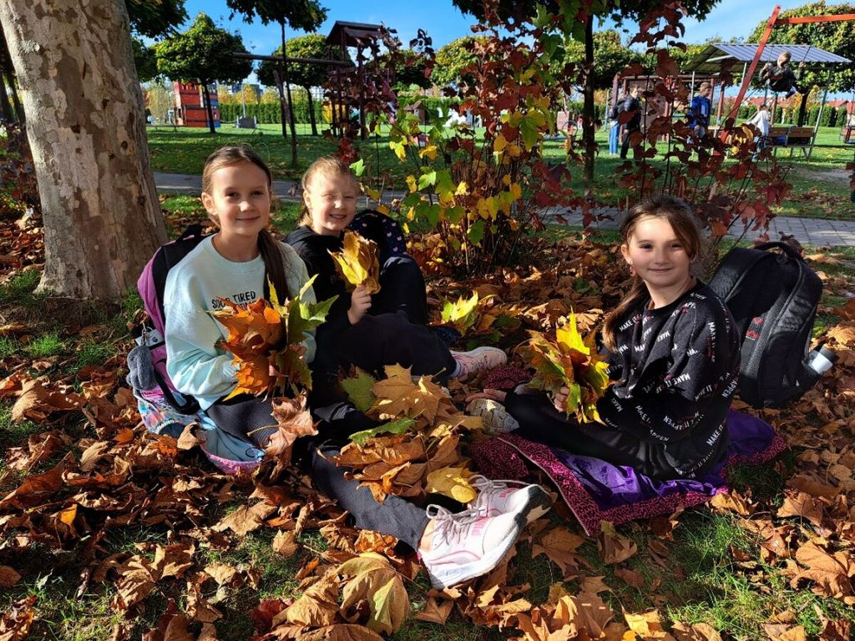 Korzystając z pięknej słonecznej pogody, uczniowie obserwowali zmiany, jakie zachodzą w przyrodzie jesienią. Rozpoznawali wybrane drzewa liściaste i iglaste. Nazywali części drzewa. Poznali rolę drzew w ekosystemie i życiu człowieka. Nie tylko pogoda dopisywała ciekawskim obserwatorom, ale także dobry humor, dlatego śmiało poddali się jesiennym uciechom i zabawom. Do szkoły uczniowie wrócili z pięknymi bukietami kolorowych liści.