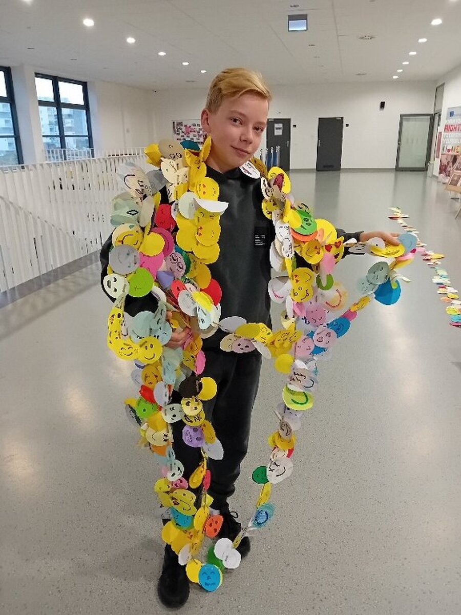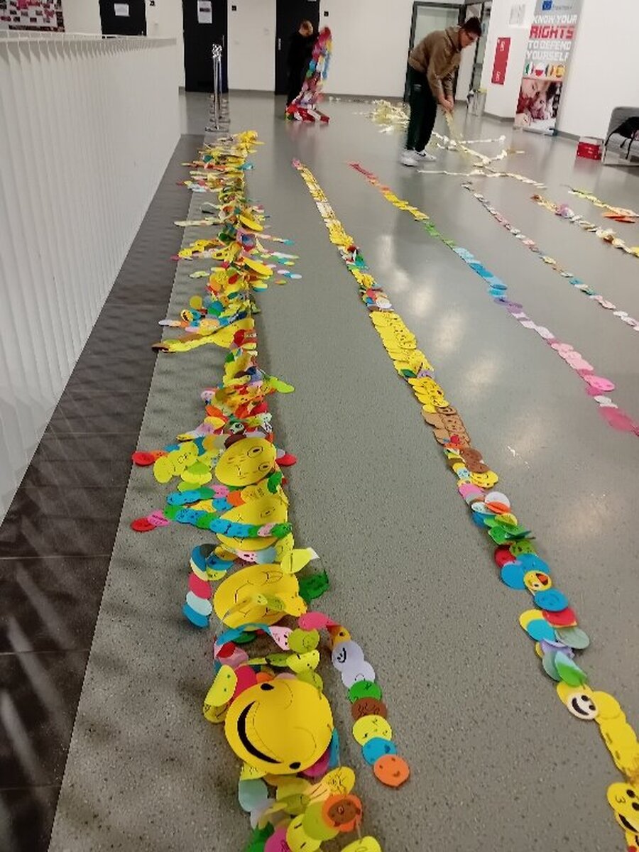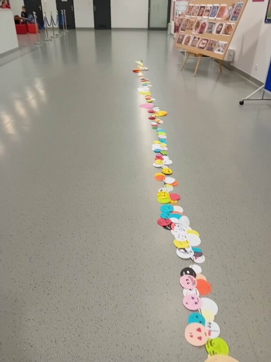 Samorząd Szkolny przygotował z okazji tego ważnego dnia akcję „ Łańcuch Uśmiechu”, polegała ona na wykonaniu przez poszczególne klasy łańcucha z emotek.