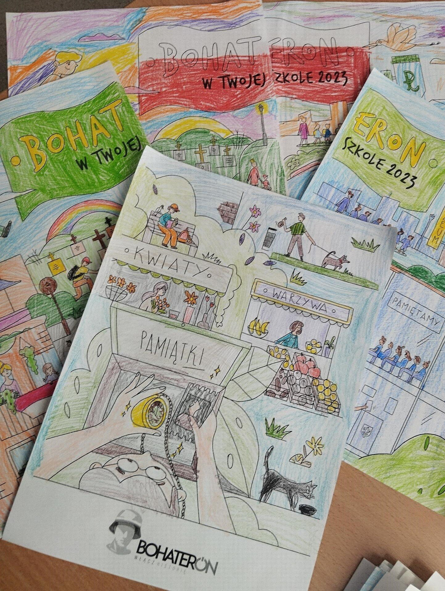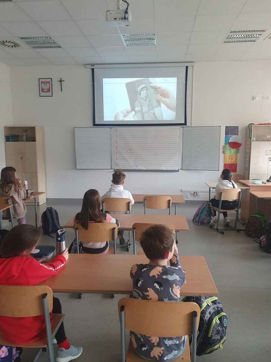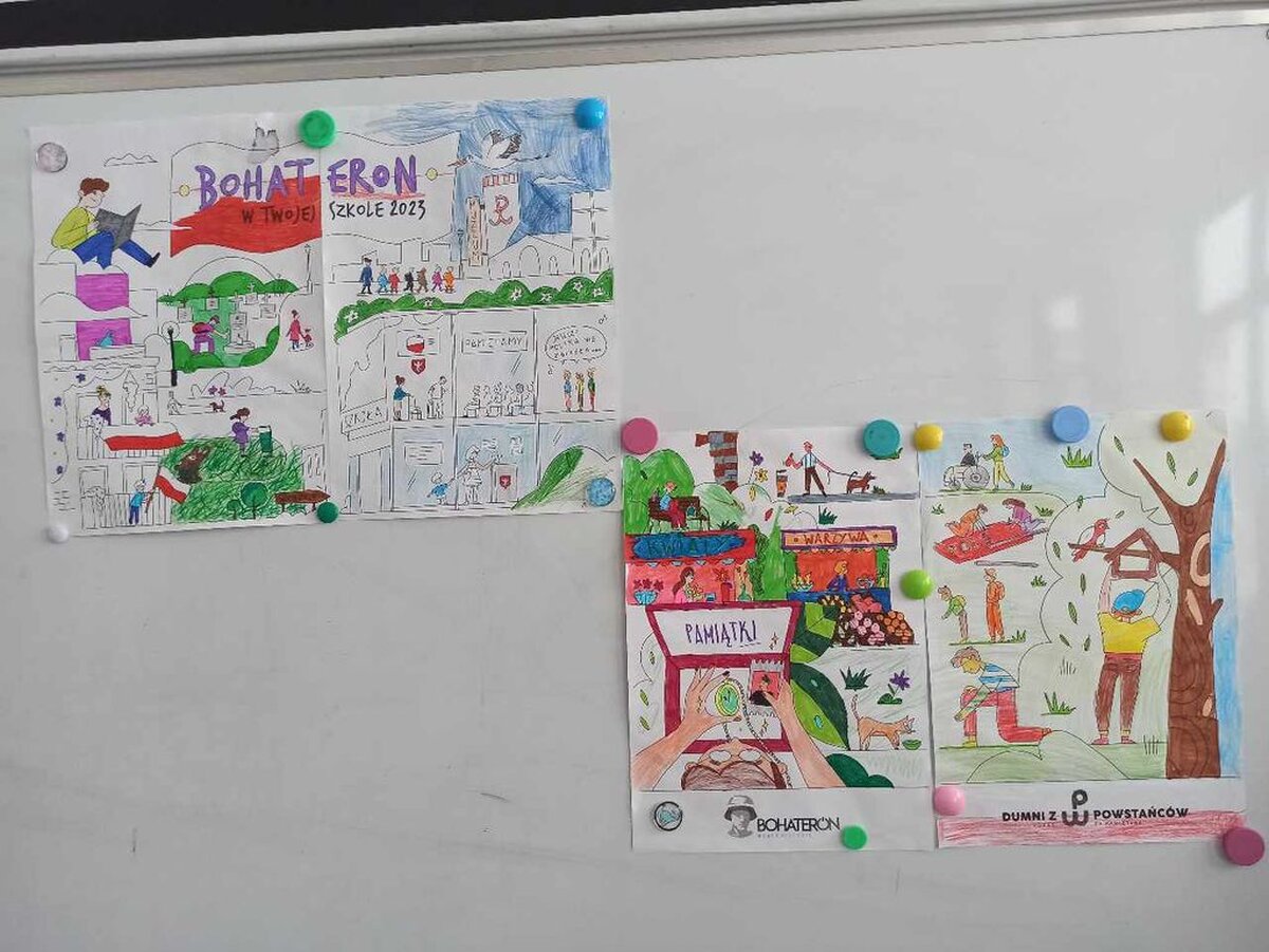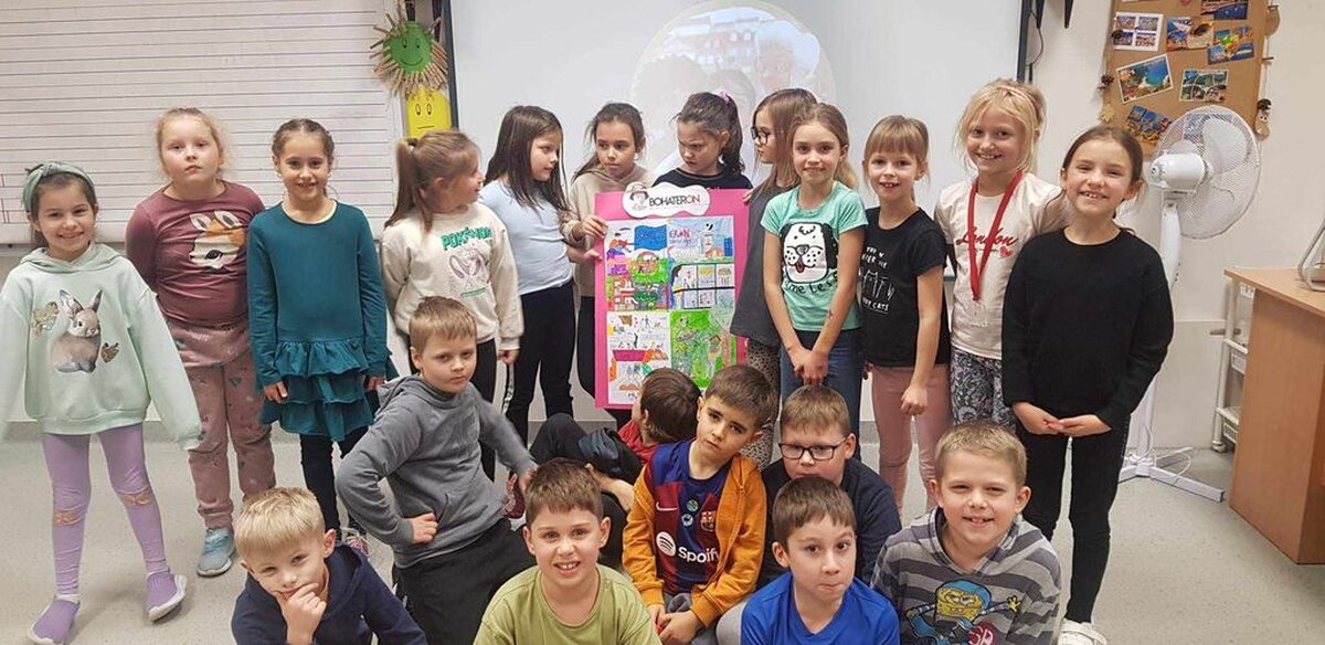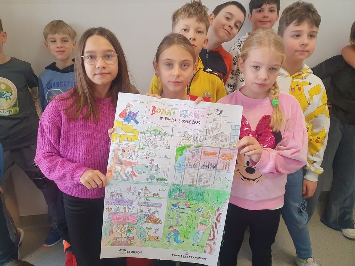 Nasza szkoła przystąpiła do projektu BohaterON w Twojej Szkole. Jest to ogólnopolska kampania mająca na celu upamiętnienie i uhonorowanie uczestników Powstania Warszawskiego oraz promocję historii Polski XX wieku. Zajęcia rozpoczęły się od obejrzenia filmu pt. „Jak zostałem bohaterem”. Jest to opowiadanie Elizy Piotrowskiej, w którym pierwszoosobowym narratorem jest ciekawy świata 8-letni Leon mieszkający w Warszawie. Za pośrednictwem obrazowego i humorystycznego języka najmłodsi uczniowie dowiedzieli się, jak można zostać bohaterem, nawet, gdy nie ma wojny i jest się dzieckiem. Następnie każdy uczeń otrzymał fragment kolorowanki na podstawie tegorocznego plakatu akcji BohaterON w Twojej Szkole. Plakat przedstawiał kilkanaście sytuacji – przykładów zachowań dzieci i dorosłych, którzy kochają swój kraj i o niego dbają.