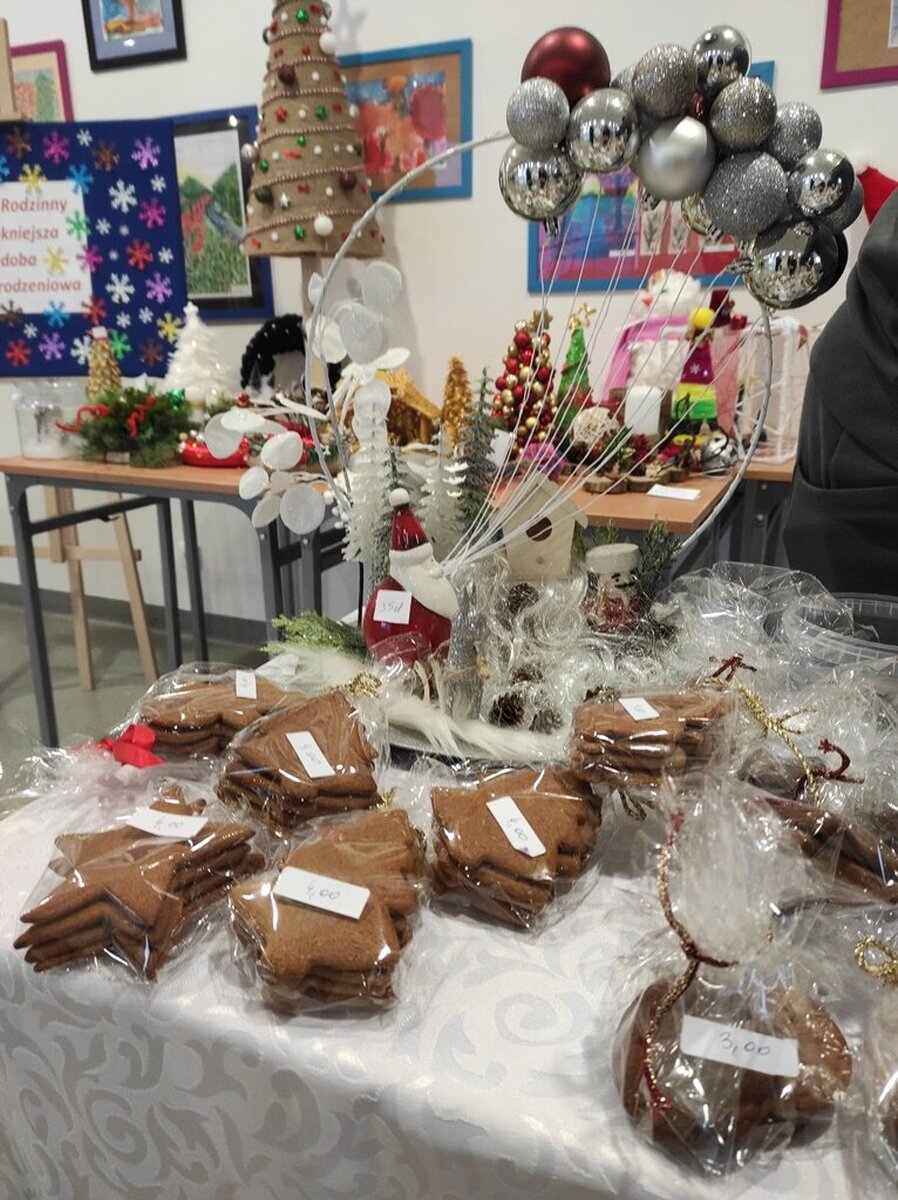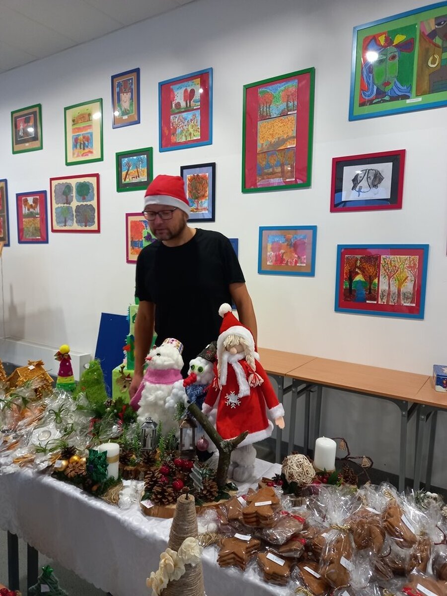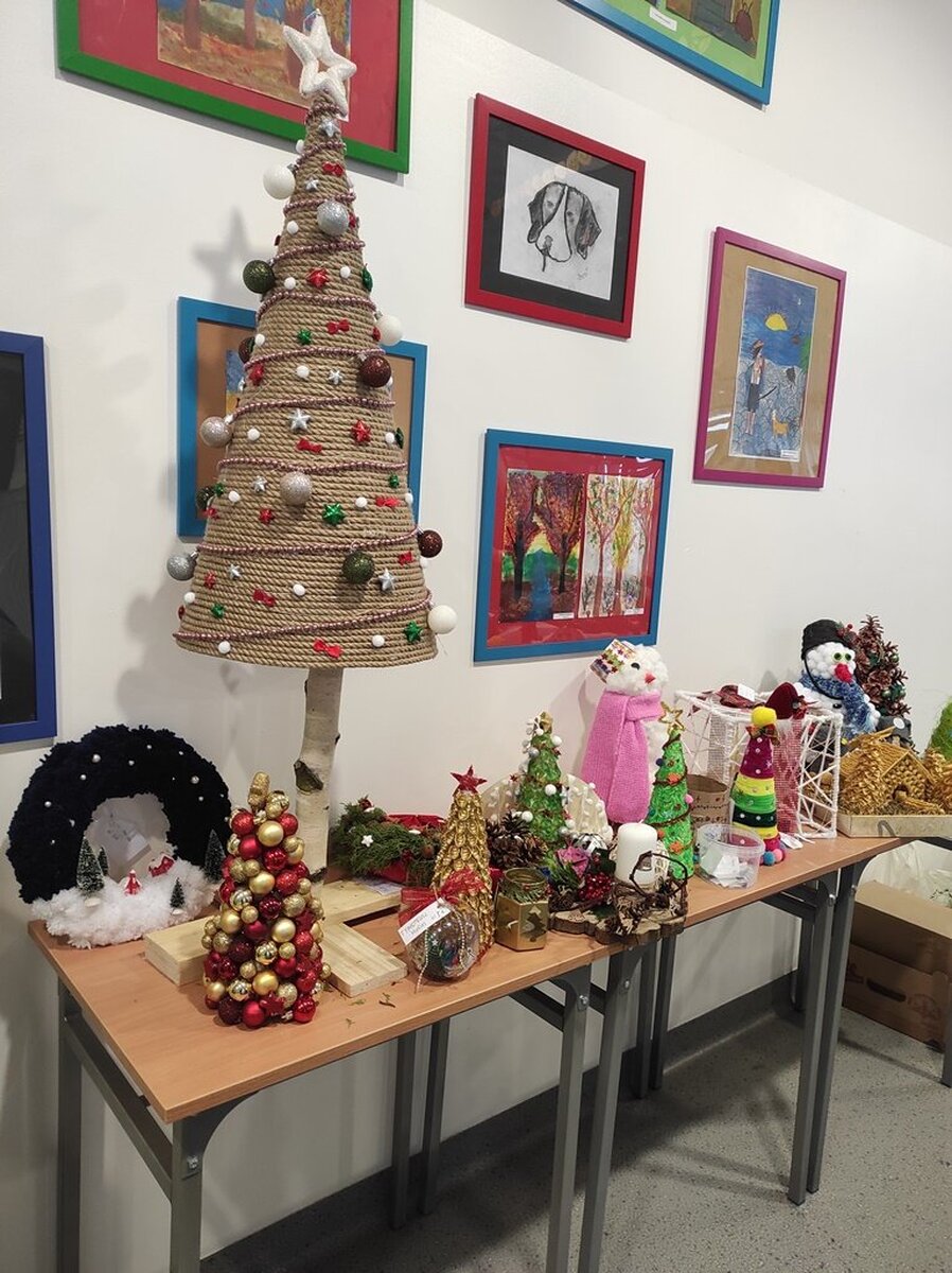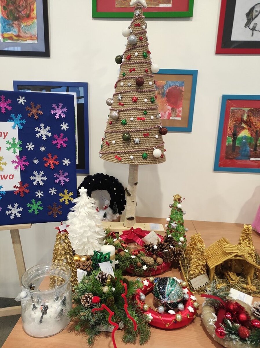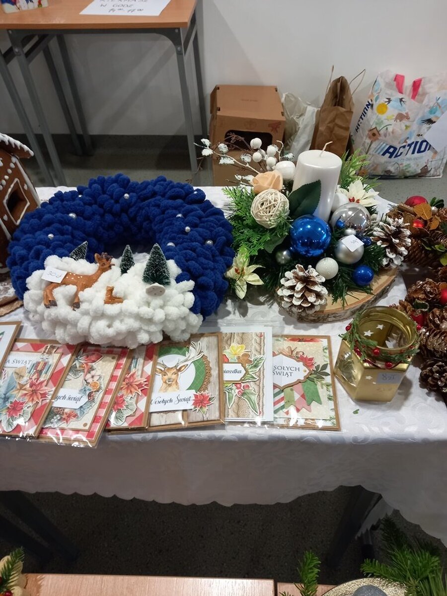 Przed świętami Bożego Narodzenia w naszej szkole zorganizowano kiermasz świąteczny. Znalazło się na nim świąteczne rękodzieło takie jak: aniołki, choinki, bombki, gwiazdki, stroiki, kartki świąteczne i wiele innych niezwykłych prac. Były to wyjątkowe dekoracje, które przystroją choinkę, świąteczny stół czy mieszkanie. Kolorowe i błyszczące ozdoby wykonane były pod okiem wychowawców świetlicy szkolnej i zachęcały do oglądania i zakupu.