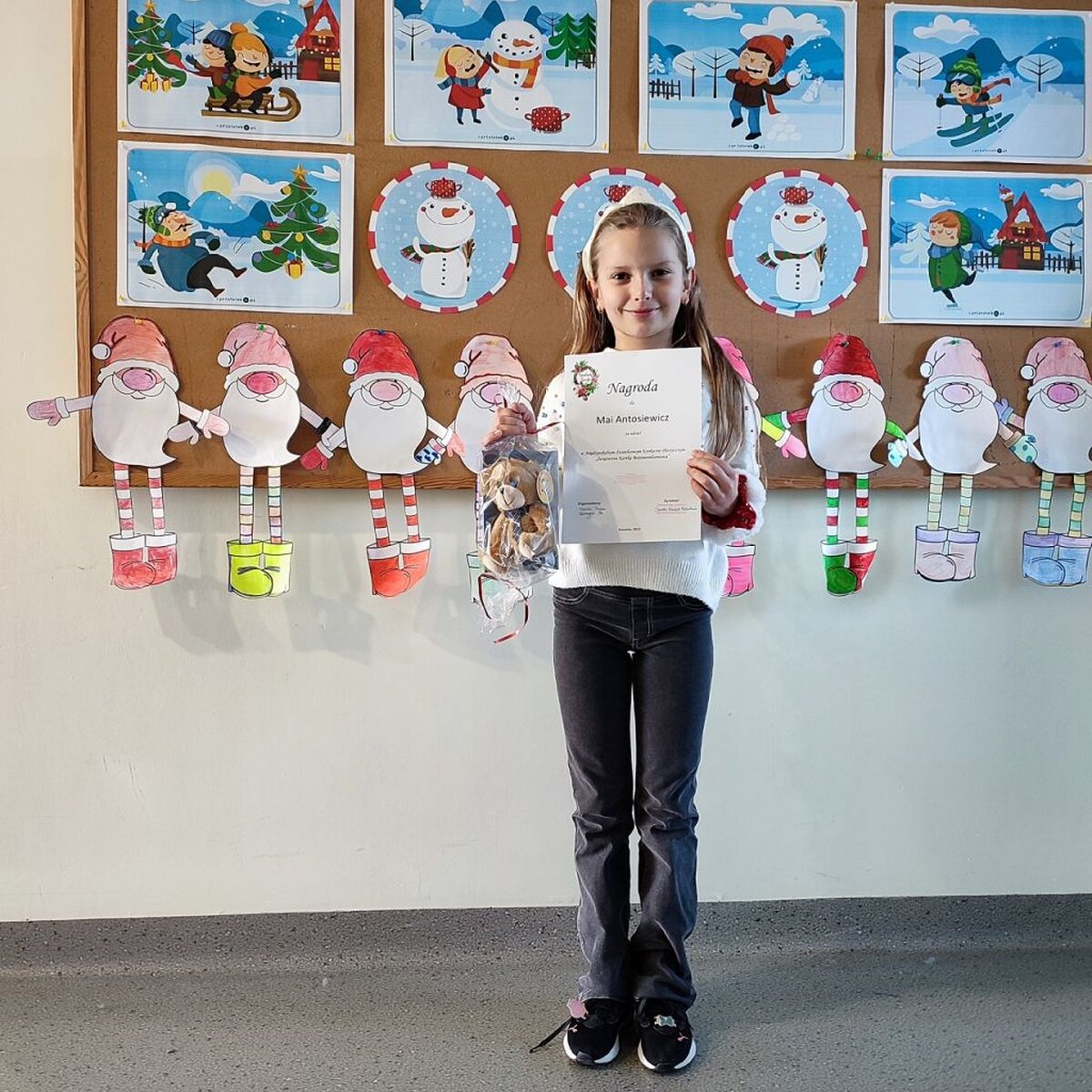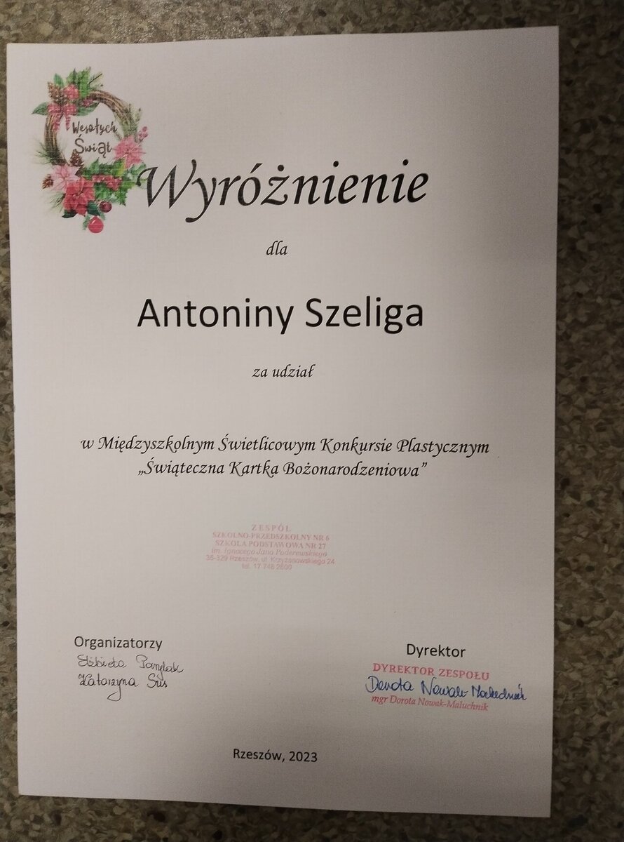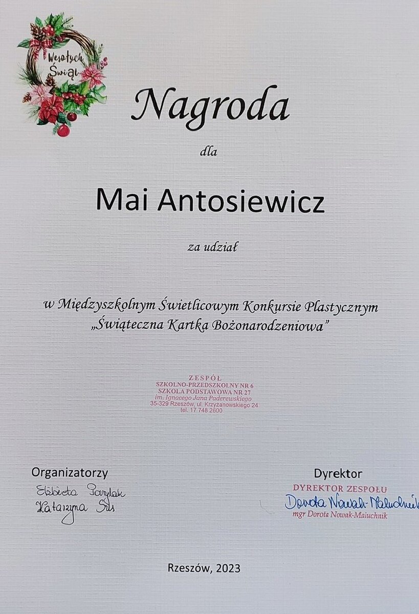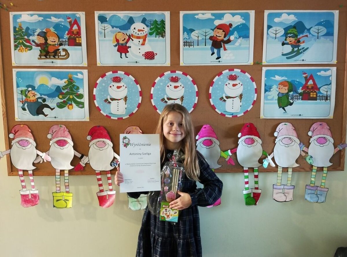 Miło nam poinformować, że w międzyszkolnym konkursie plastycznym: „Świąteczna Kartka Bożonarodzeniowa” zorganizowanym przez Szkołę Podstawową nr 27 w Rzeszowie nasze uczennice: Maja Antosiewicz z klasy 3c otrzymała nagrodę oraz Antonina Szeliga z klasy 2a otrzymała wyróżnienie. Celem konkursu było rozwijanie twórczości dziecięcej, wyzwalanie inwencji twórczej oraz kultywowanie tradycji związanych ze świętami chrześcijańskimi.