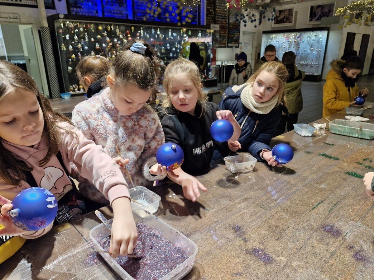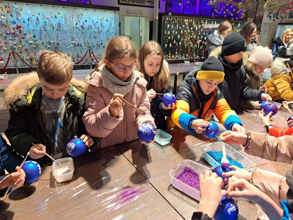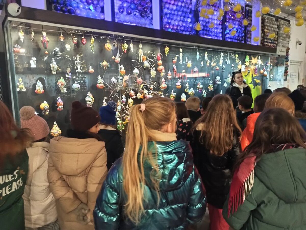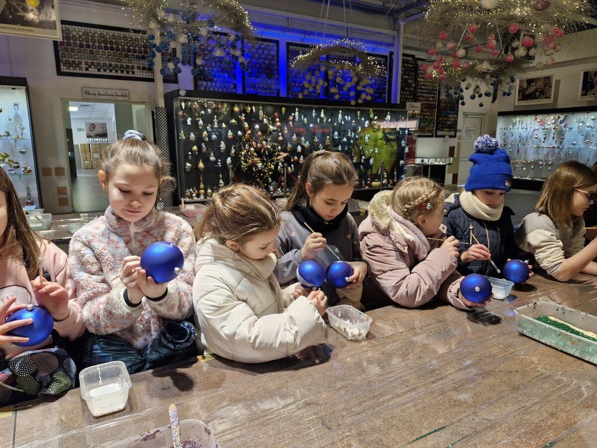 Pod opieką pani przewodnik uczniowie oglądali stanowiska z choinkami i bombkami z różnych części świata i epok (styl amerykański, wiktoriański, francuski, norweski, staropolski). Obejrzeli również cały proces wyrobu ozdób choinkowych, w czasie którego pracownik fabryki nad palnikiem ogniowym rozgrzewał szkło a następnie wydmuchiwał okrągłe bańki.