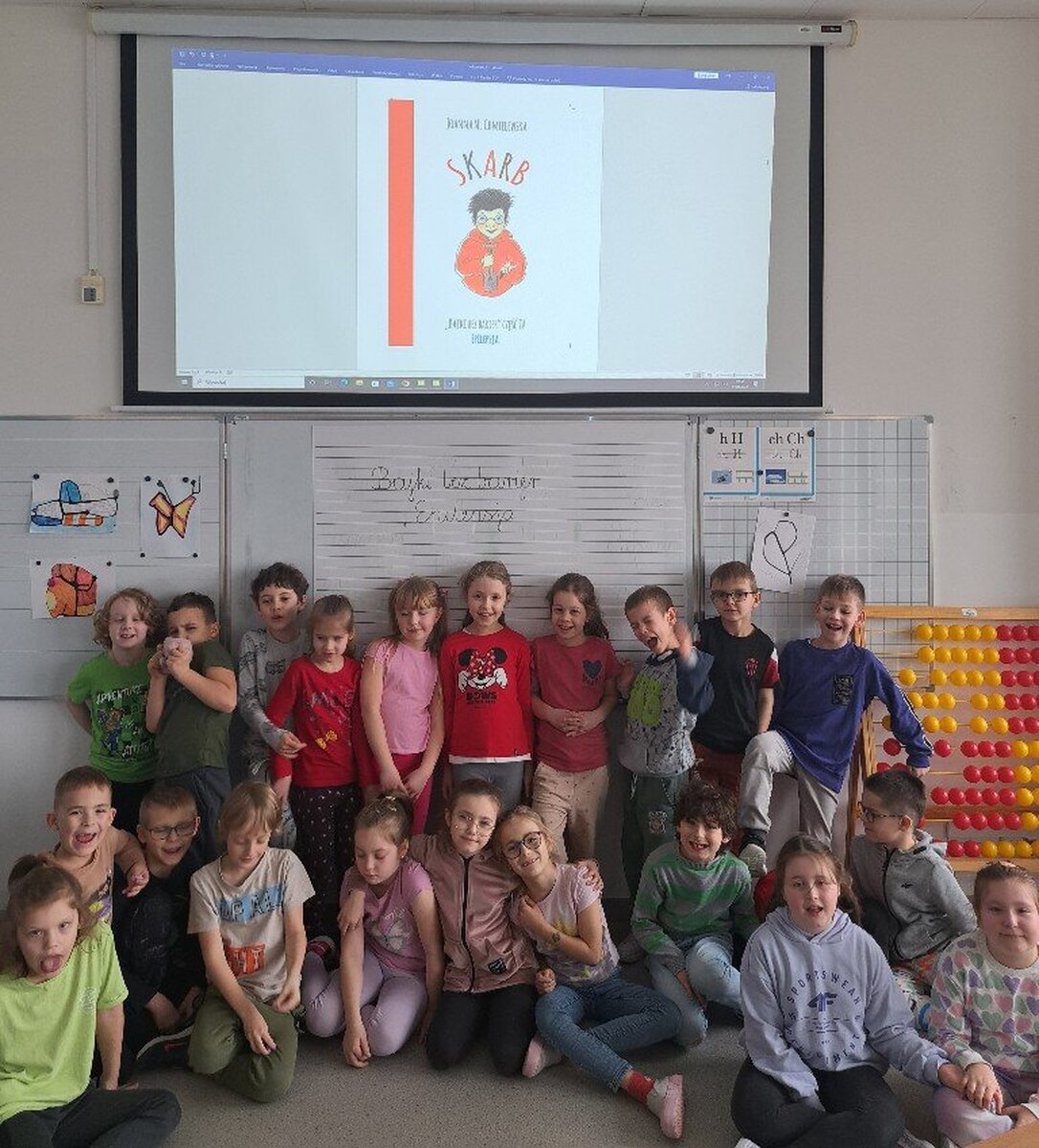 Uczniowie klasy 1e w ramach projektu BAJKI BEZ BARIER wysłuchali bajkę pt. „Skarb” . Jest to bajka psychoedukacyjna, która przybliża dzieciom w wieku szkolnym specyfikę funkcjonowania dziecka z epilepsją. Bohaterami bajki są: Kamil – chłopiec chorujący na epilepsję oraz Michał, który poznaje Kamila przede wszystkim jako nowego kolegę, z głową pełną ciekawych pomysłów, świetnego towarzysza zabawy. W czasie jednej z zabaw Kamil przechodzi atak padaczkowy. Michał wzywa na pomoc jego mamę, która zabezpiecza syna przed urazem w czasie drgawek. Uspokaja także Michała, wystraszonego nieoczekiwanym widokiem. Objaśnia mu, na czym polega problem Kamila, oswajając Michała ze światem syna i jego choroby. Najważniejsze, że nie przeszkadza ona chłopcom w podtrzymaniu znajomości. Michał otwarcie mówi o swojej reakcji, Kamil i jego mama otwarcie opowiadają o problemie i o tym, jak należy zachować się widząc osobę w ataku epileptycznym.