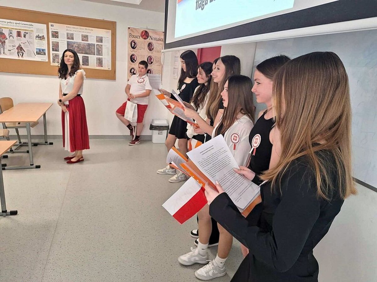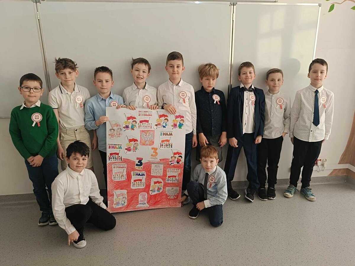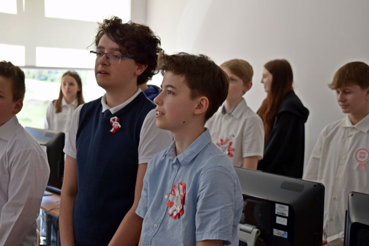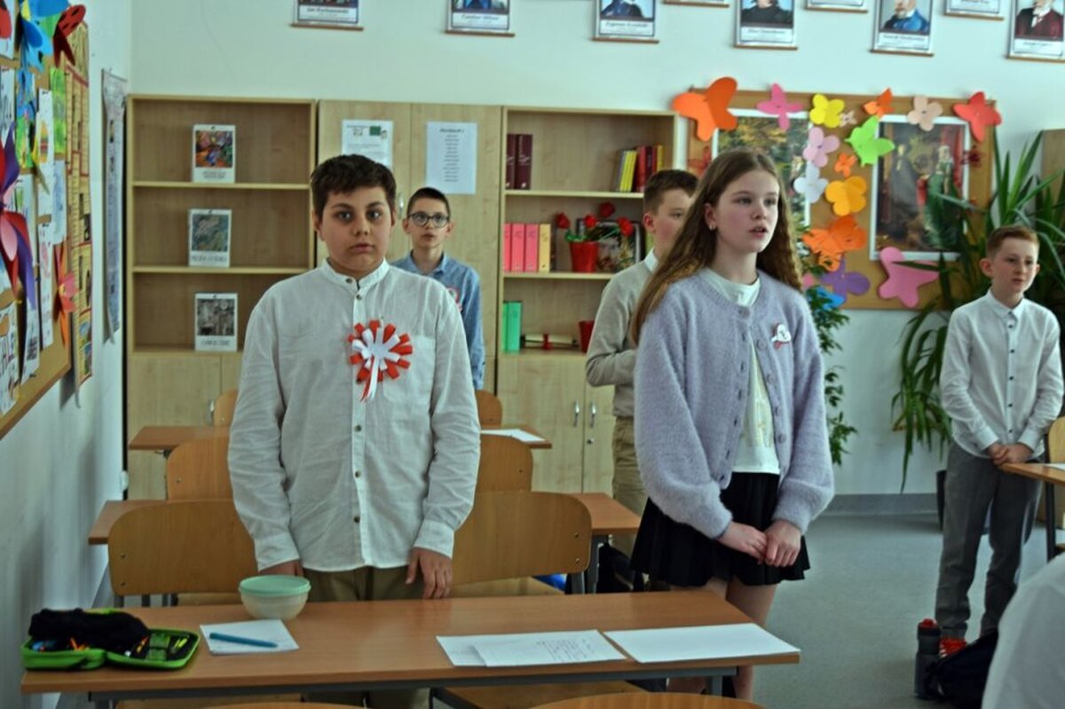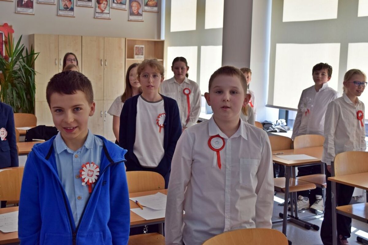 W ten dzień nie zabrakło gratulacji dla zwycięzców w konkursie literackim, który był poświęcony Aleksandrowi Fredrze. Oczy uczniów cieszyła wystawa prac dotyczących ważnych postaci z narodowej historii, zaś uszy szereg pieśni patriotycznych, które można było posłuchać w głównym holu szkoły. Oczywiście wśród utworów muzycznych nie zabrakło również tego najważniejszego - Mazurka Dąbrowskiego. Hymn cała społeczność szkolna odśpiewała dokładnie o godz. 12.00.