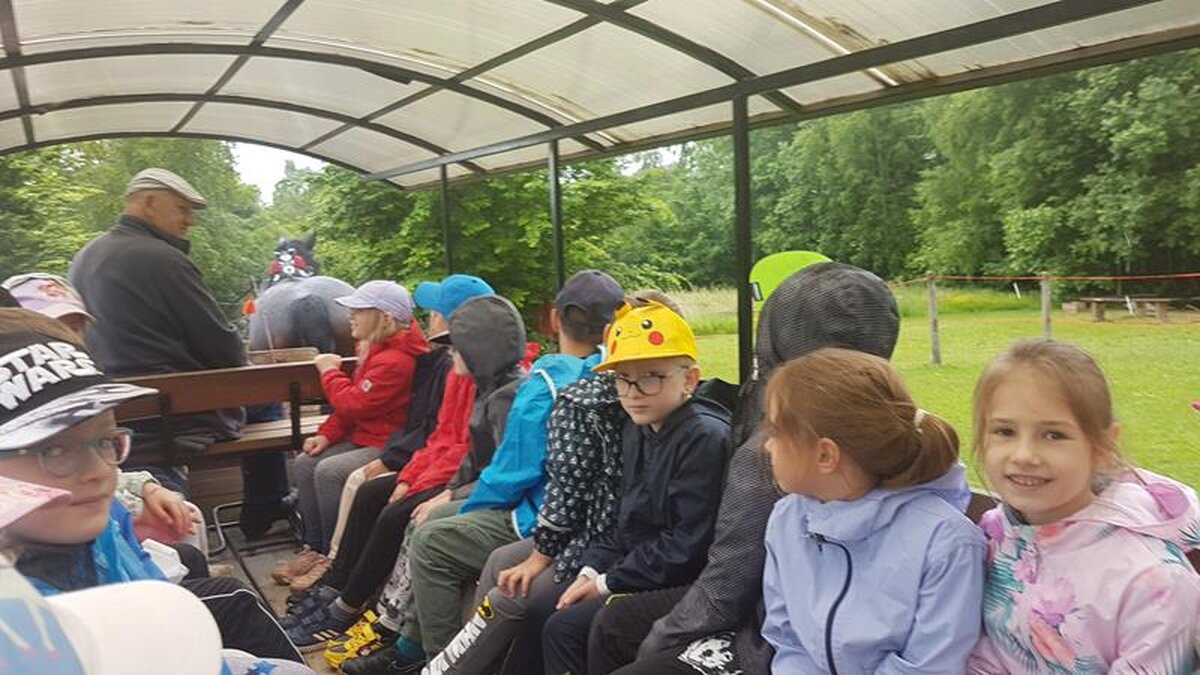 Mimo niepewnej pogody, 23 maja uczniowie klas 1c oraz 2b wybrali się na wycieczkę do Zagrody Edukacyjnej „SZMER” w Godowej. Celem wyjazdu była integracja zespołów klasowych oraz ukazanie dzieciom piękna polskiej wsi i korzyści, jakie płyną z uprawiania ziemi, hodowli zwierząt, a także kształtowanie poczucia więzi z najbliższym środowiskiem i regionem. W czasie pobytu dzieci poznawały różne zwierzęta gospodarstwa domowego: kozy, owce, kury, króliki i konie. Kontakt ten dostarczył wielu niezapomnianych przeżyć, wzruszeń i radości. Największą popularnością cieszyło się karmienie kozy Klary. Wiele radości sprawiło też sadzenie pomidorów koktajlowych do doniczek. Tak przygotowane sadzonki dzieci zabrały ze sobą do dalszej pielęgnacji w domu. Odwiedziły również domek, w którym Św. Mikołaj odpoczywa latem. Dowiedziały się skąd pochodzi wełna i co można z niej zrobić. Samodzielnie wykonały pamiątkowe owieczki z włóczki. Miłą niespodzianką okazała się także przejażdżka bryczką. Dzieci miały również czas na swobodne gry i zabawy na świeżym powietrzu. Spośród wielu dyscyplin każdy mógł wybrać coś dla siebie: spacer na płozach, pranie w łowienie drewnianych ryb, jazdę wózkami lub przeciąganie liny.