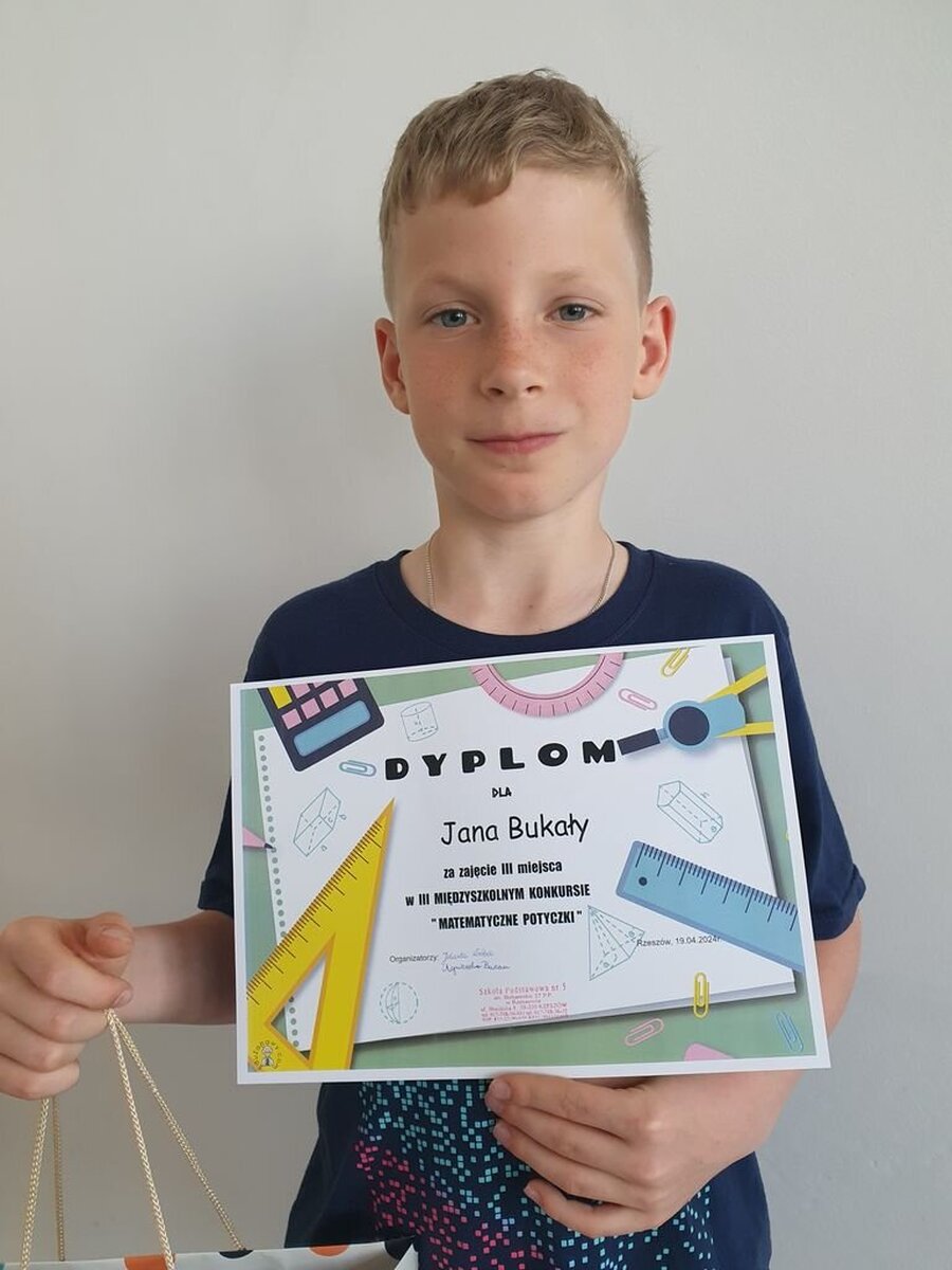 Z ogromną przyjemnością informujemy, że uczeń naszej szkoły- Jan Bukała z klasy 3b zajął III miejsce w międzyszkolnym konkursie „Potyczki Matematyczne”. Organizatorem konkursu była Szkoła Podstawowa nr 5 w Rzeszowie. W tegorocznej, trzeciej edycji konkursu wzięło udział 36 uczniów z 12 rzeszowskich szkół podstawowych. Gratulujemy Jankowi wysokiej lokaty i życzymy dalszych sukcesów!