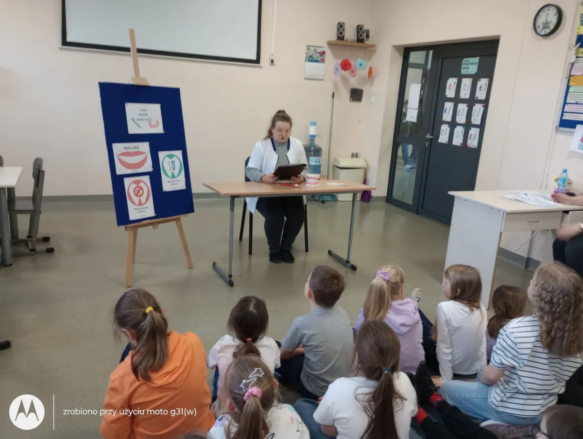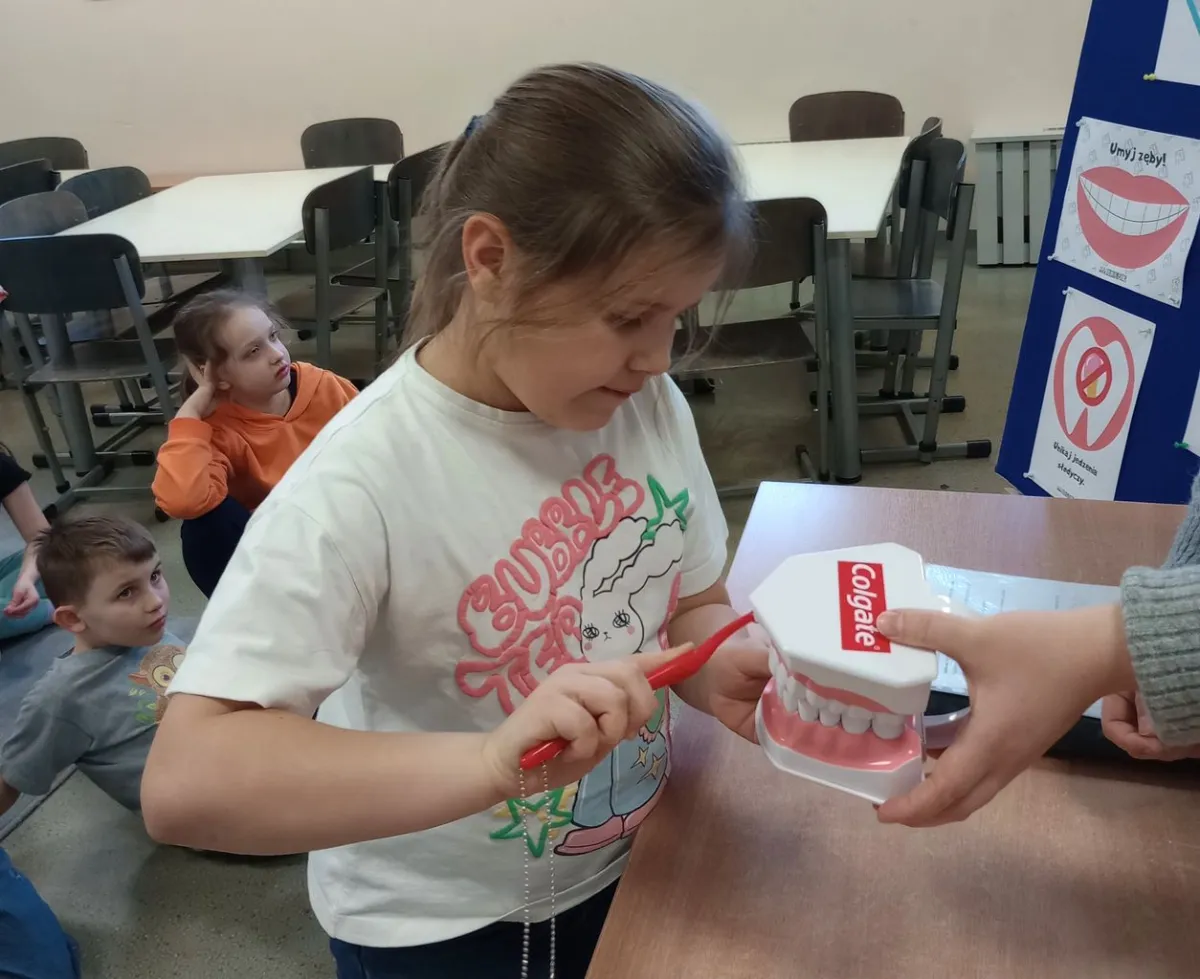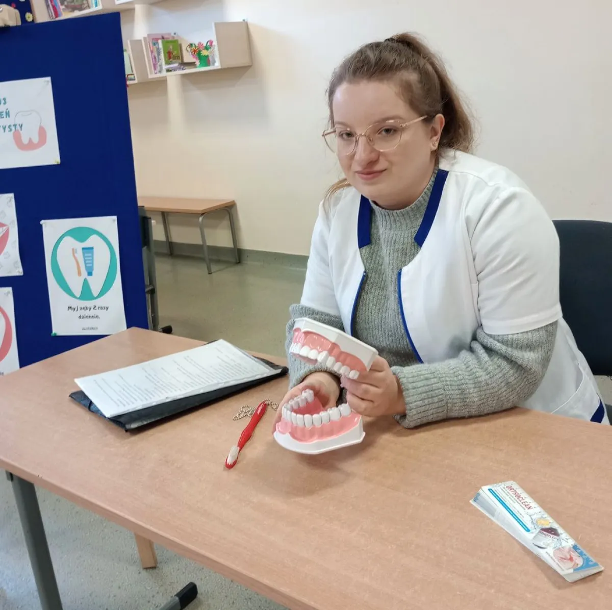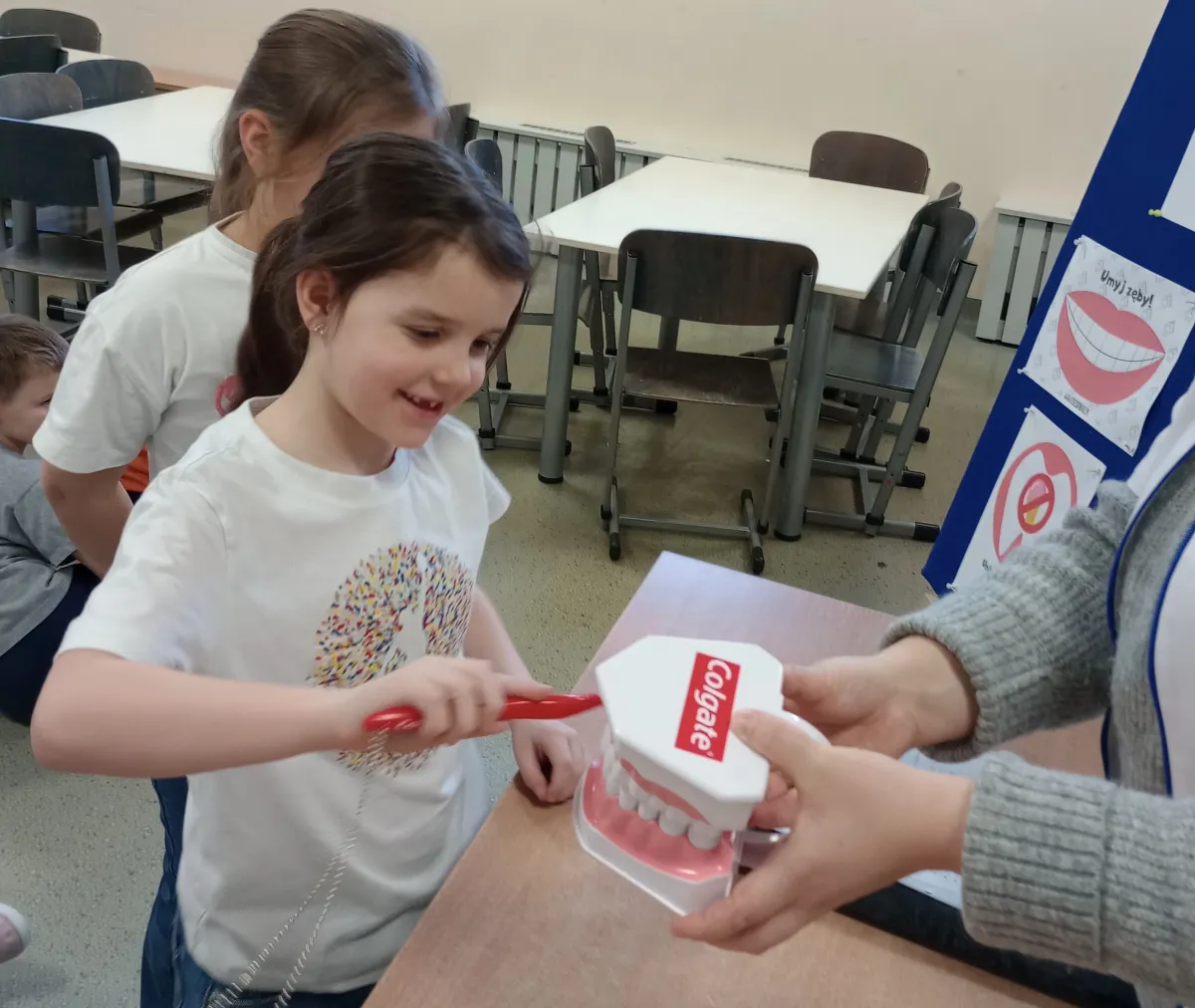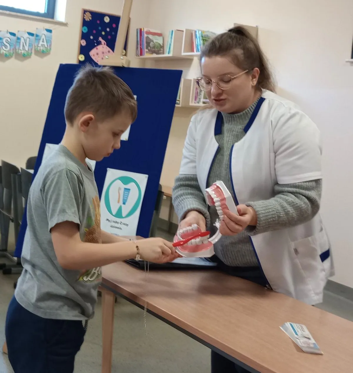 Z okazji Dnia Dentysty, który przypada 5 marca, odwiedziła świetlicę p. Justyna Maśnik-pielęgniarka szkolna. W spotkaniu wzięli udział uczniowie z kl.1b. Pani pielęgniarka opowiedziała dzieciom jak dbać o zęby, jaka jest ich budowa oraz przybliżyła specyfikę zawodu dentysty. Zapoznała dzieci z zasadami właściwego szczotkowania zębów i dbania o higienę jamy ustnej. Pani Justyna uwrażliwiła uczniów na potrzebę spożywania owoców, warzyw i produktów mlecznych, które są zdrowe dla zębów oraz o konieczności unikania słodyczy, które powodują próchnicę. Dzieci aktywnie uczestniczyły w spotkaniu, chętnie dzieliły się swoją wiedzą i doświadczeniem. Na koniec wizyty gościa, dzieci mogły poćwiczyć prawidłową technikę szczotkowania górnej i dolnej szczęki na modelu zębów.