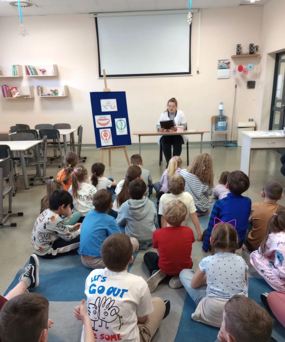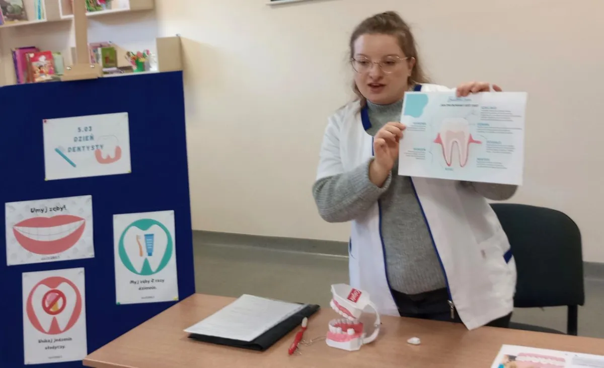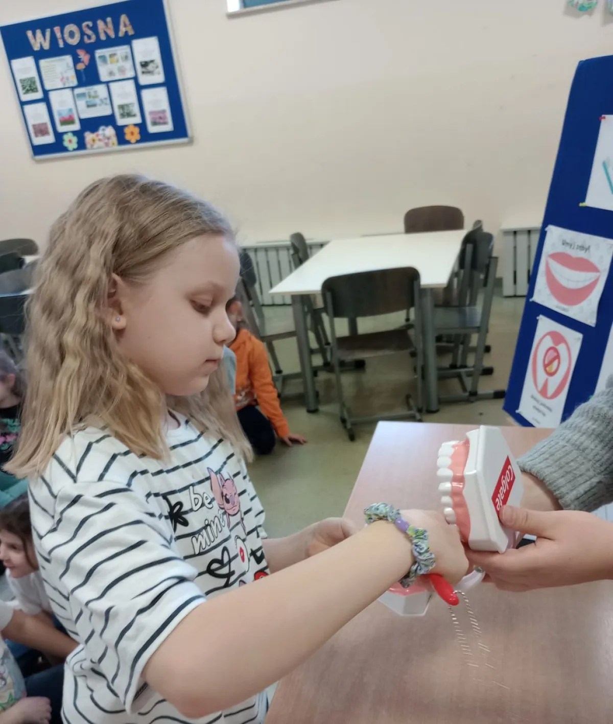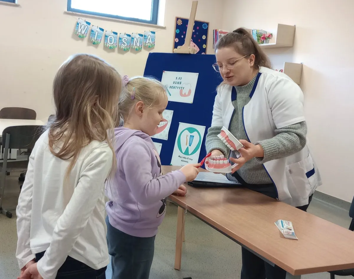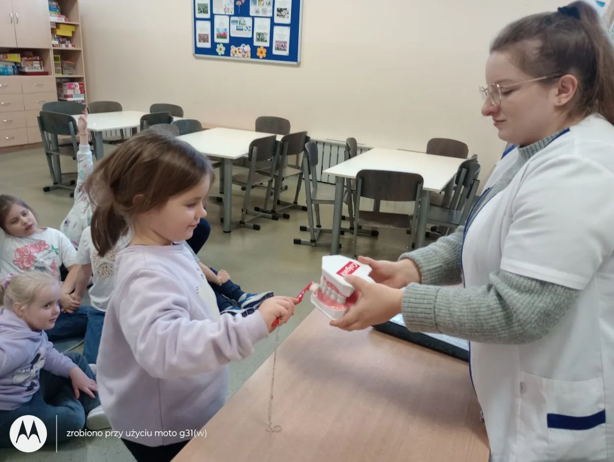 Z okazji Dnia Dentysty, który przypada 5 marca, odwiedziła świetlicę p. Justyna Maśnik-pielęgniarka szkolna. W spotkaniu wzięli udział uczniowie z kl.1b. Pani pielęgniarka opowiedziała dzieciom jak dbać o zęby, jaka jest ich budowa oraz przybliżyła specyfikę zawodu dentysty. Zapoznała dzieci z zasadami właściwego szczotkowania zębów i dbania o higienę jamy ustnej. Pani Justyna uwrażliwiła uczniów na potrzebę spożywania owoców, warzyw i produktów mlecznych, które są zdrowe dla zębów oraz o konieczności unikania słodyczy, które powodują próchnicę. Dzieci aktywnie uczestniczyły w spotkaniu, chętnie dzieliły się swoją wiedzą i doświadczeniem. Na koniec wizyty gościa, dzieci mogły poćwiczyć prawidłową technikę szczotkowania górnej i dolnej szczęki na modelu zębów.